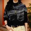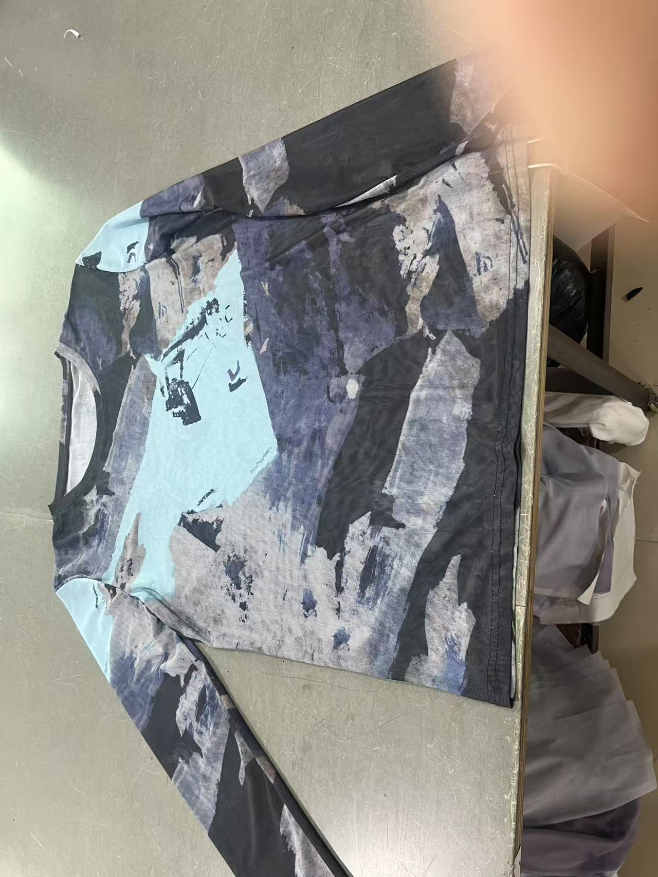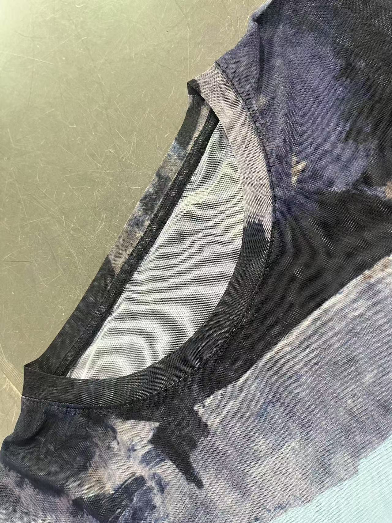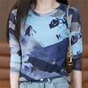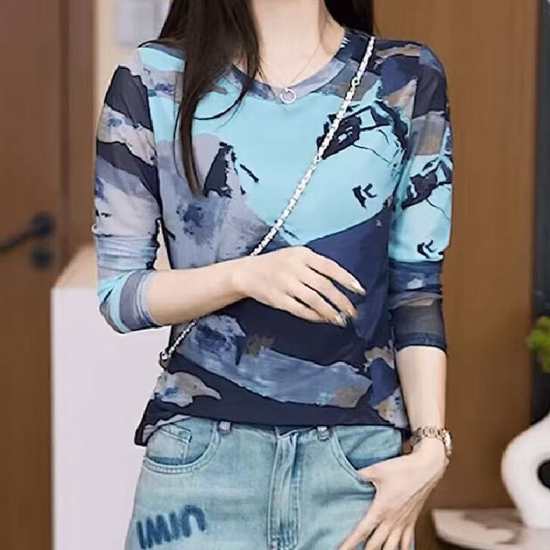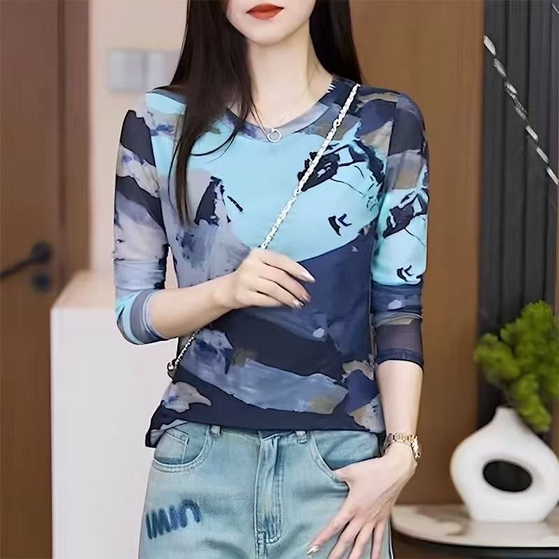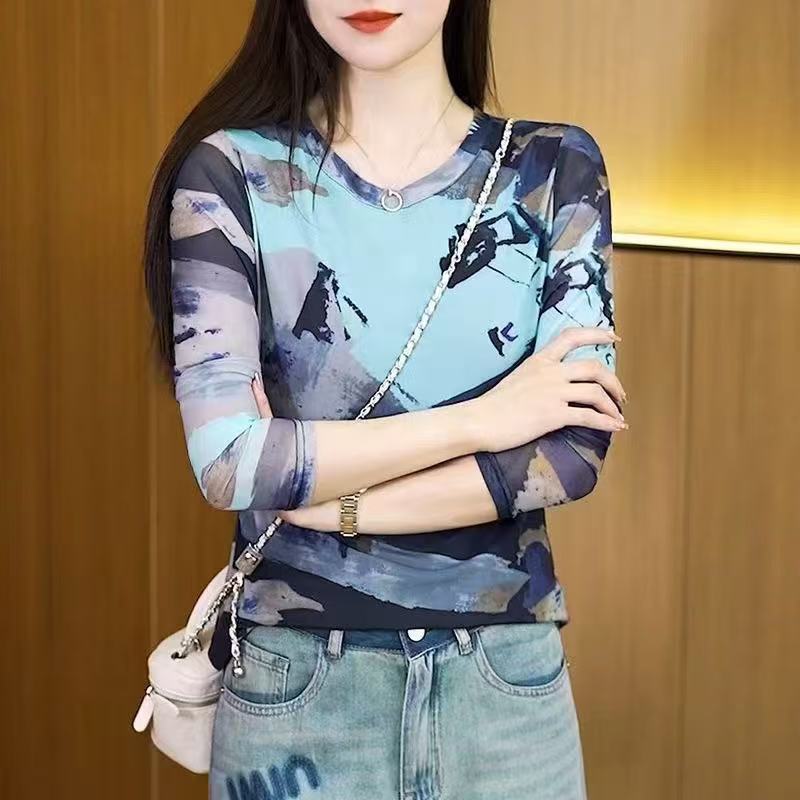 2025 Primavera y Otoño Diseño Delgado Ajustado Elástico Camiseta Estampada Digitalmente para Mujer Estilo Europeo y Americano Camiseta Básica de Malla