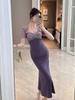 2026 Nuevo Vestido Largo de Verano para Mujer con Cuadrado Francés, Encaje Empalmado, Ajustado, Cola de Pez 21670