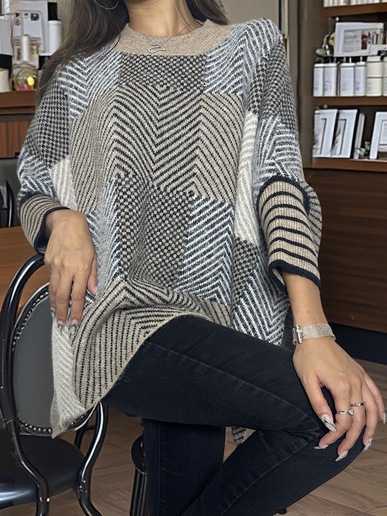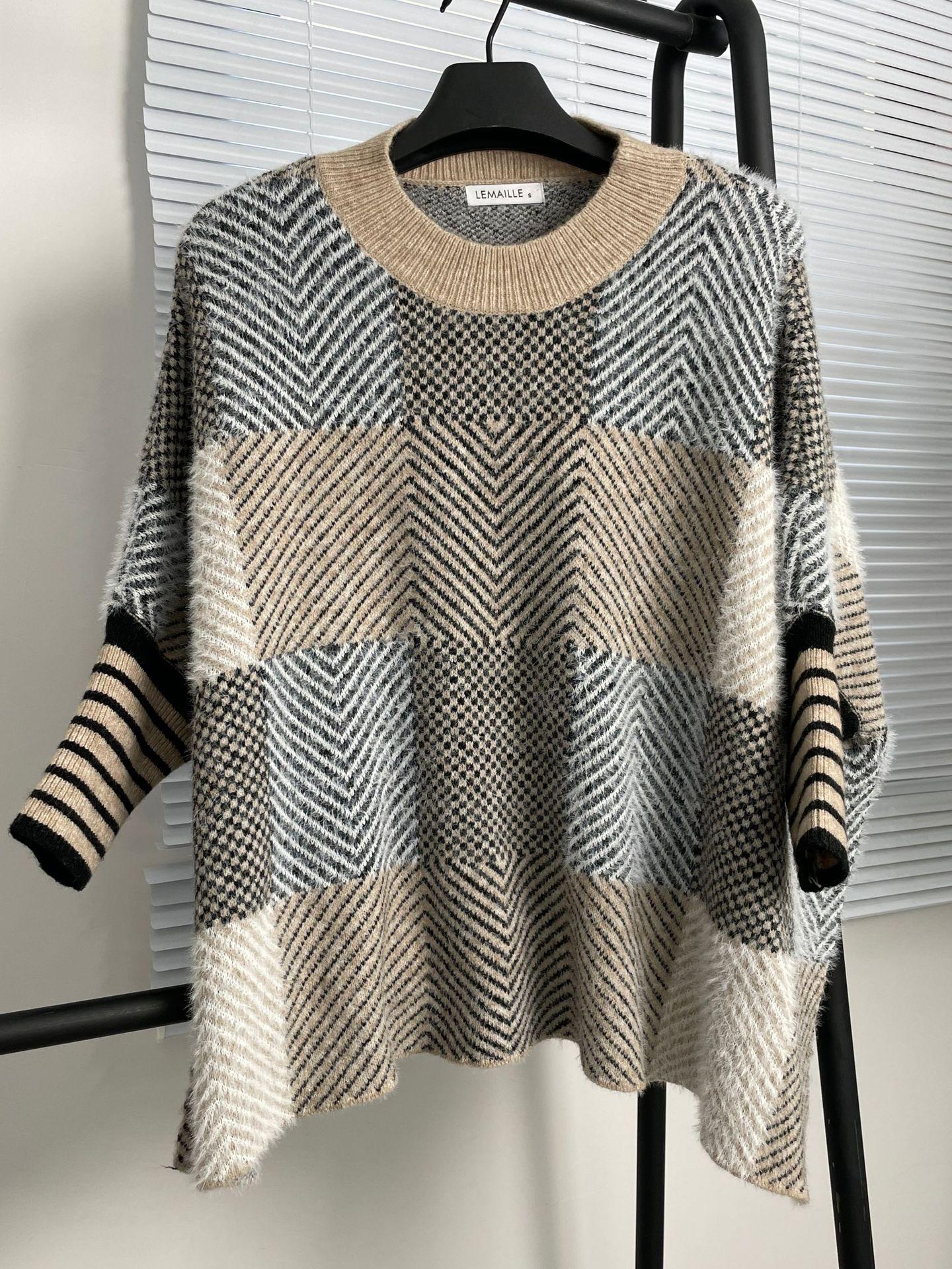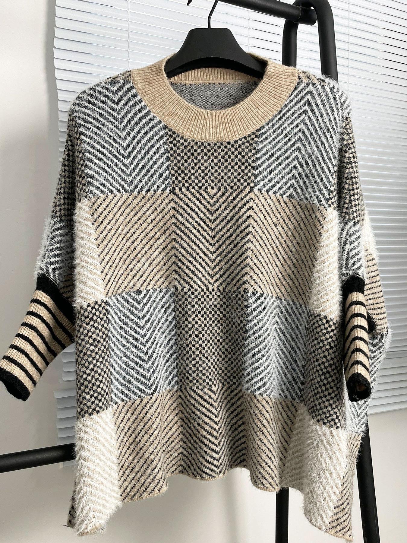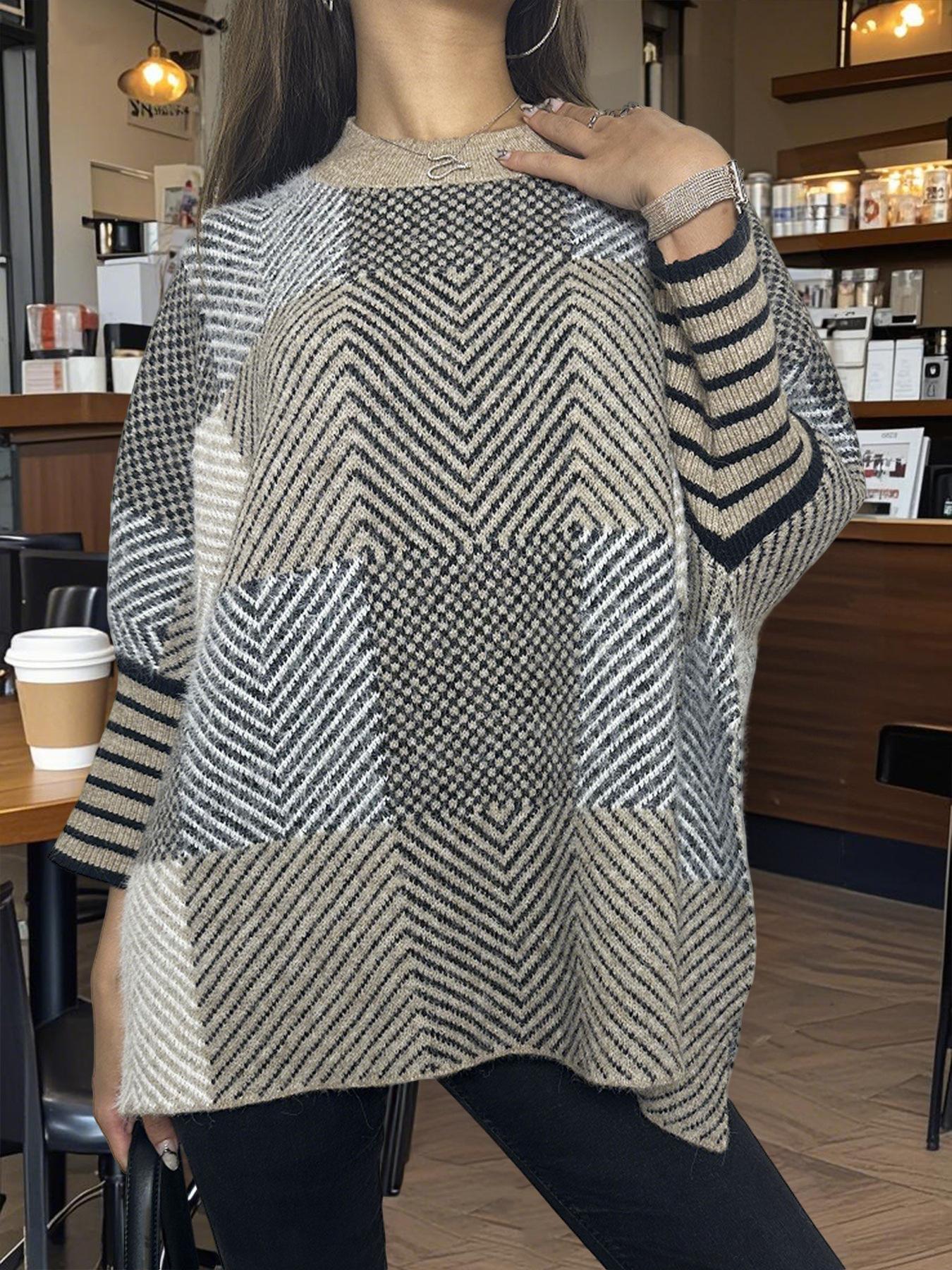 Otoño e Invierno Nuevo Suéter de Punto Europeo y Americano Transfronterizo de Manga Murciélago a Cuadros Largo Holgado Versátil Top Jersey para Mujer