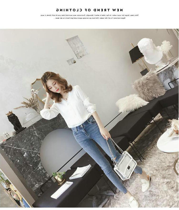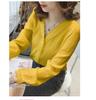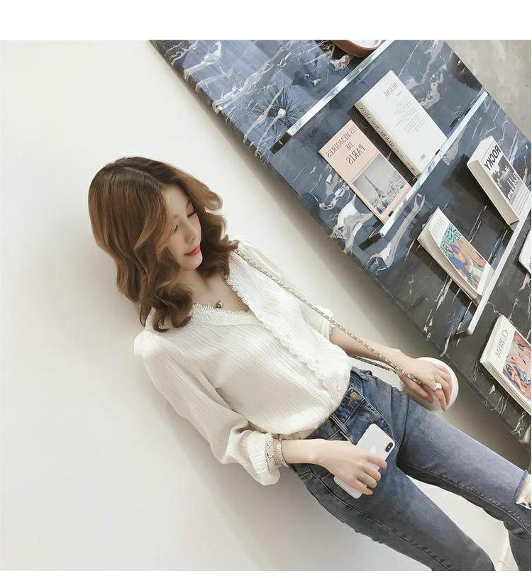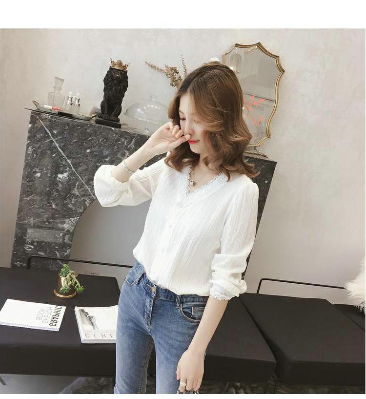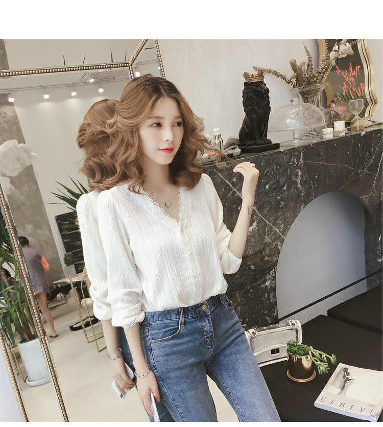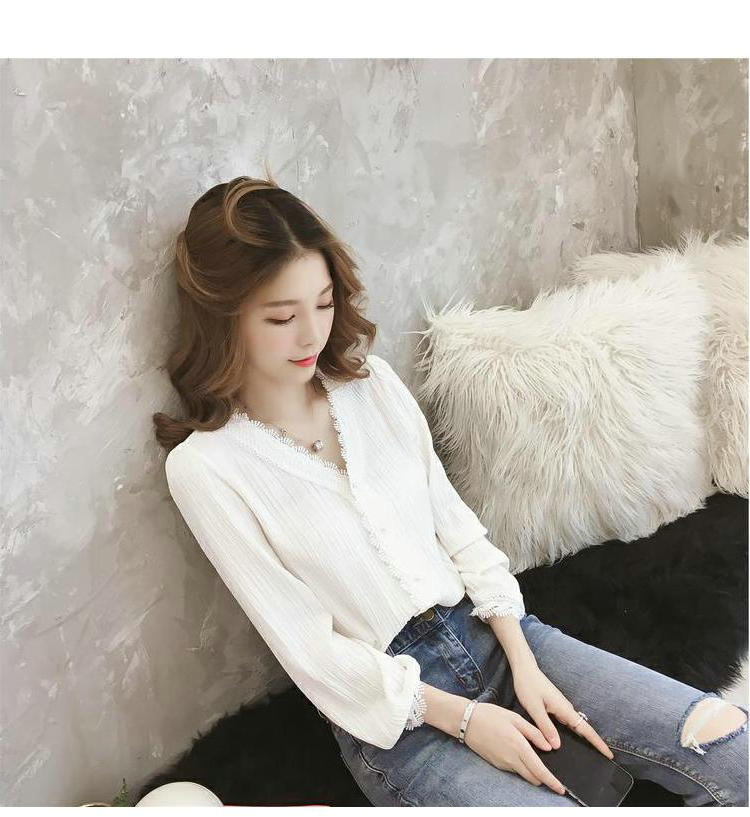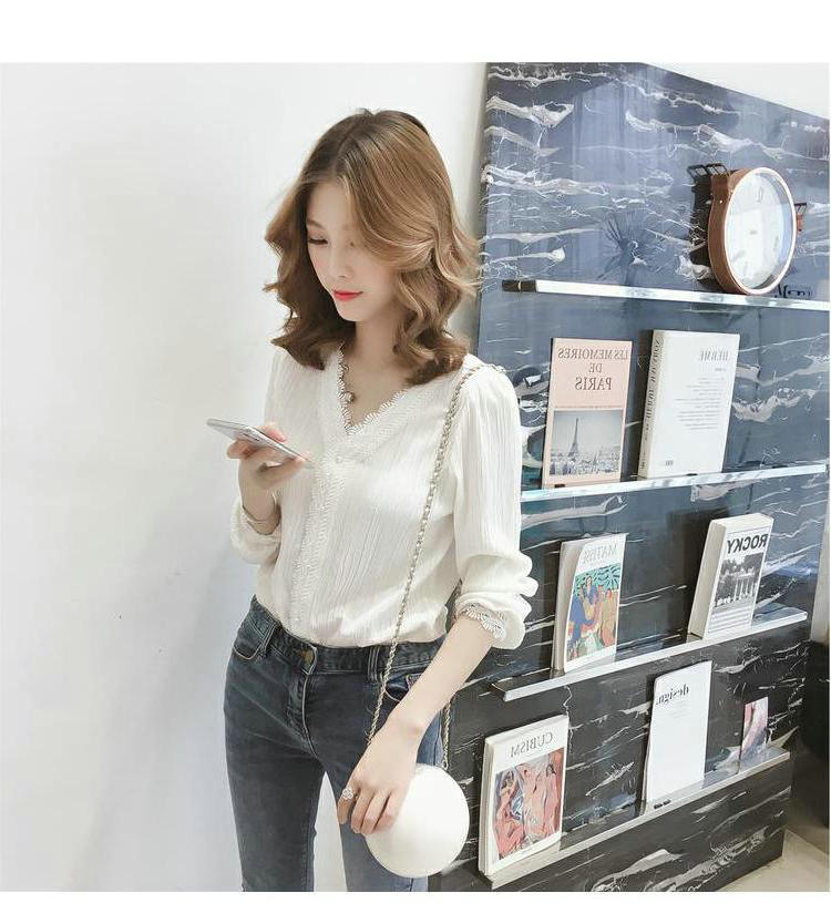 Primavera y Otoño 2025 Nueva Llegada Estilo Coreano Cuello en V Encaje Blanco Manga Larga Camisa Top Mujer Chic Suelta Jersey