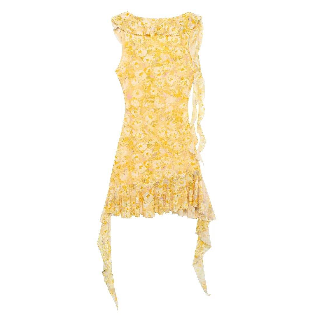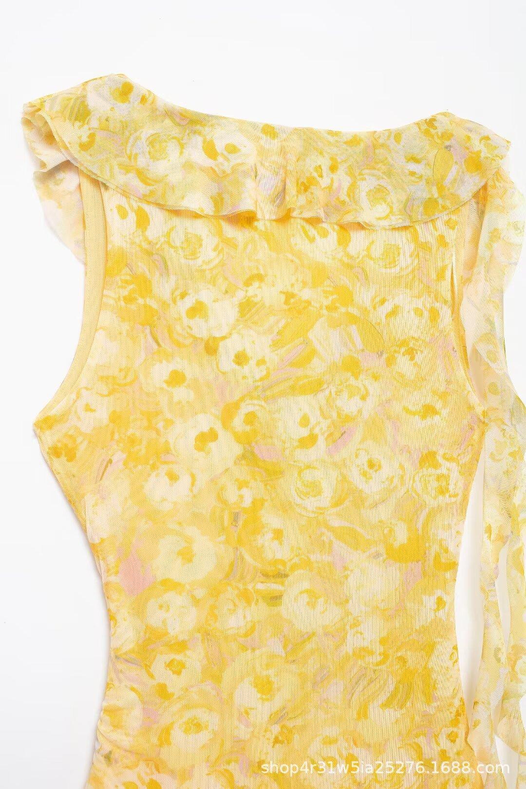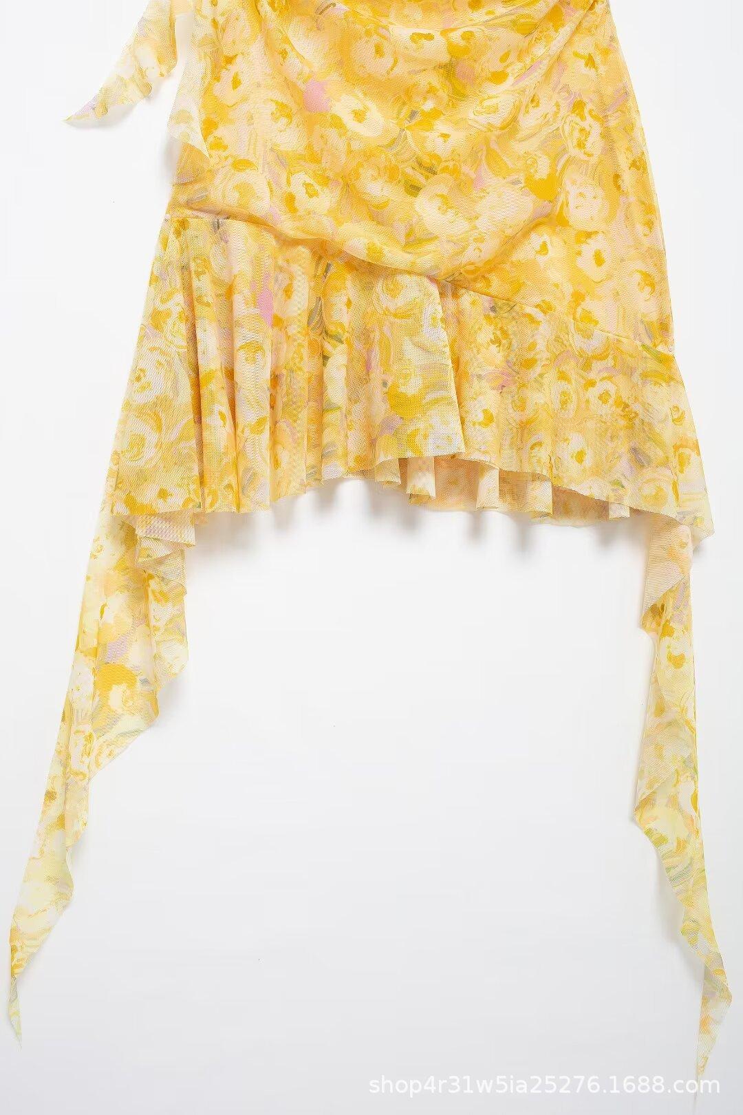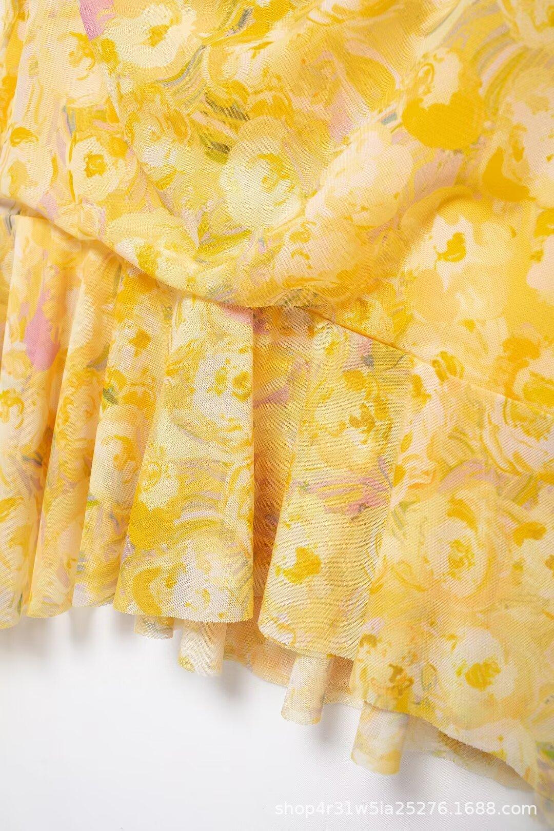 Estilo Europeo y Americano Exportación Vestido Corto de Malla de Seda Estampada con Cuello en V de Moda para Mujer Nuevo 2024 Venta al por Mayor
