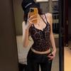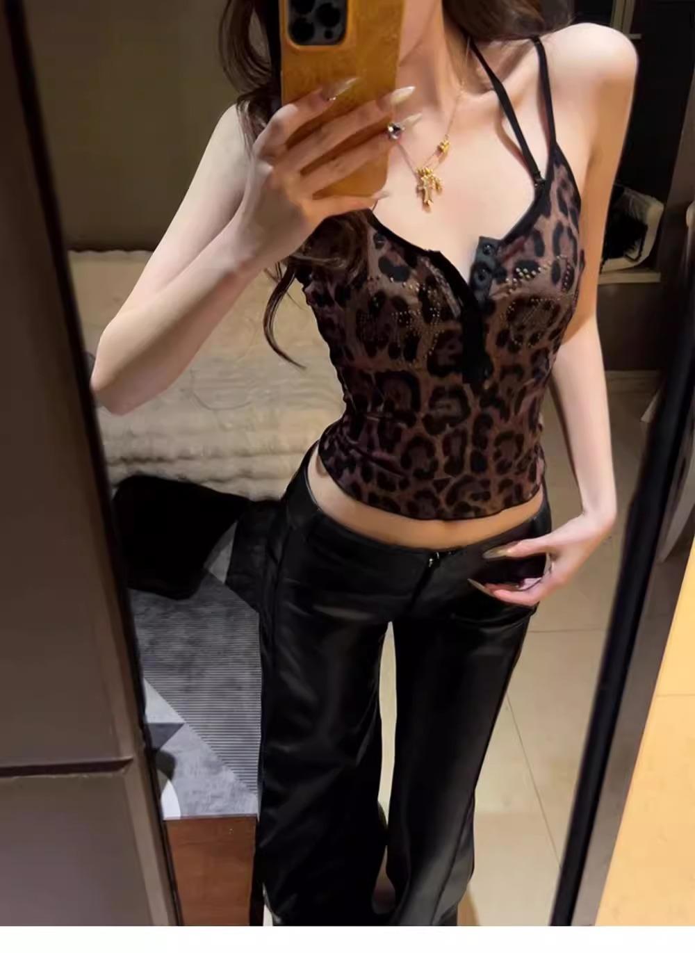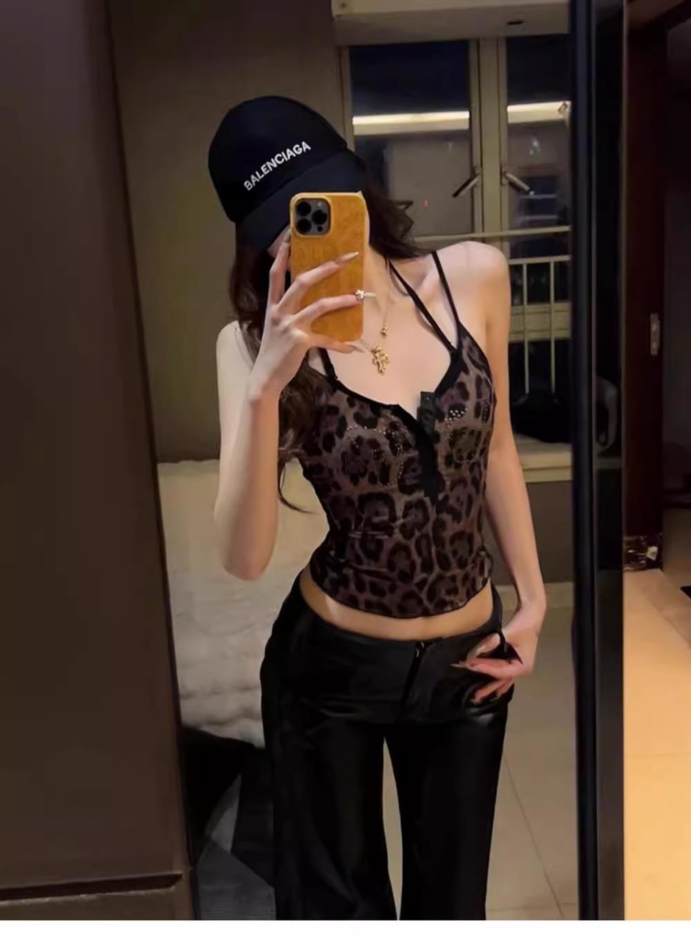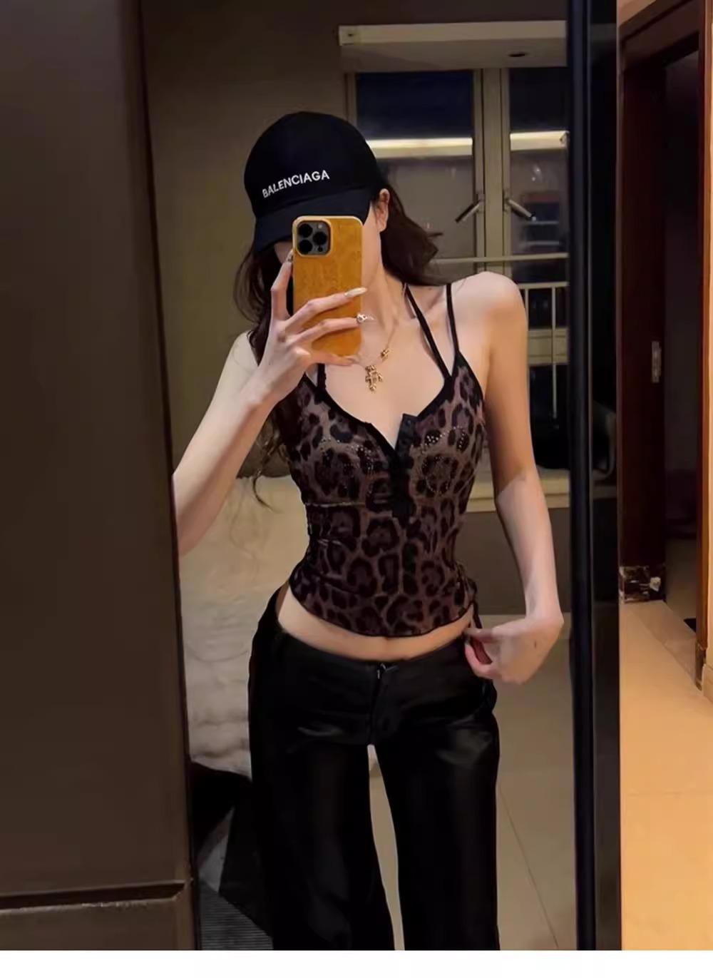 Camisola de Fondo Estampado de Leopardo para Chica Caliente Retro Americana para Mujer Verano Ropa Exterior Sexy Adelgazante Top de Malla