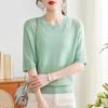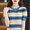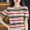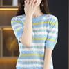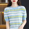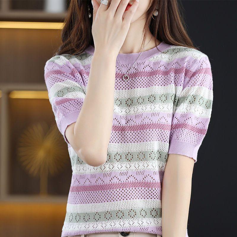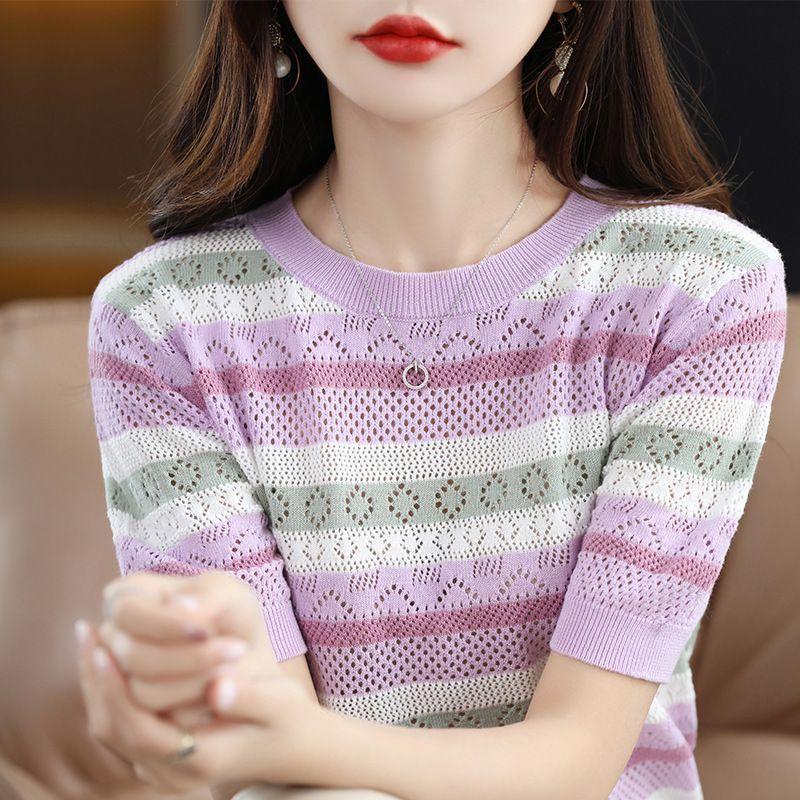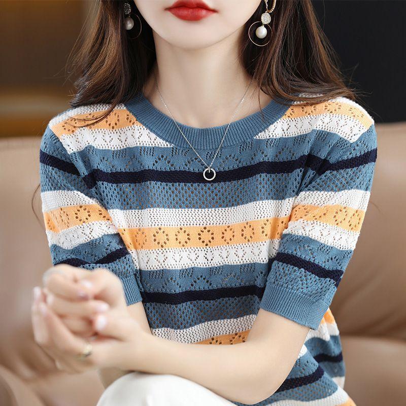Nuevo Tejido de Seda de Hielo de Primavera/Verano 2025 Manga Corta de Punto Calado Cuello Redondo Acanalado Bloque de Color Suelto Media Manga Top Rayado para Mujer