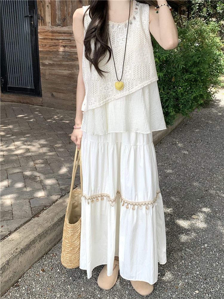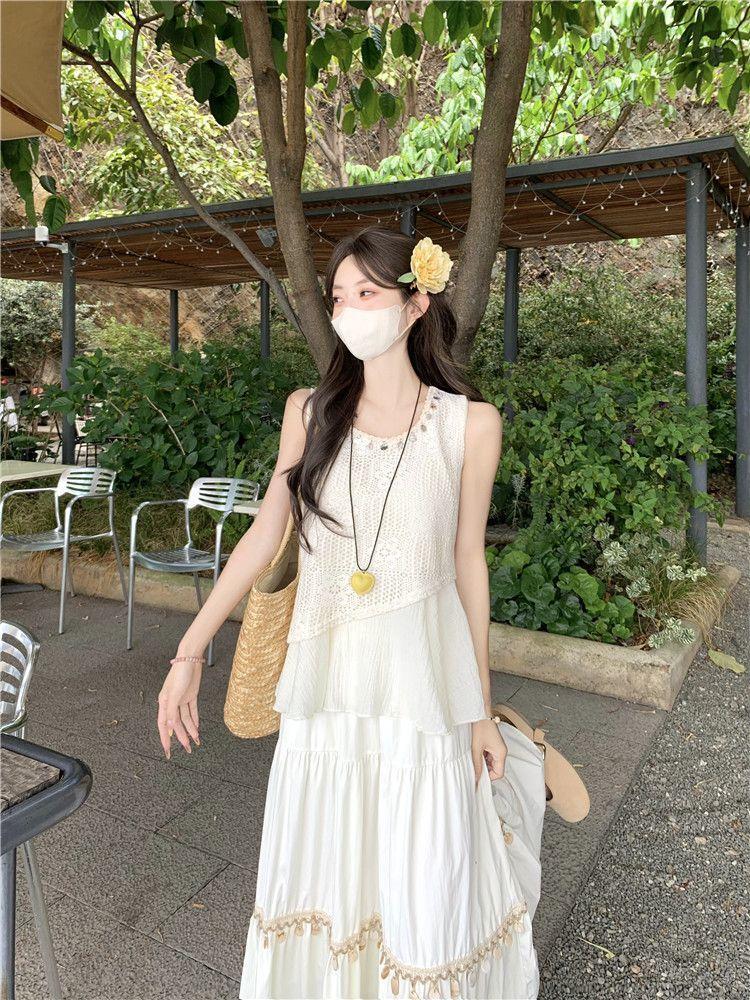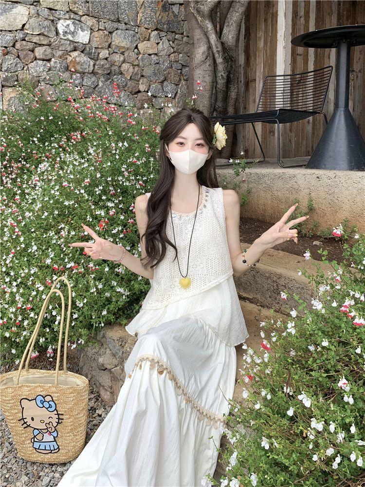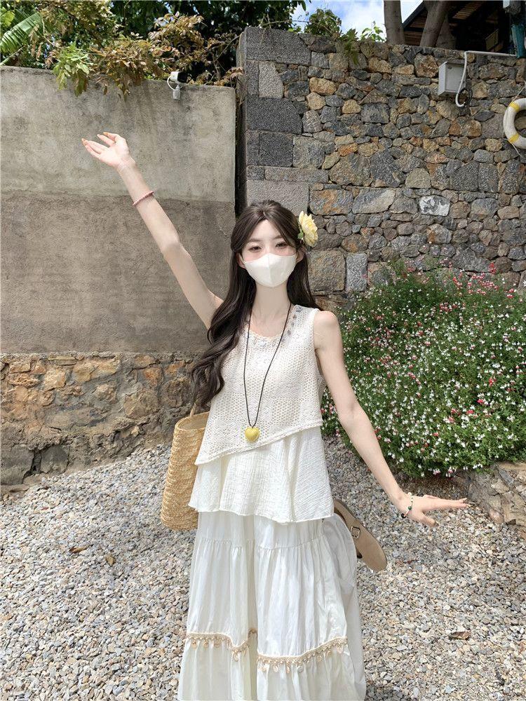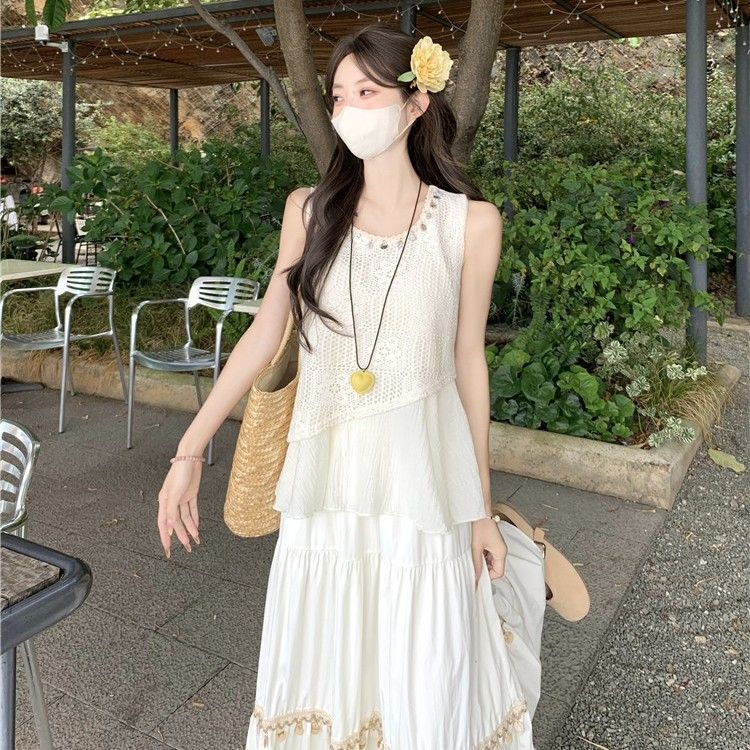 Estilo Vacacional Bohemio Camisola Falsa de Dos Piezas Ropa Exterior para Mujer Top sin Mangas Cintura Alta Media Longitud Conjunto de Dos Piezas