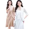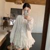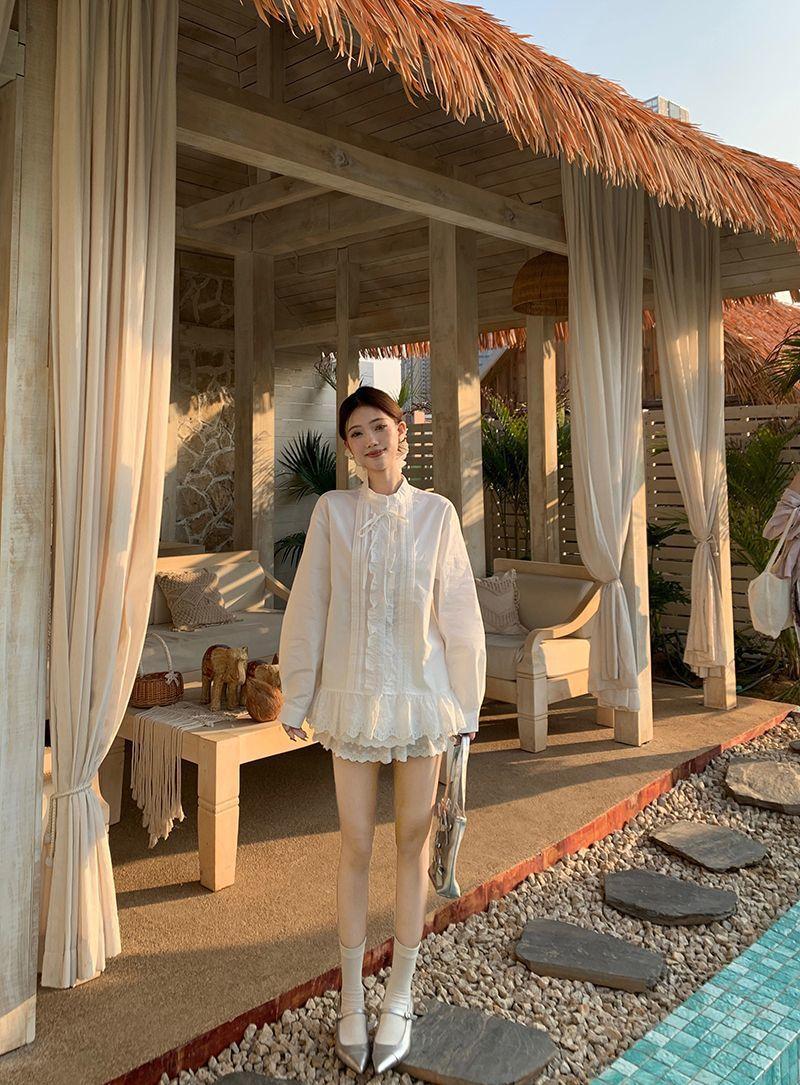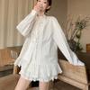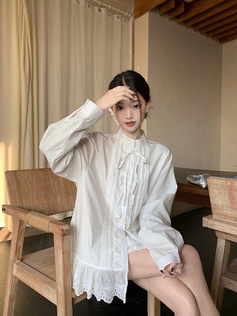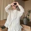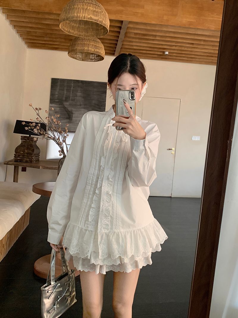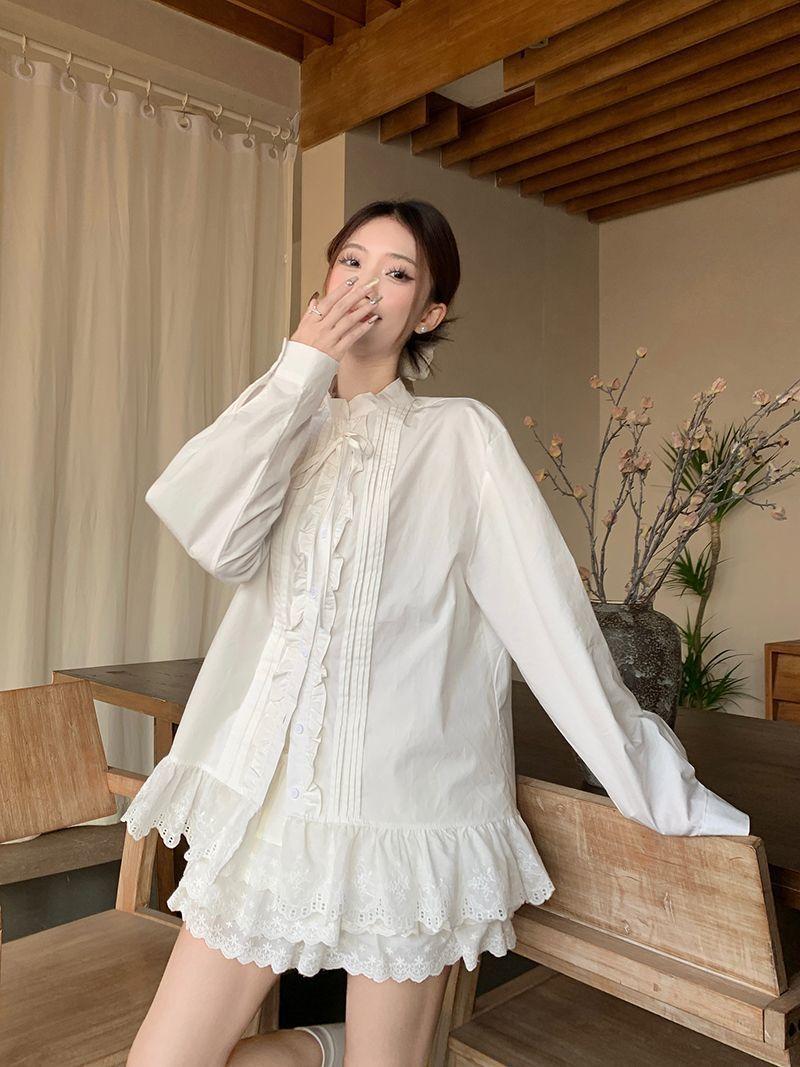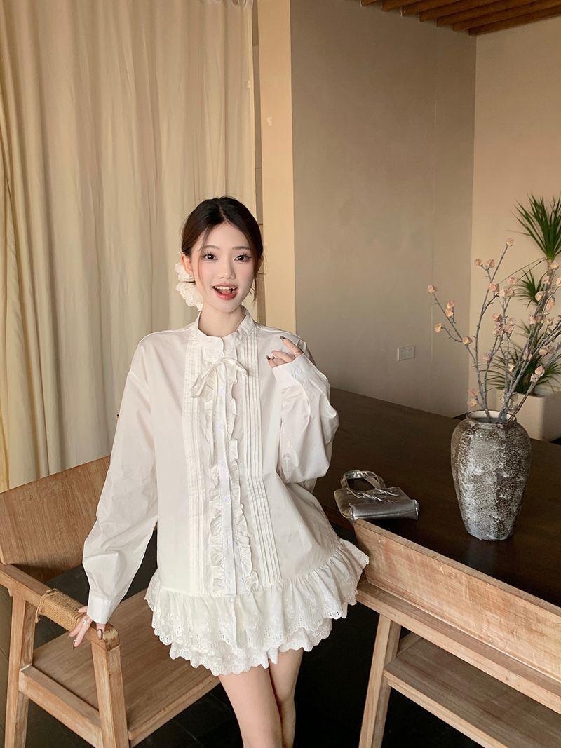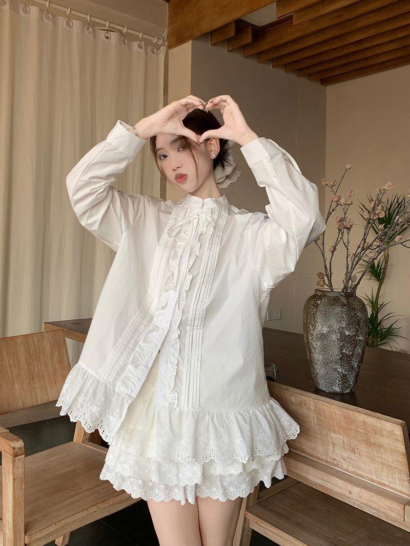 Traje Estilo Dulce para Mujer Camisa Blanca Chic con Cuello y Encaje Primavera Falda Conjunto de Dos Piezas