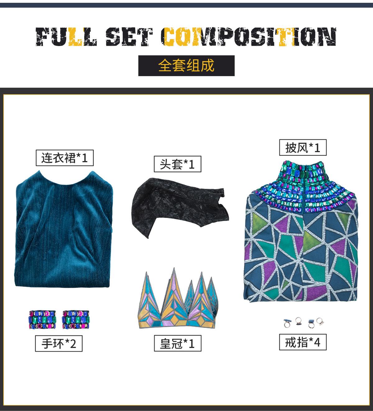 Crown 82, Headgear 38, Cloak 648, Dress 230, Bracelet + ring 70, Full set 1006