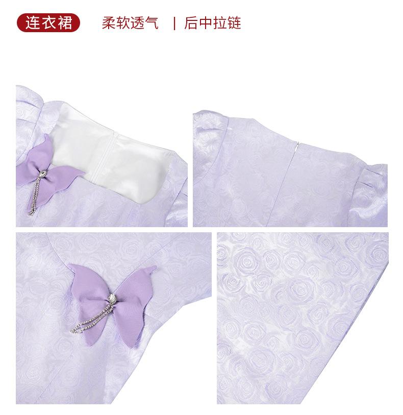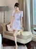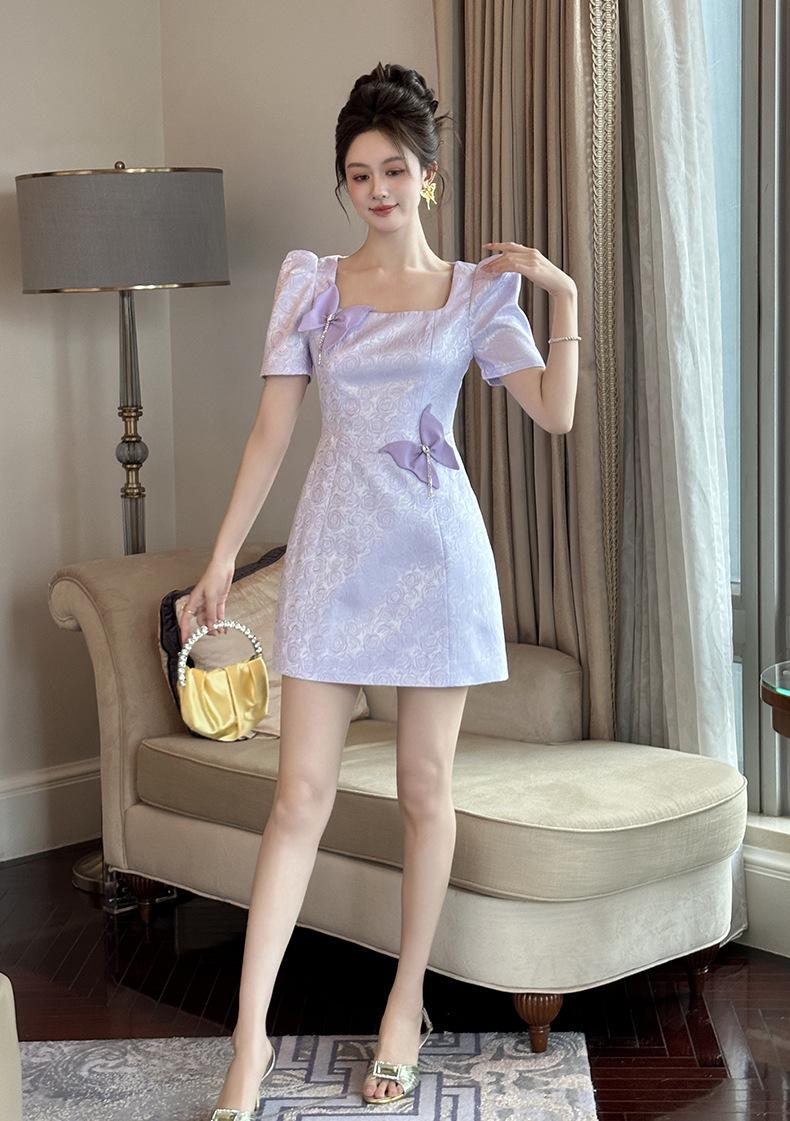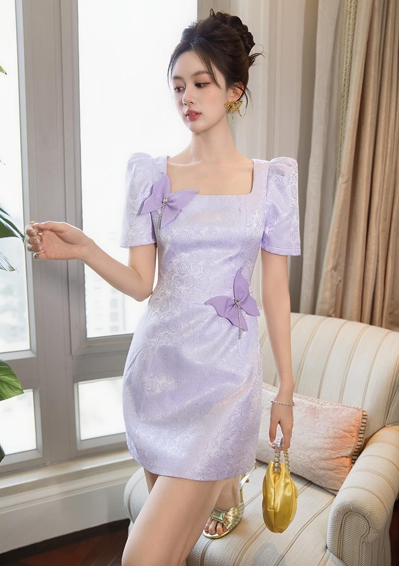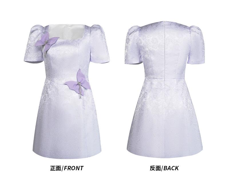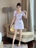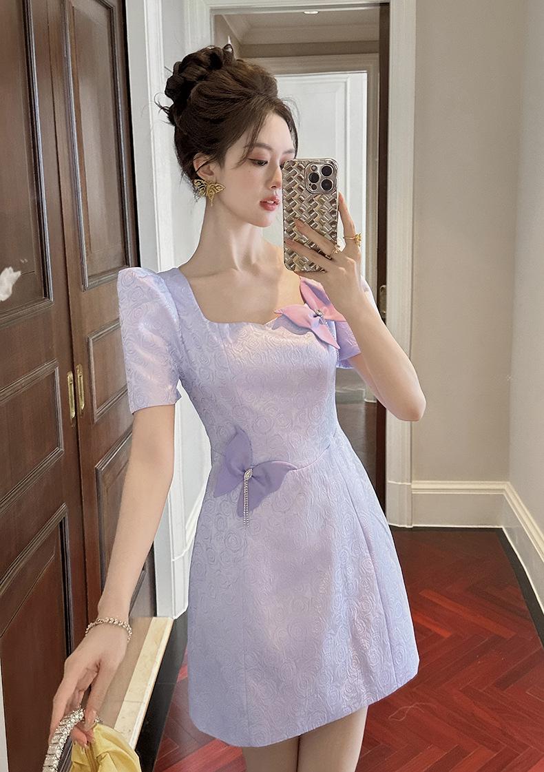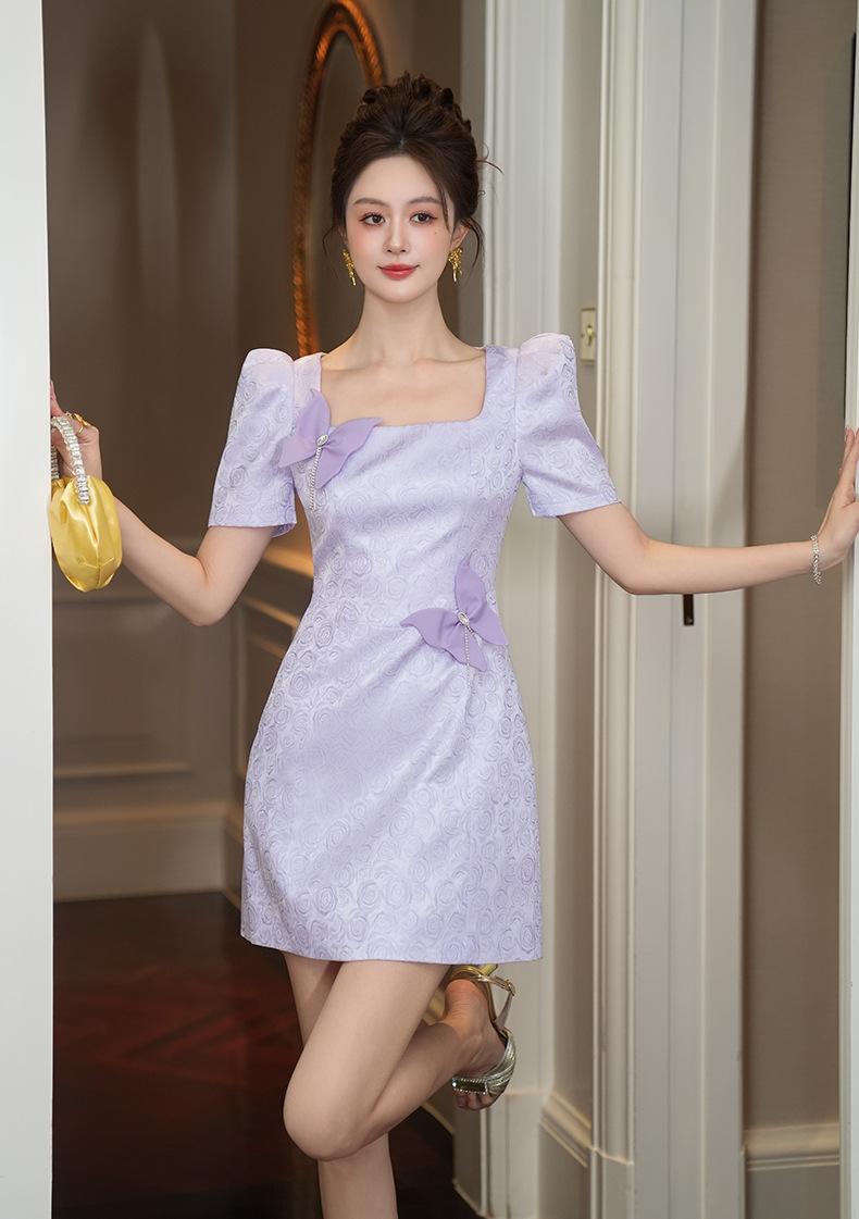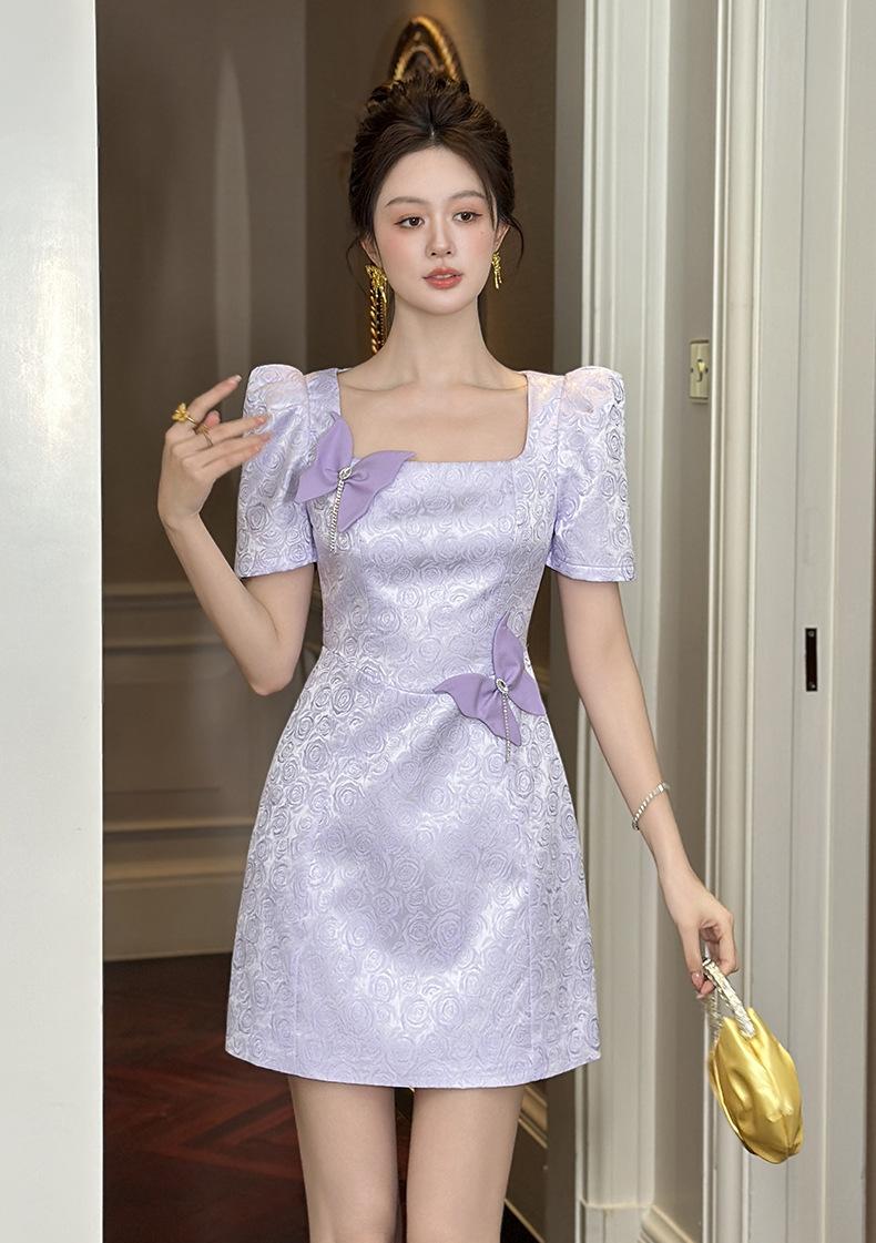 2025 Nuevo Verano Vestido de Mujer Francés Cuello Cuadrado Diseño de Lazo Cintura Morado Manga Corta 15393