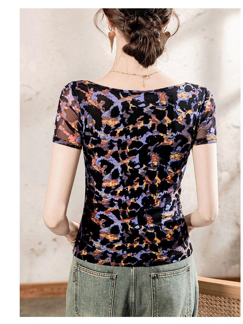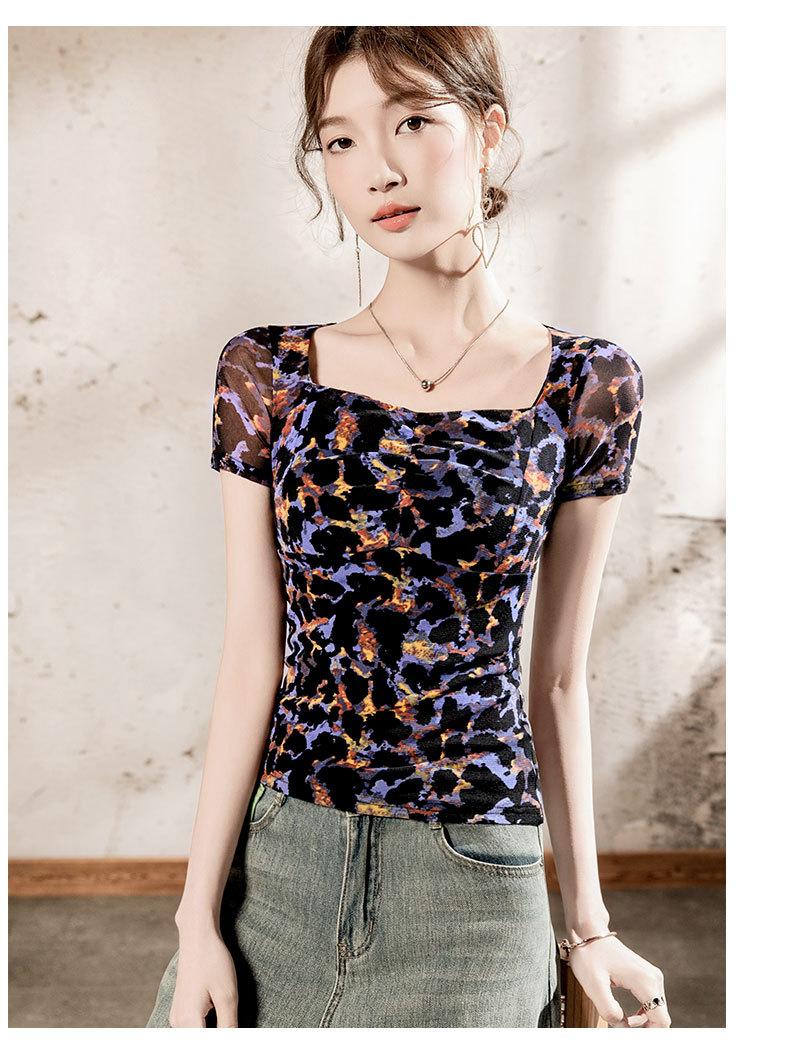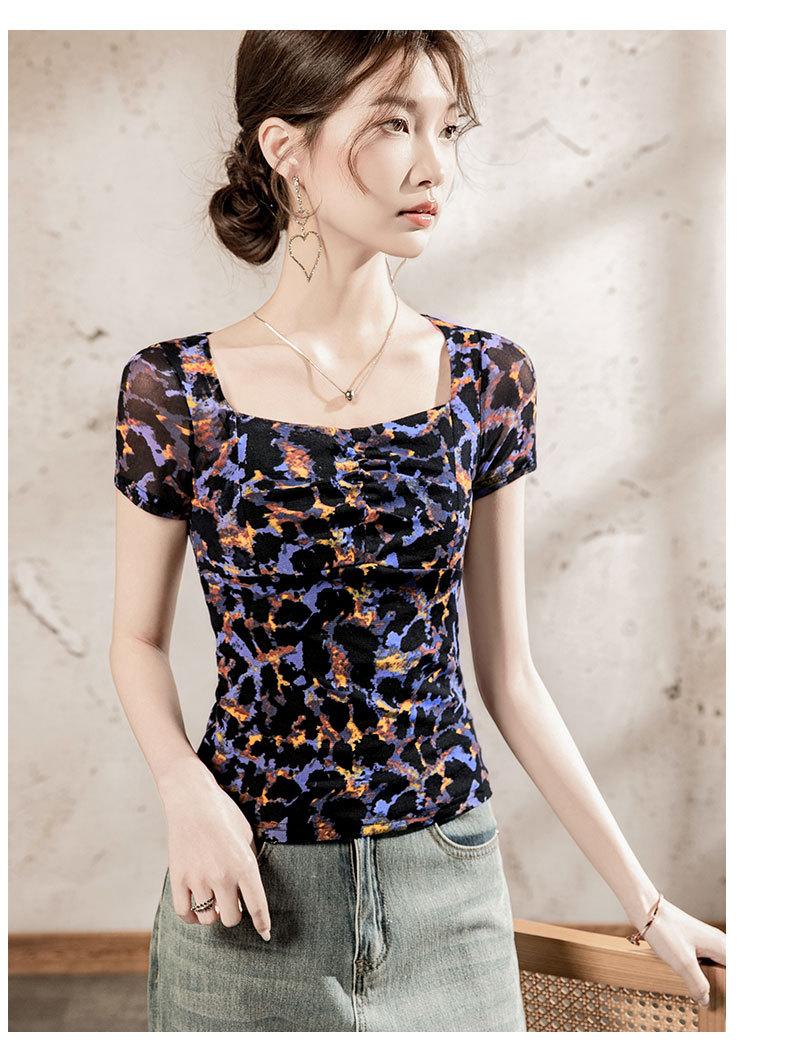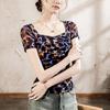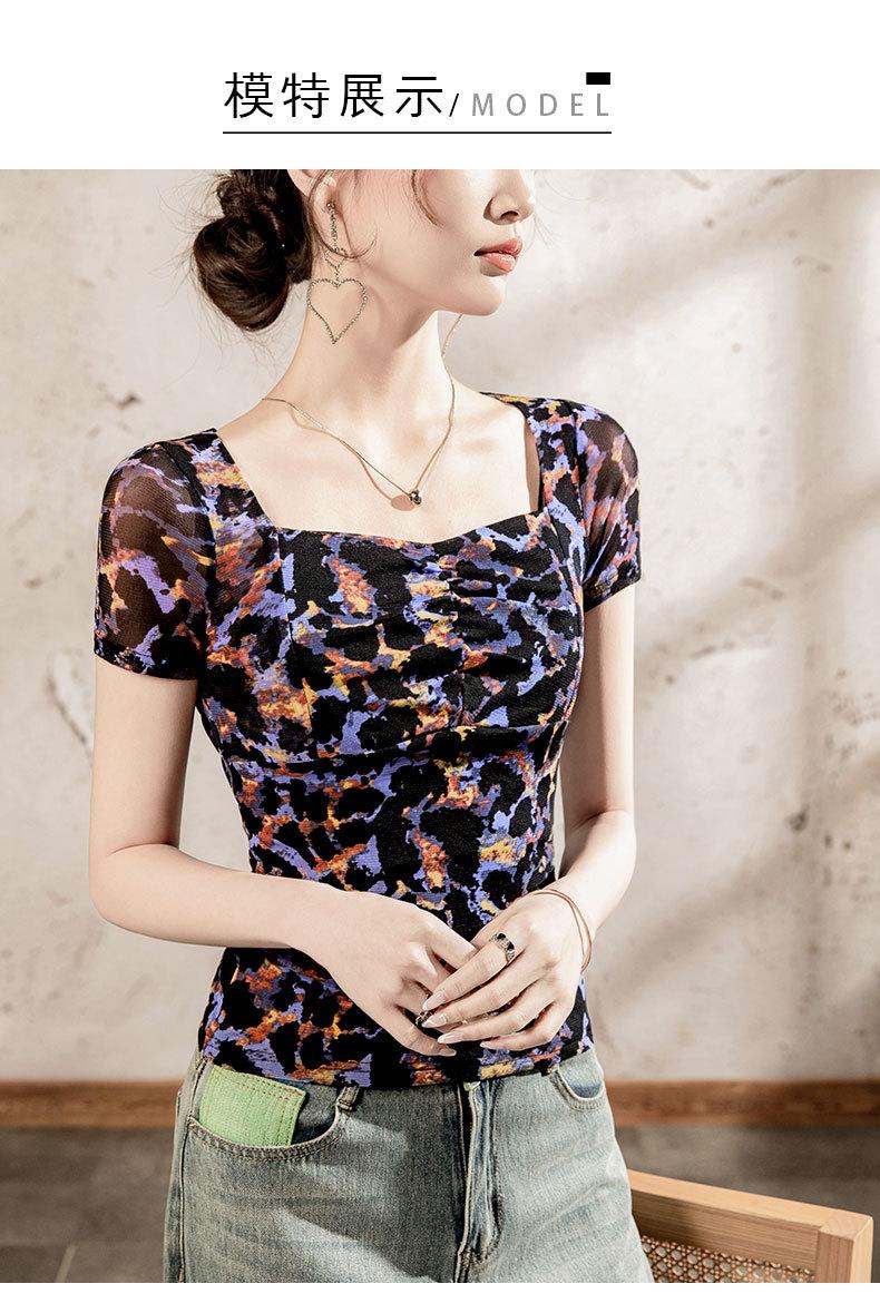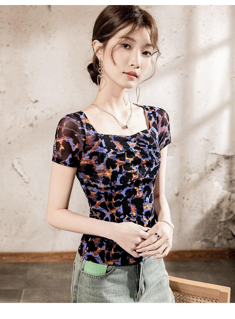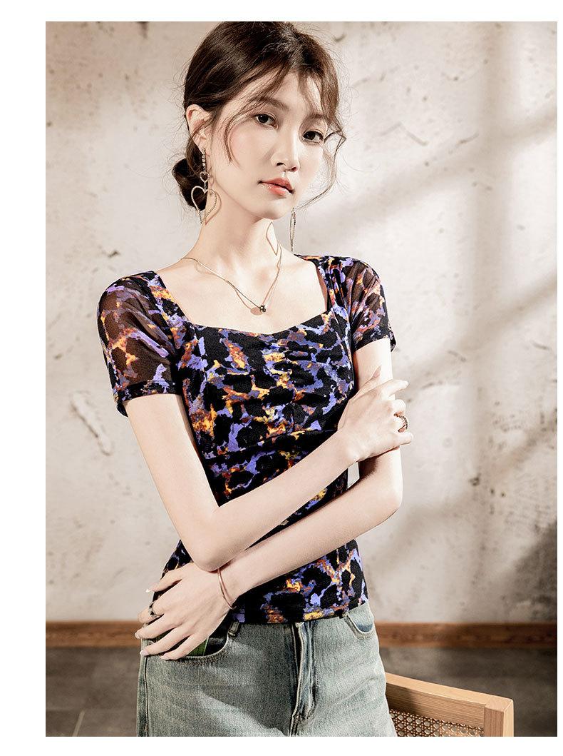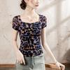 Playera Floral de Malla con Cuello Cuadrado para Mujer Manga Corta Verano 2025 Nuevo Top para Mujer con Pliegues Patchwork Color Estampado