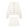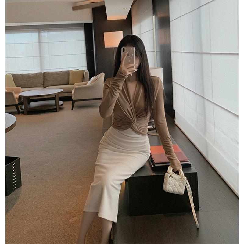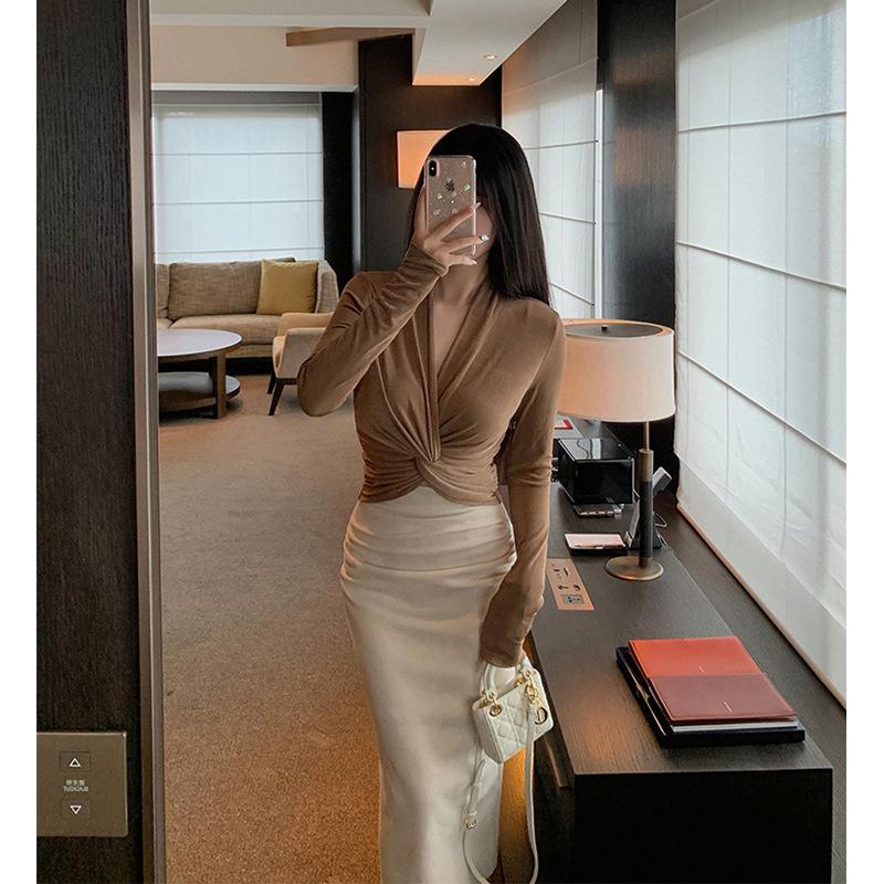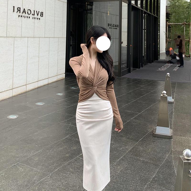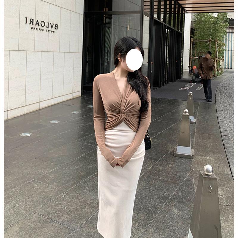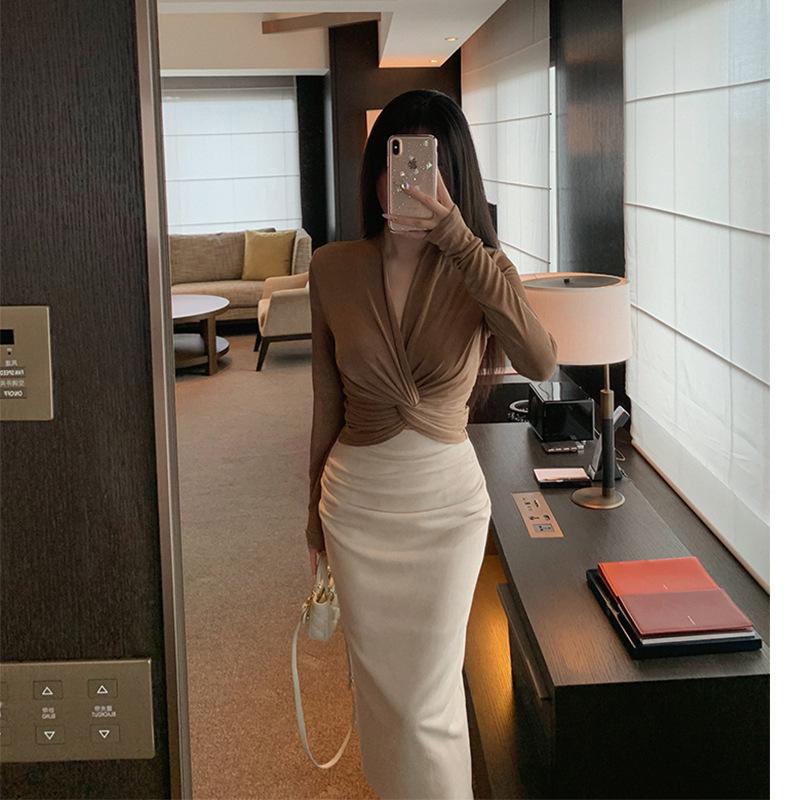 Nuevo elegante traje de hermana, top de punto de manga larga con cuello en V respetuoso con la piel + versátil falda de ante de alta elasticidad
