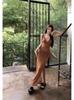 Vestido de estilo festivo europeo y americano para mujer transfronterizo Falda de playa Blusa Tejido de punto calado Junto al mar Color sólido Vestido con tirantes