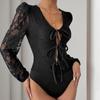 Bai Fen Zhi YiTransfronterizo Europeo y Americano 2025 Nuevo Vintage Fiesta Hueco Encaje Manga Larga Negro Mono