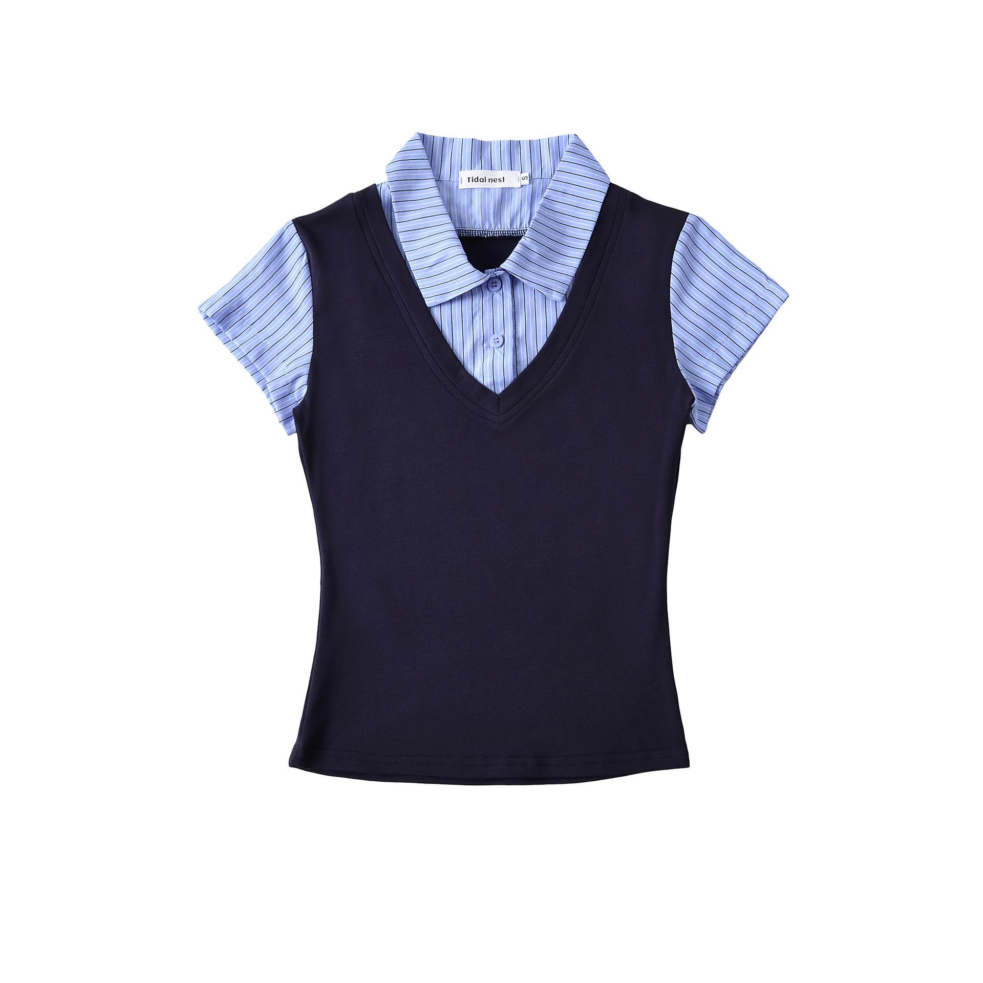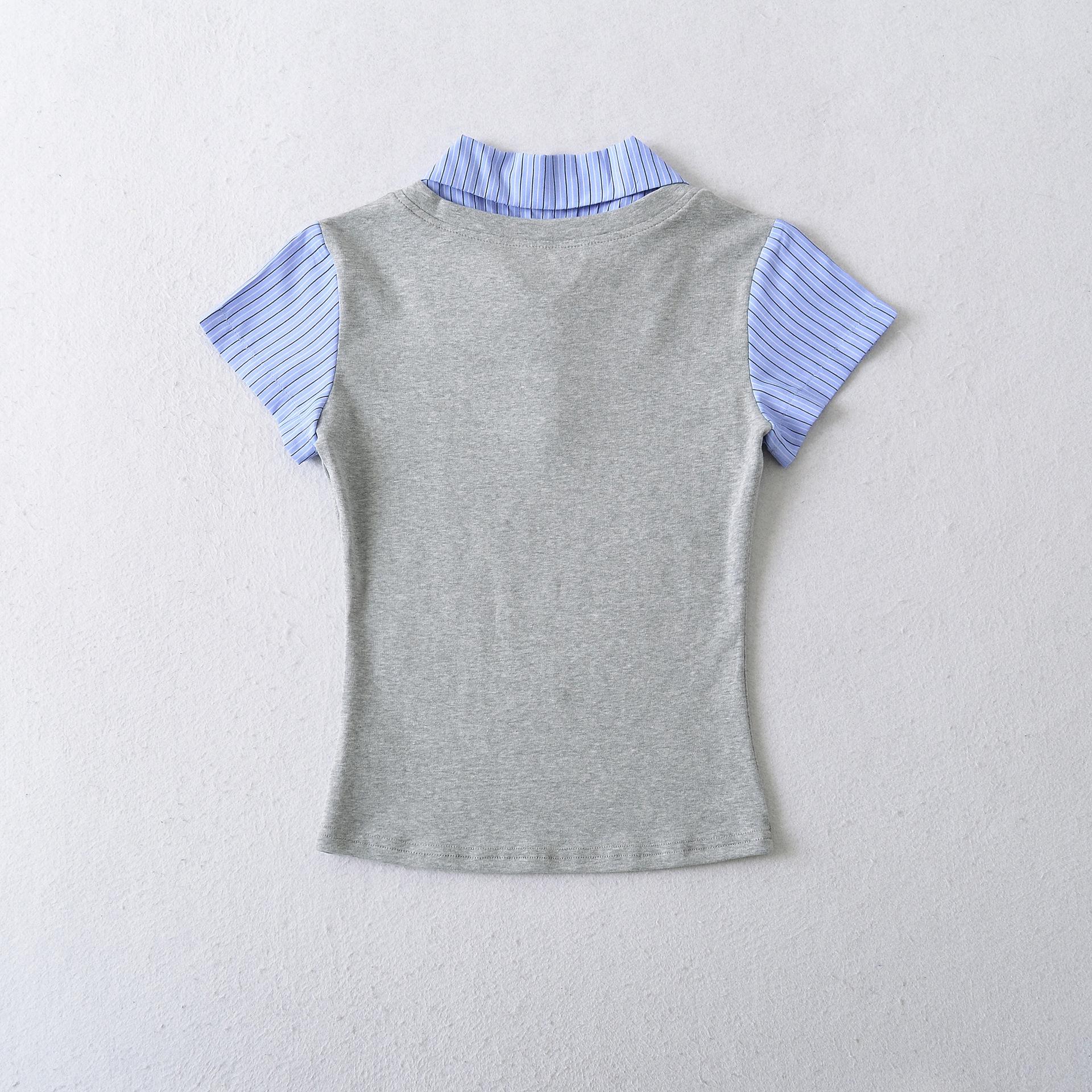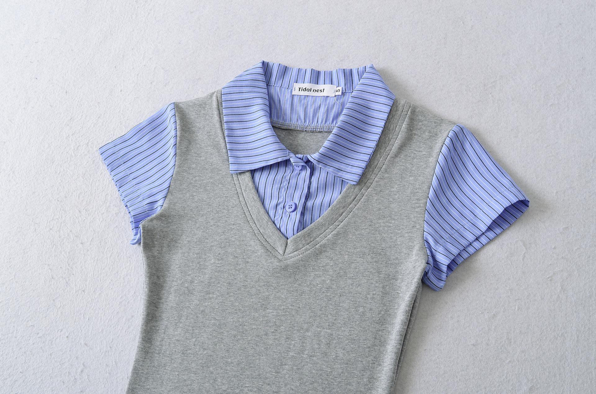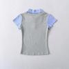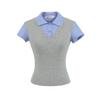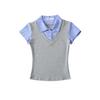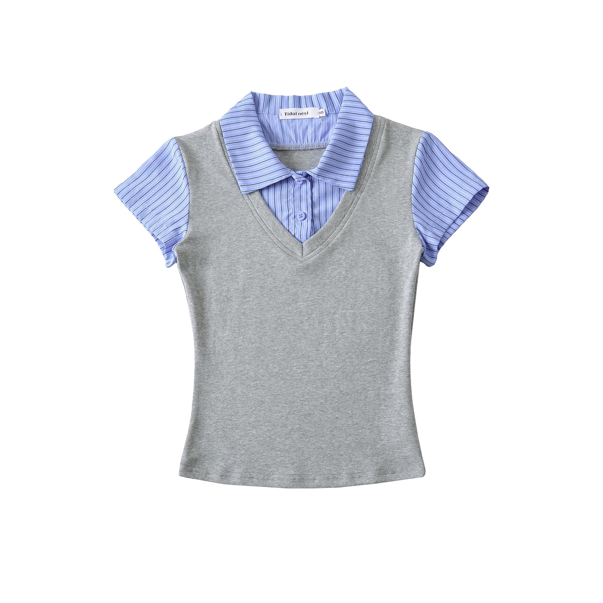 1591-25 Estilo Coreano Estilo Preppy Falso Dos Piezas Patchwork Top Falso Dos Piezas Rayas Patchwork Cuello Polo Camiseta de Manga Corta