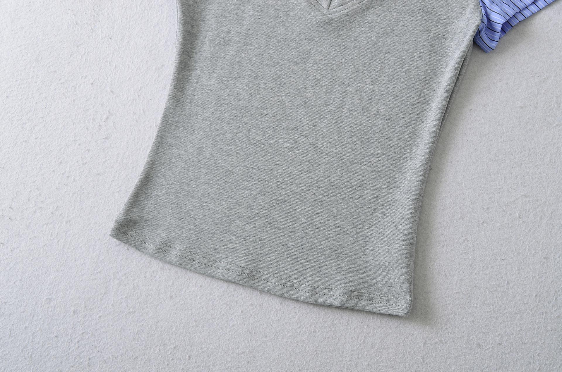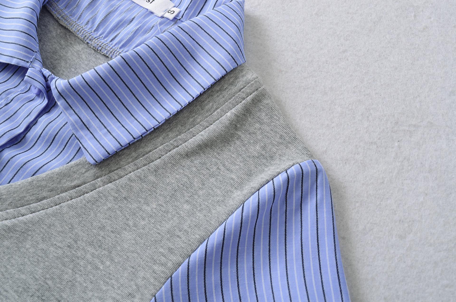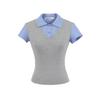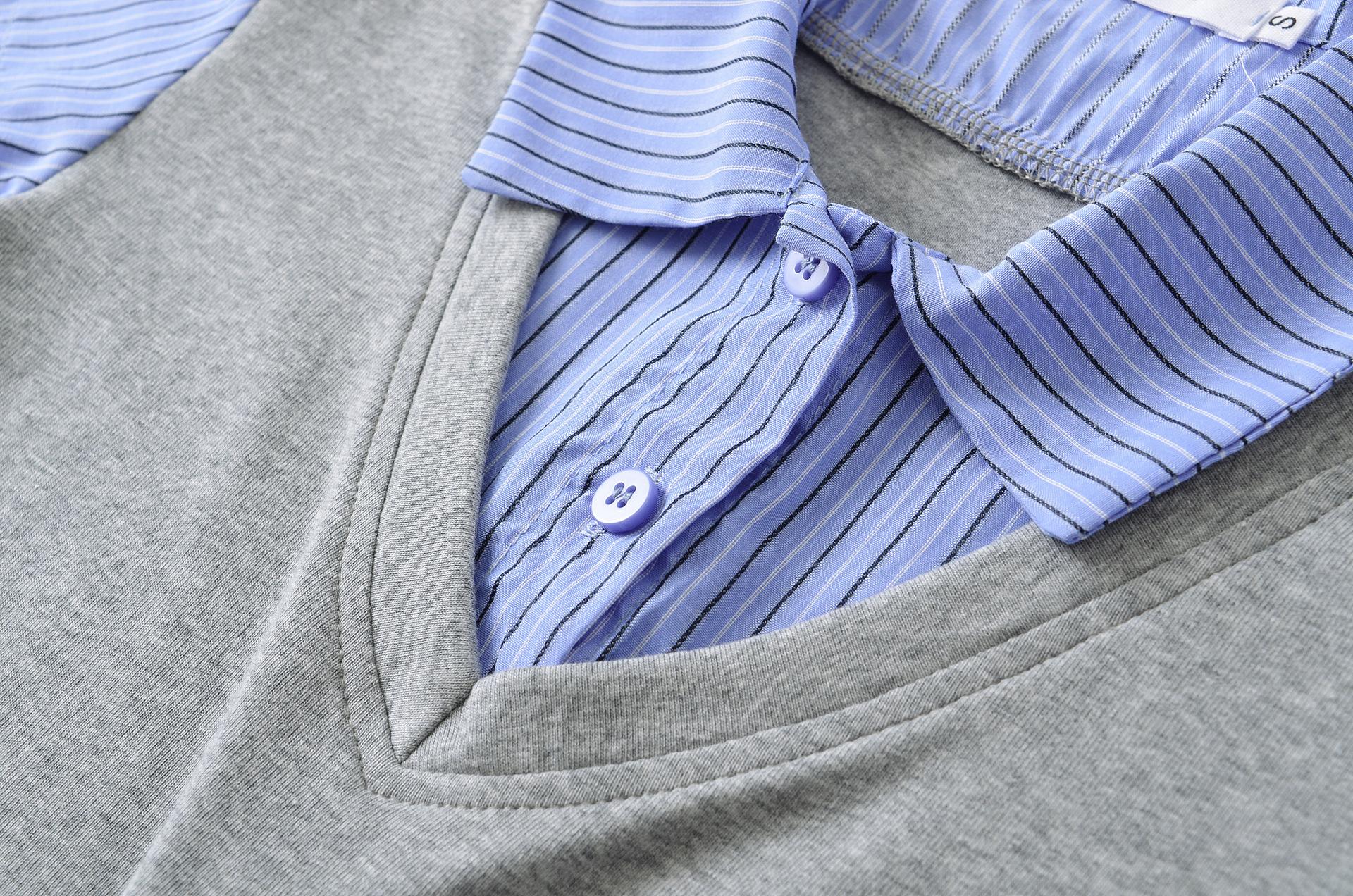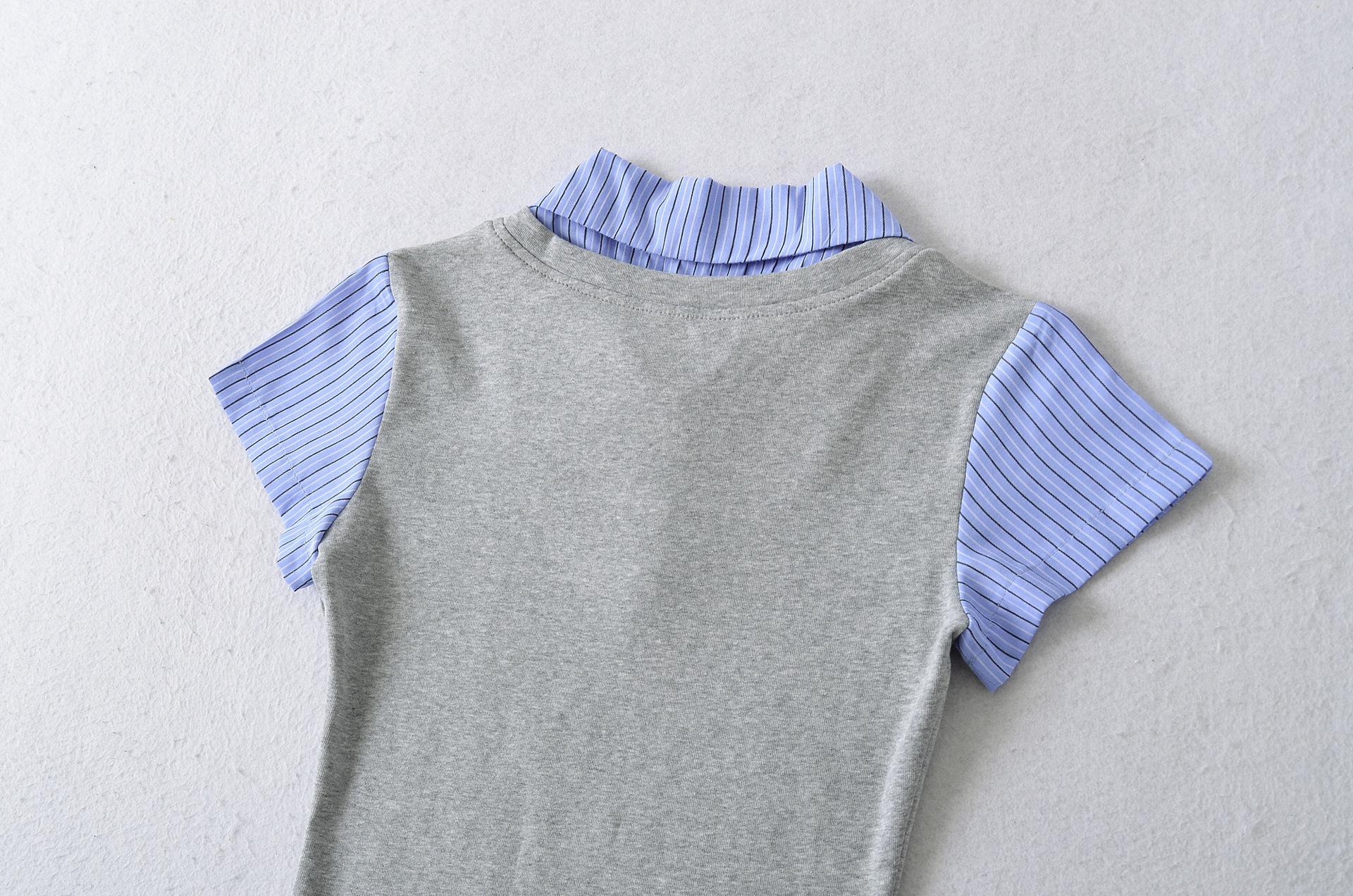 1591-25 Estilo Coreano Estilo Preppy Falso Dos Piezas Patchwork Top Falso Dos Piezas Rayas Patchwork Cuello Polo Camiseta de Manga Corta