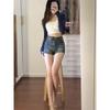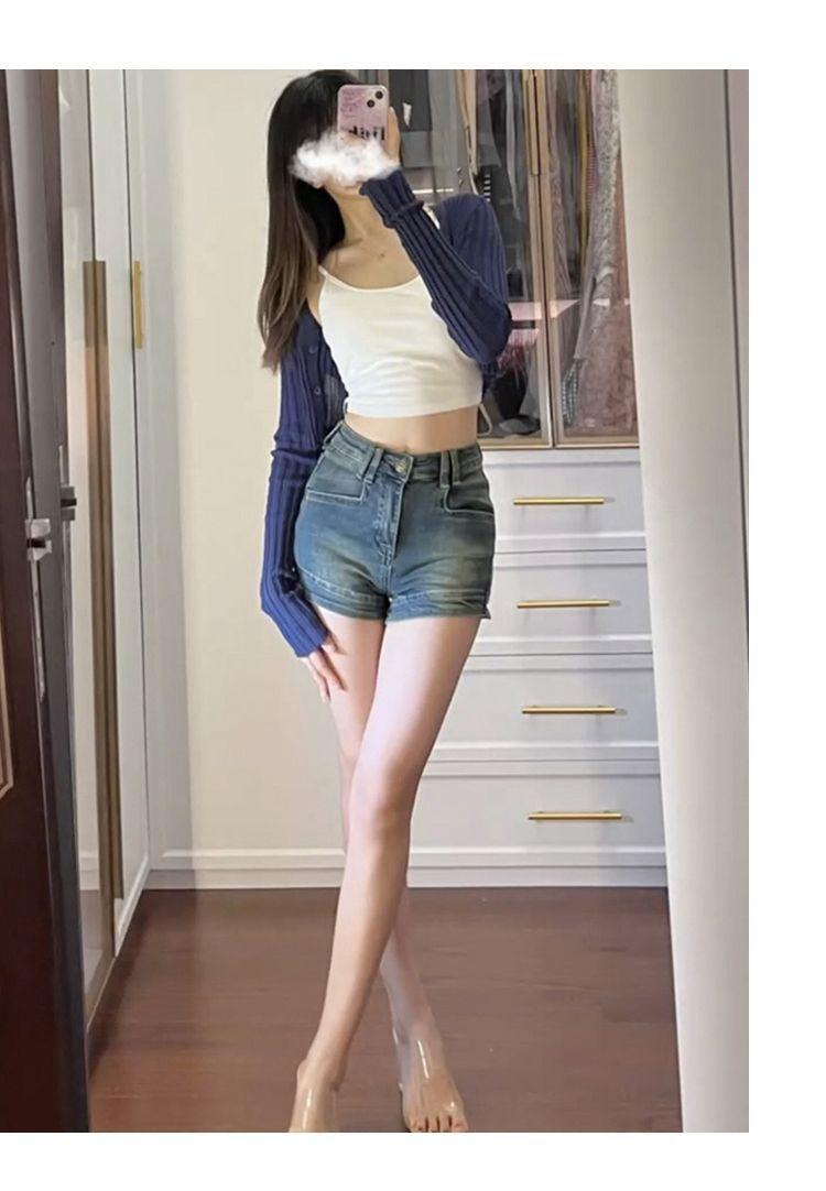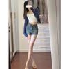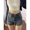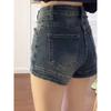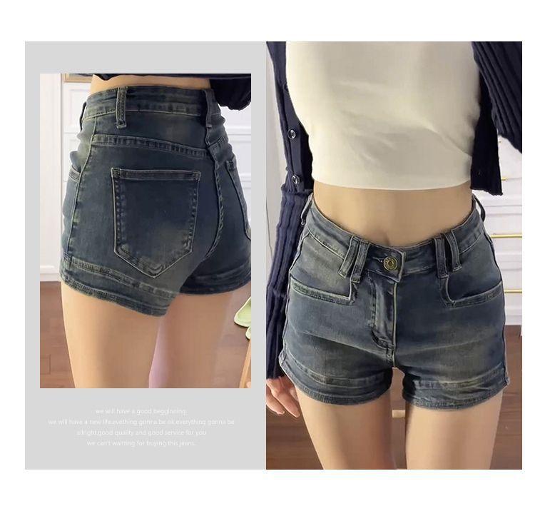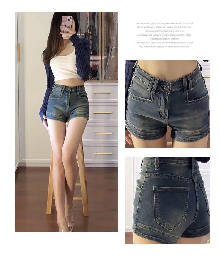Shorts de mezclilla retro americanos para mujer 2025 verano populares de cintura alta ajustados chica hot pequeños elásticos línea A pantalones cortos