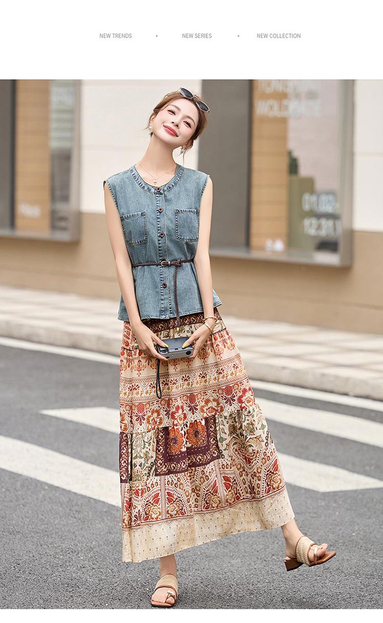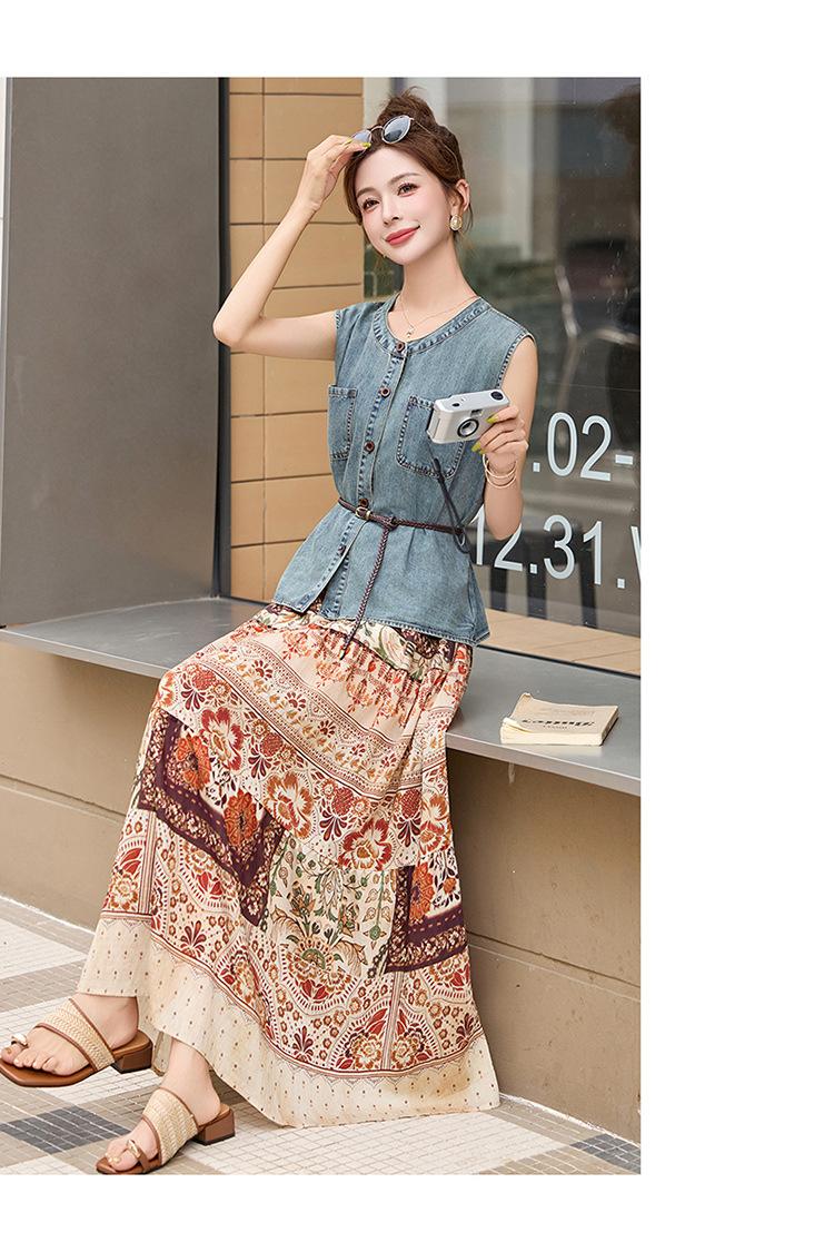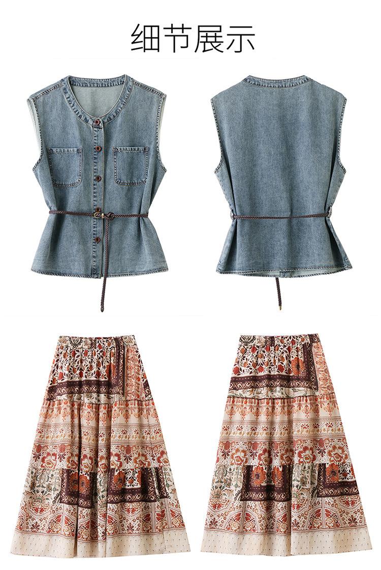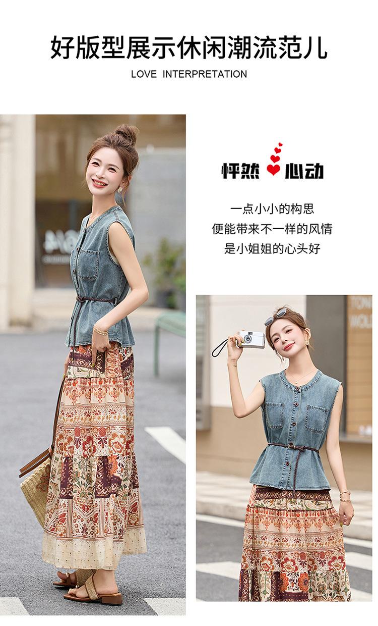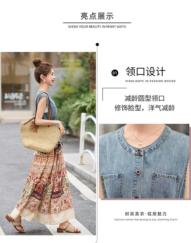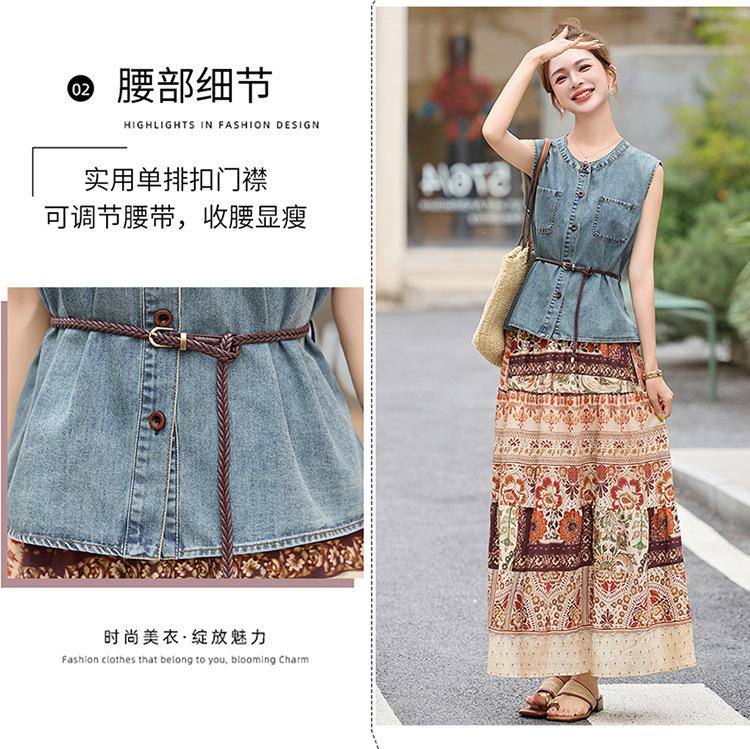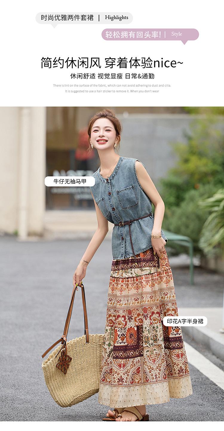 2025 Nueva Moda de Verano Casual Versátil Reductor de Edad Cómodo Amigable con la Piel Denim Sin Mangas Estampado Traje de Falda