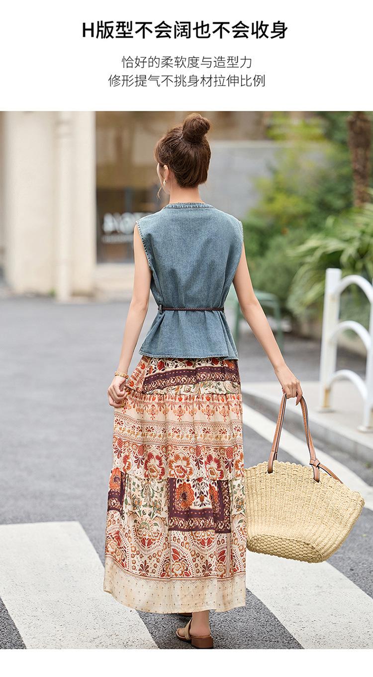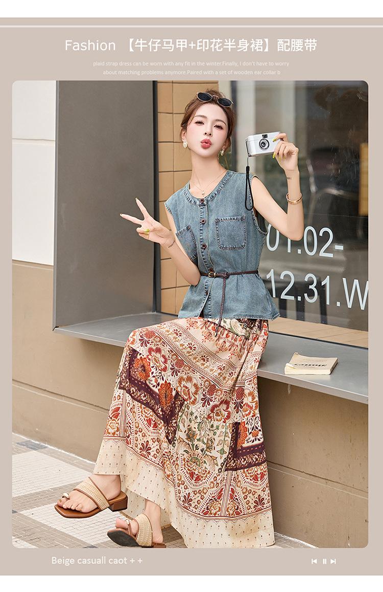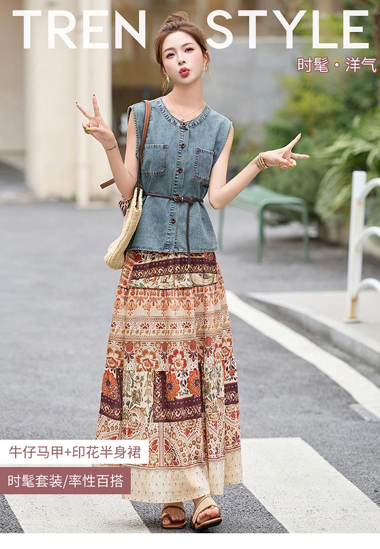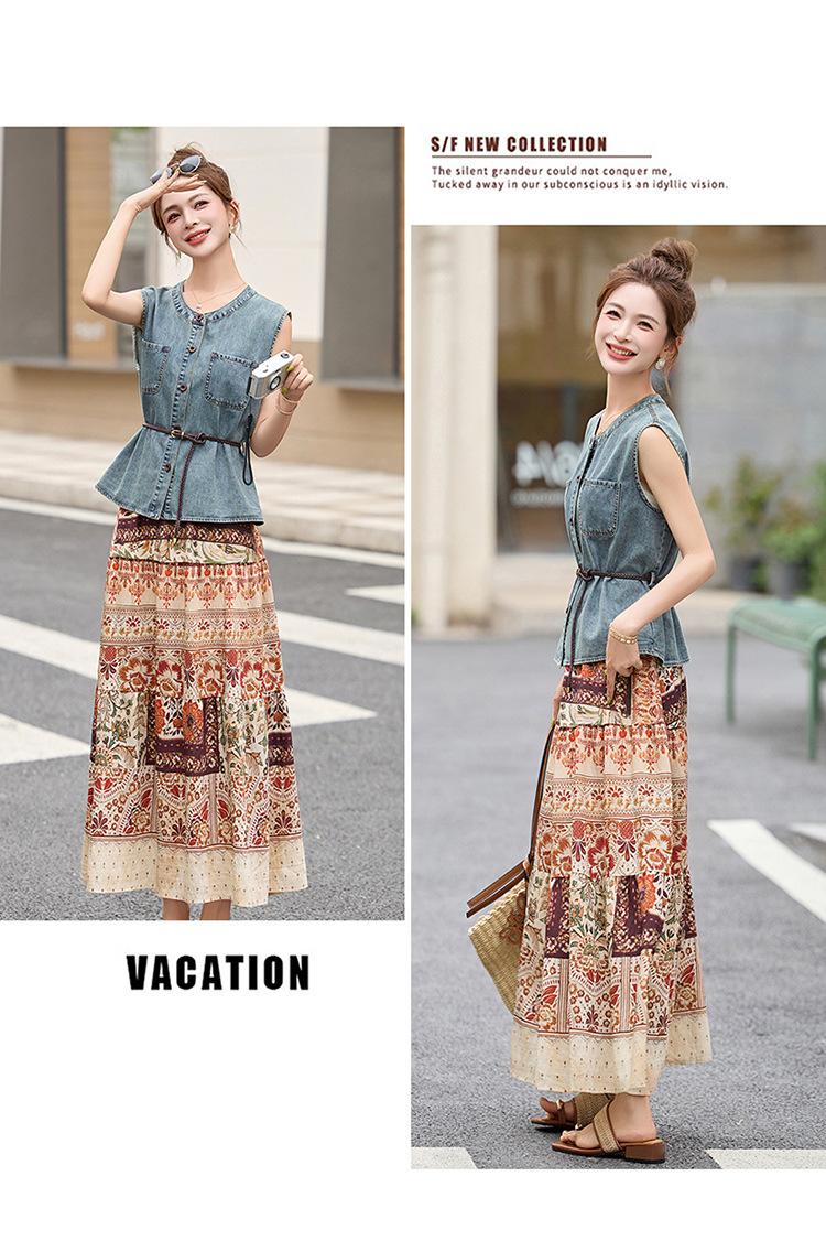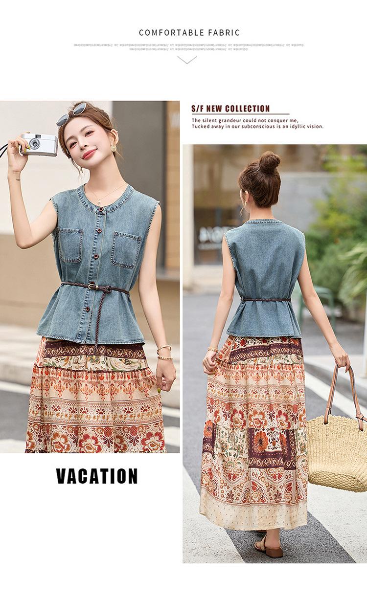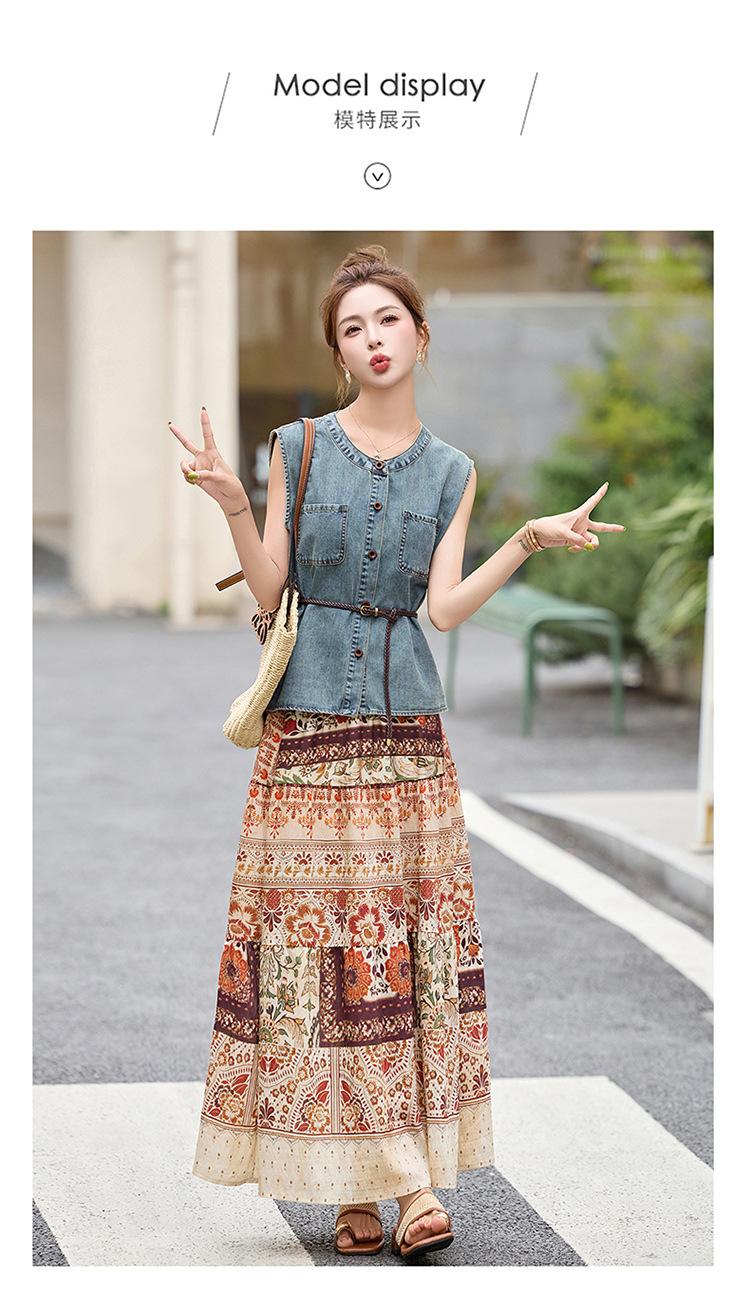 2025 Nueva Moda de Verano Casual Versátil Reductor de Edad Cómodo Amigable con la Piel Denim Sin Mangas Estampado Traje de Falda