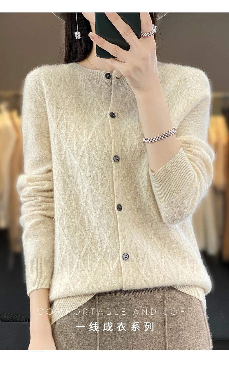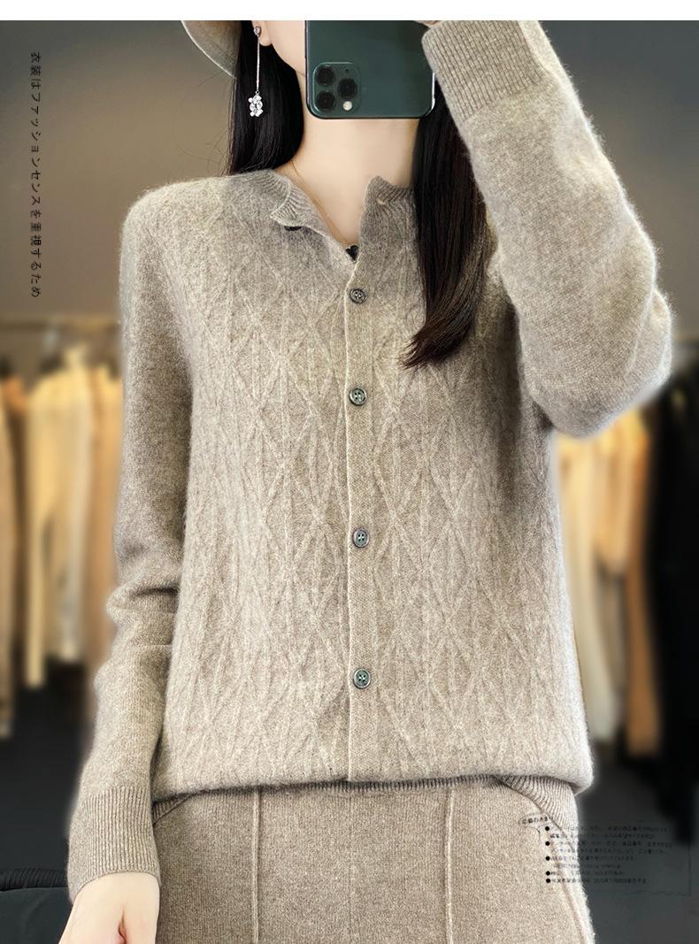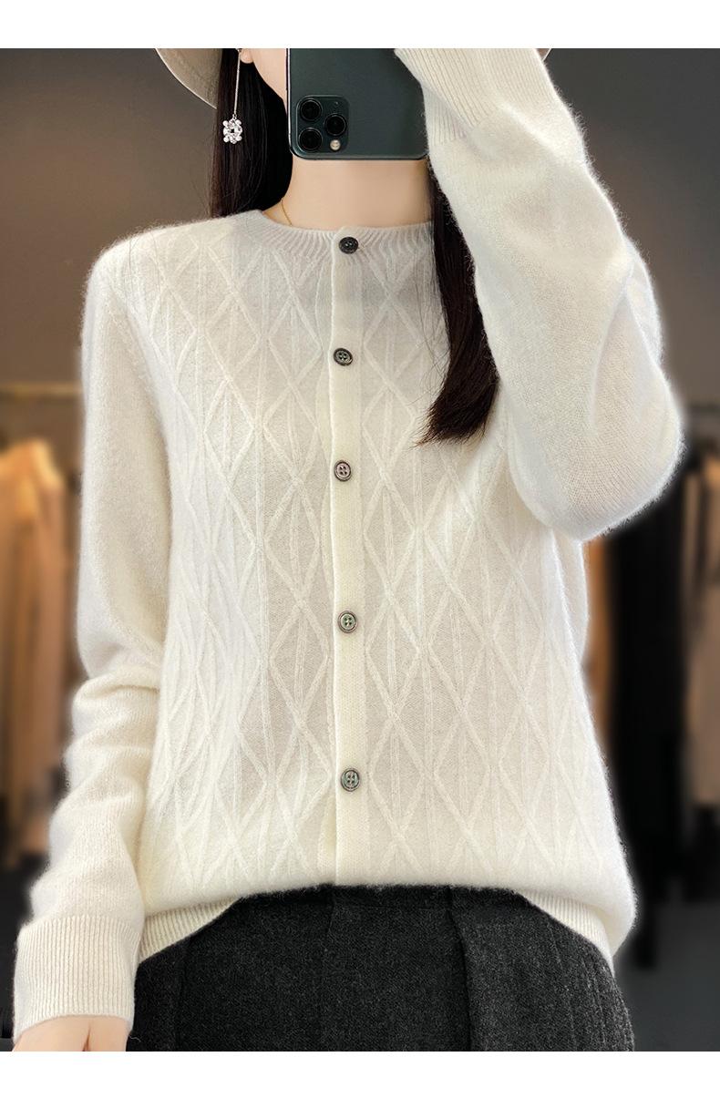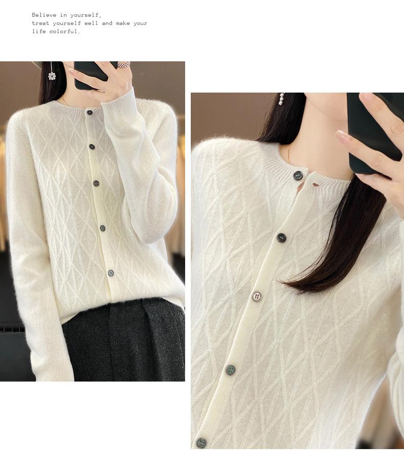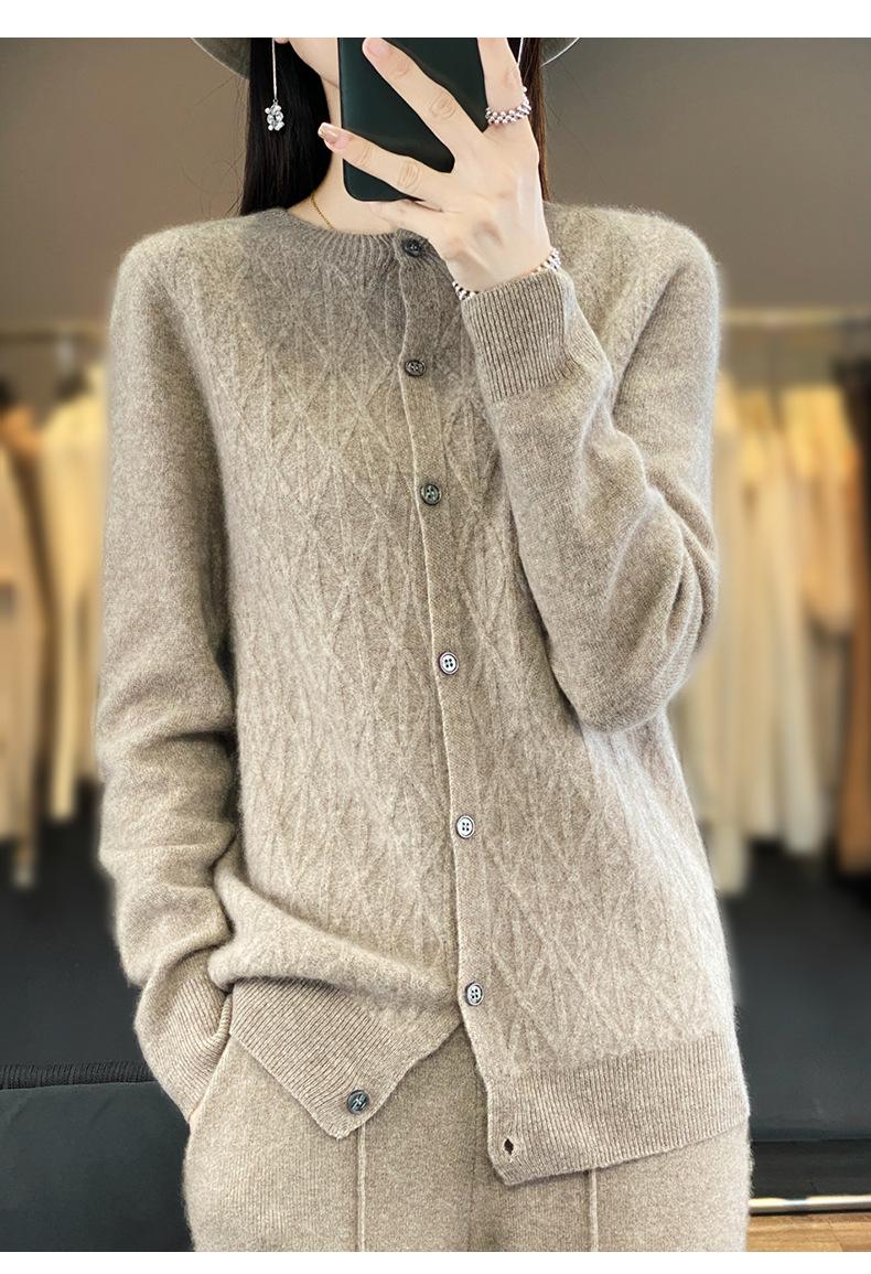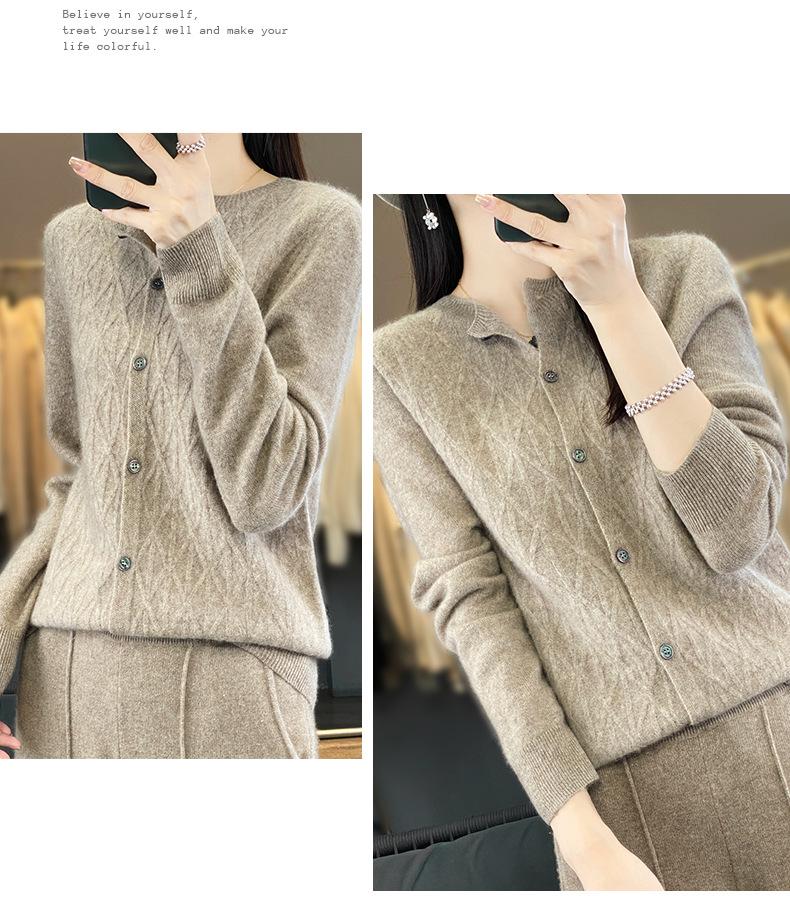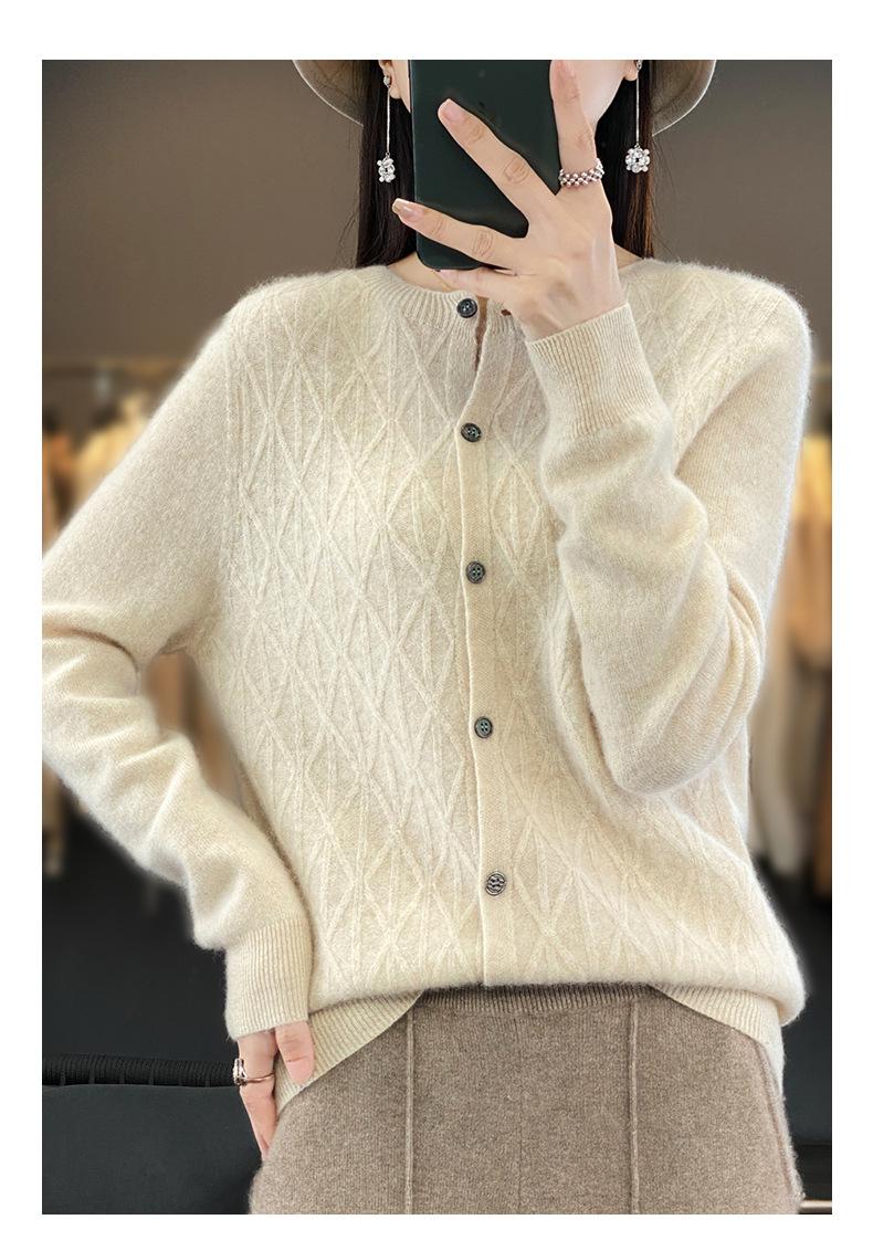 Top Elegante Suelto Jacquard Diamante para Mujer Otoño e Invierno 2025 Nuevo Lana Cuello Redondo Cárdigan Tejido Manga Larga