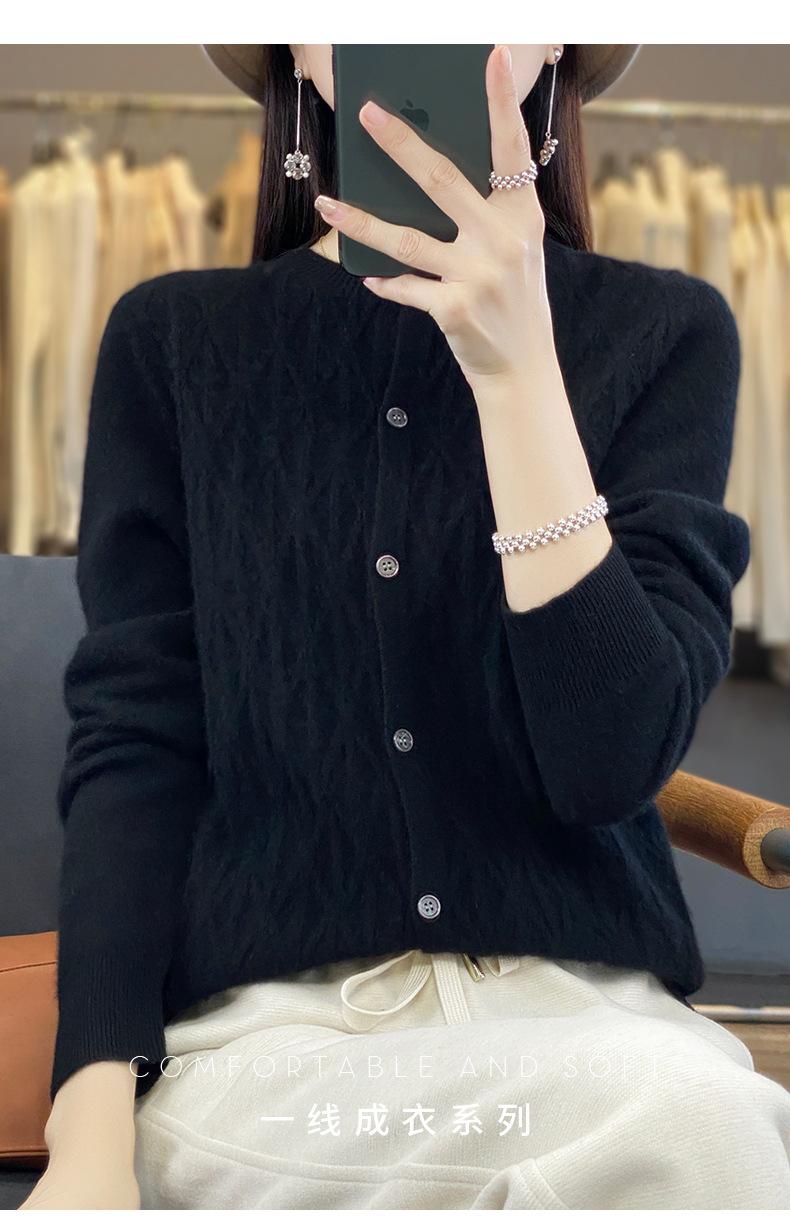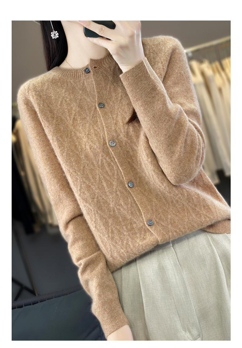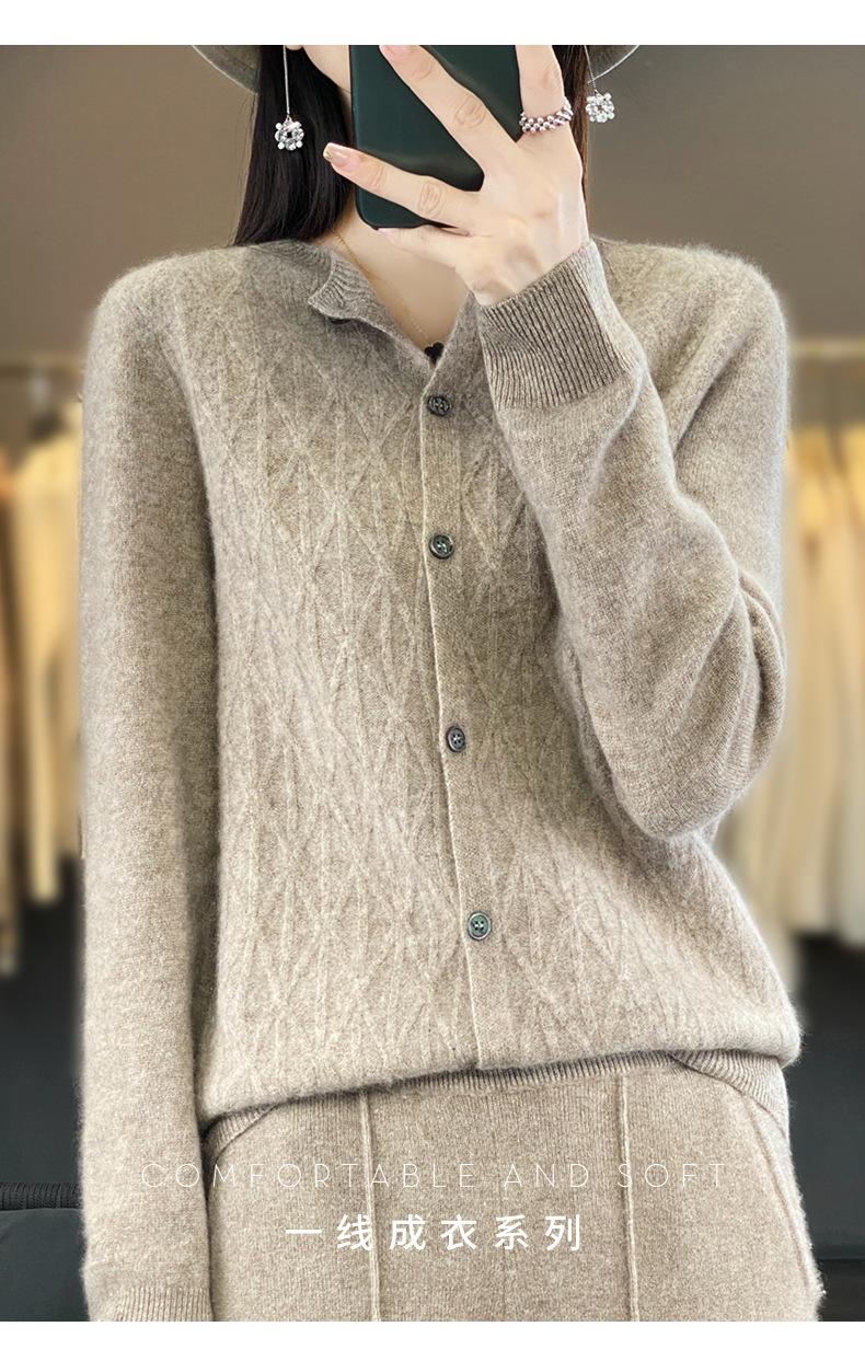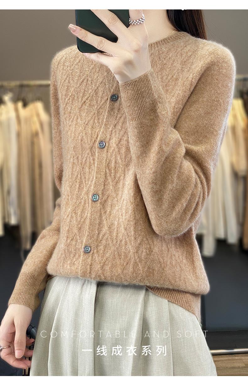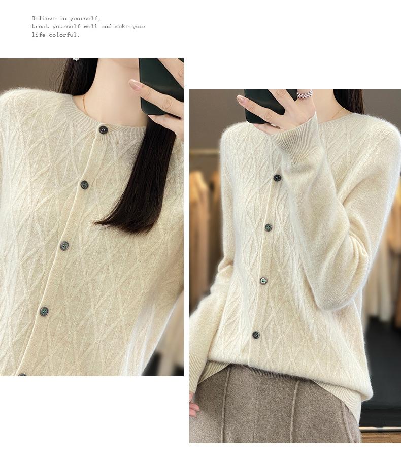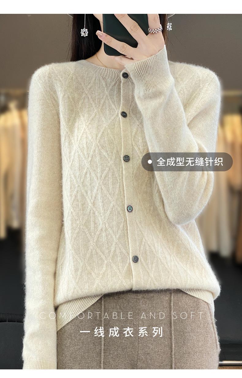 Top Elegante Suelto Jacquard Diamante para Mujer Otoño e Invierno 2025 Nuevo Lana Cuello Redondo Cárdigan Tejido Manga Larga
