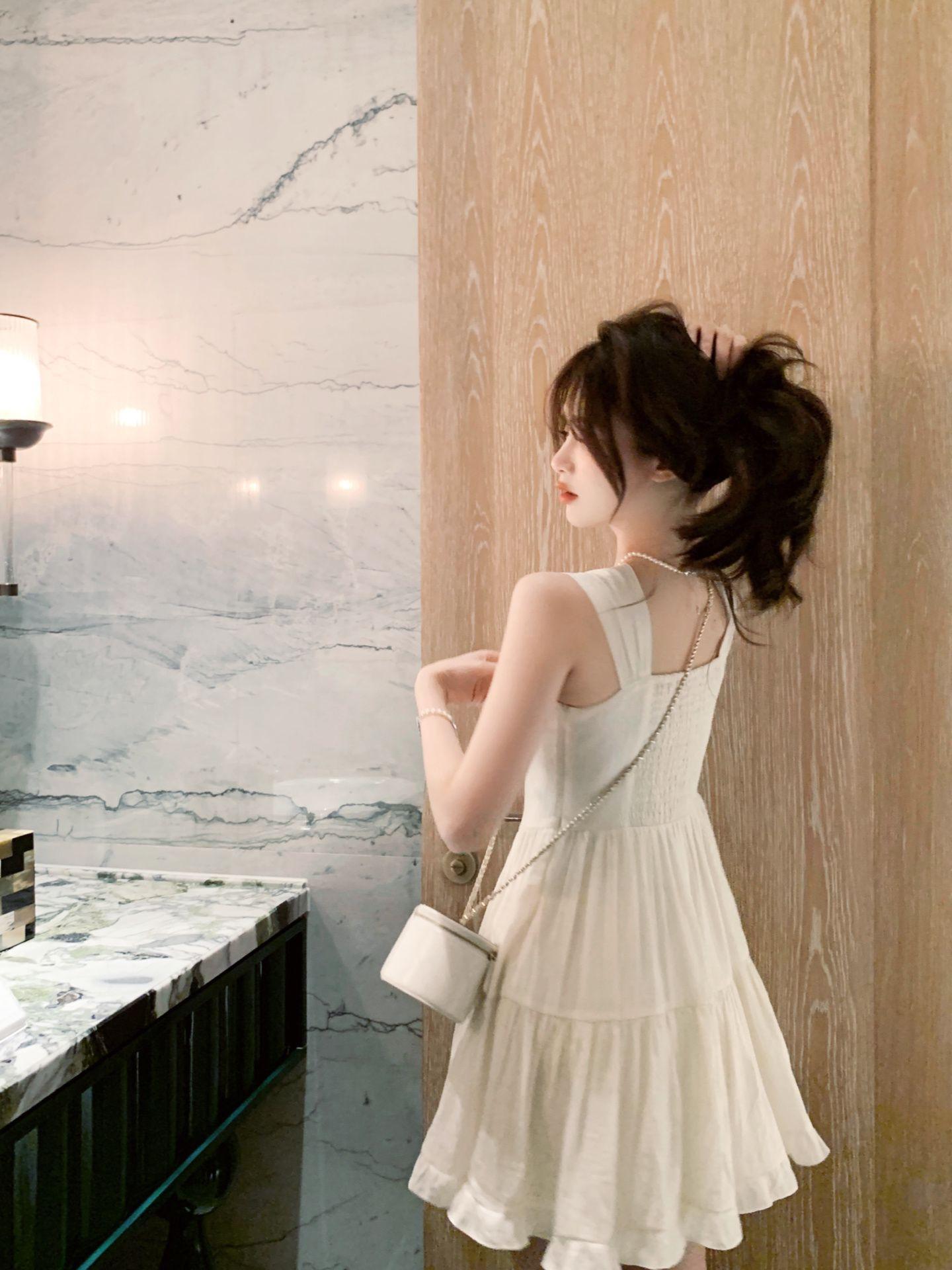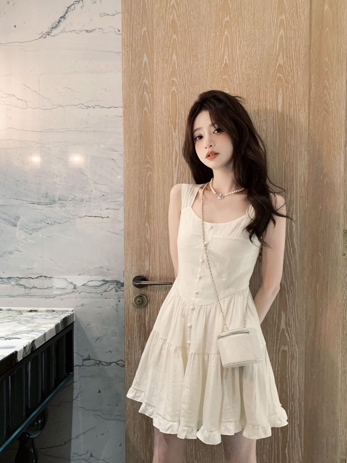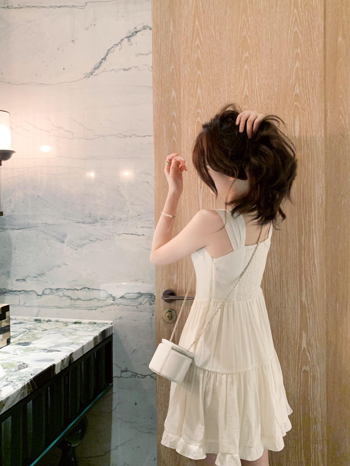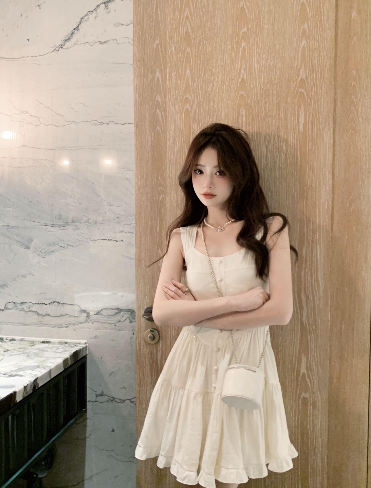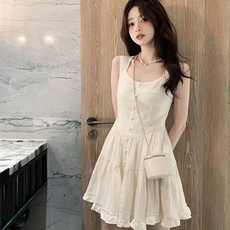 Vestido de Verano Dulce y Femenino sin Mangas Vacaciones Junto al Mar Estilo Suave Falda Corta Vestido de Moda