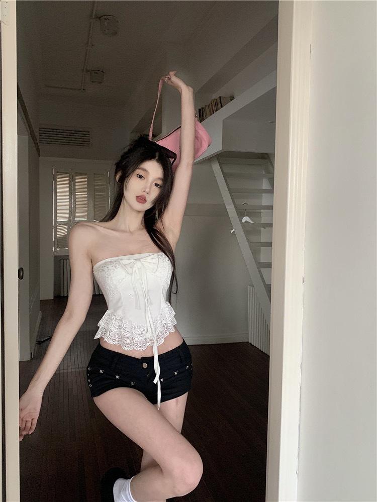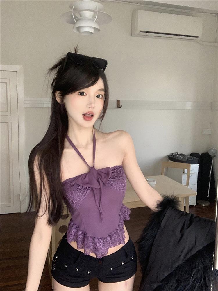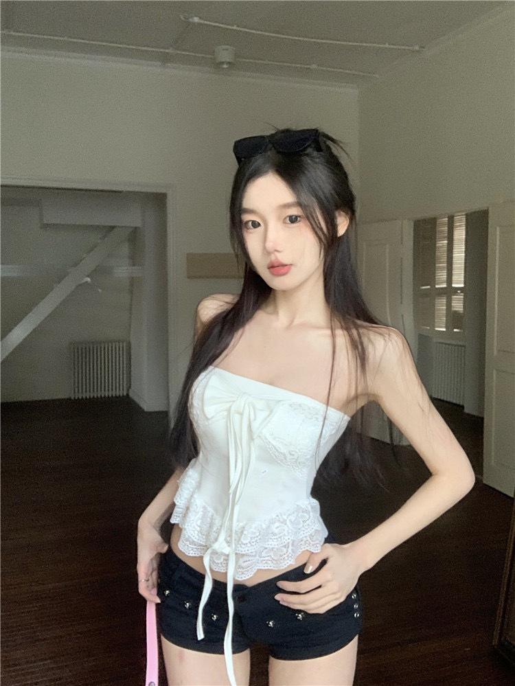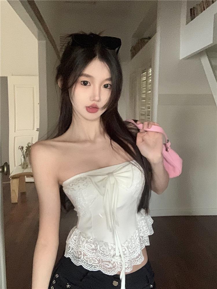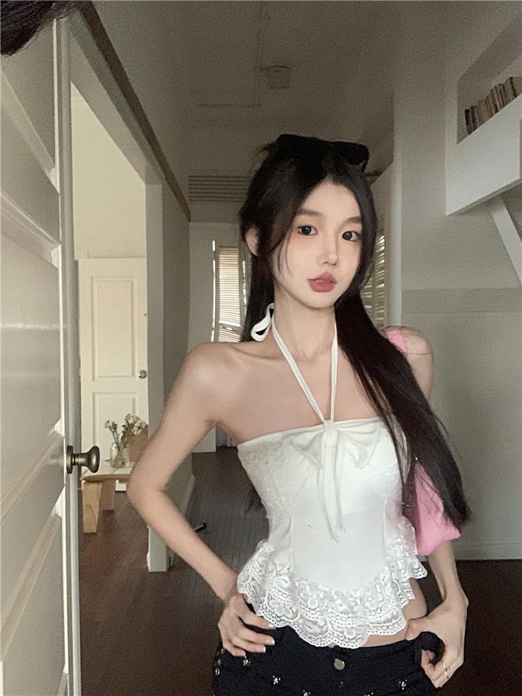 Verano Estilo Caliente Adelgazante Top Corto de Tubo para Chica Caliente Encaje Halter Camisola para Mujer Dulce Lazo Francés
