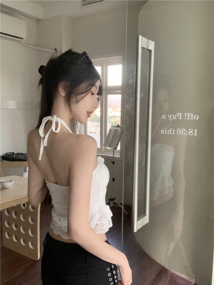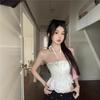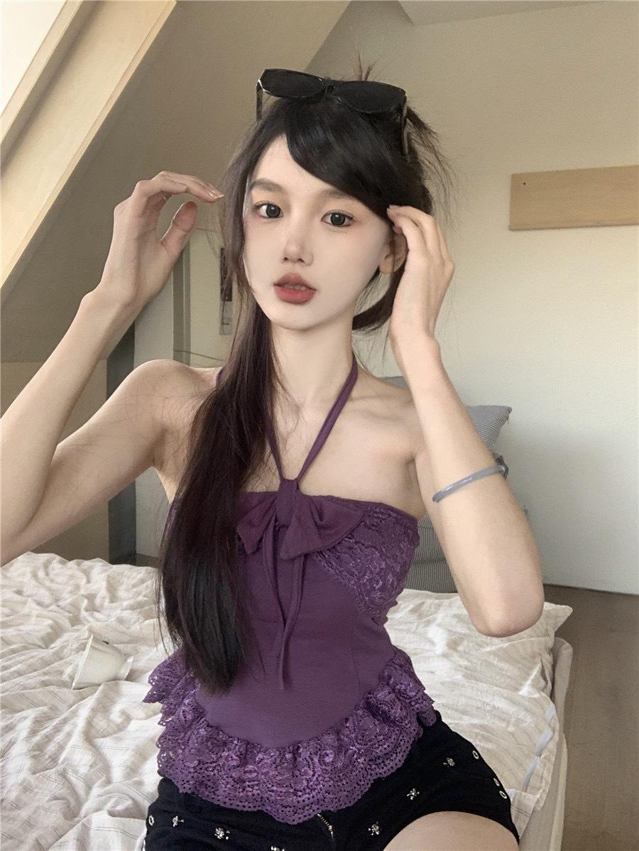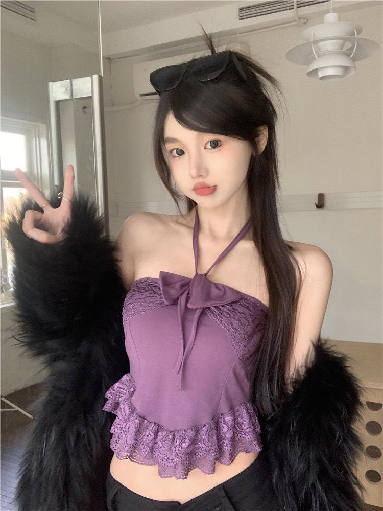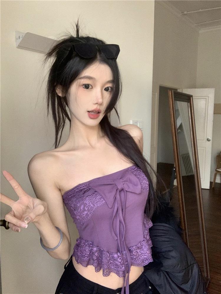 Verano Estilo Caliente Adelgazante Top Corto de Tubo para Chica Caliente Encaje Halter Camisola para Mujer Dulce Lazo Francés