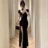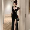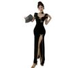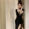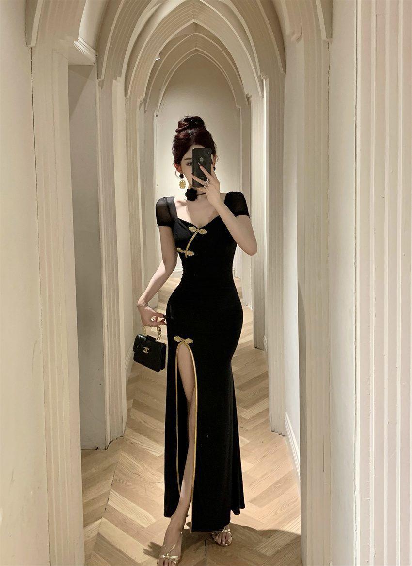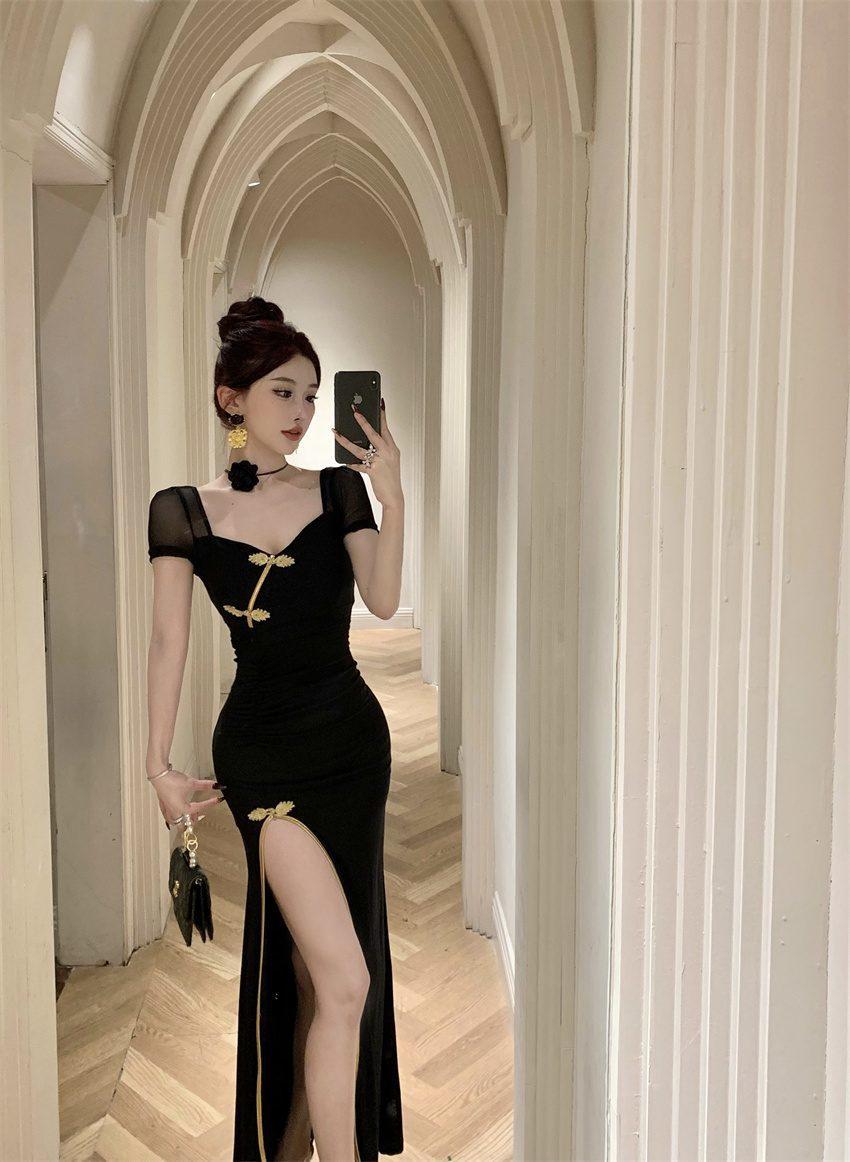 Vestido/Cuello Cuadrado Floral Escote Bajo Adelgazante Bodycon Falda Verano Estilo Retro Cheongsam Mejorado Vestido con Abertura