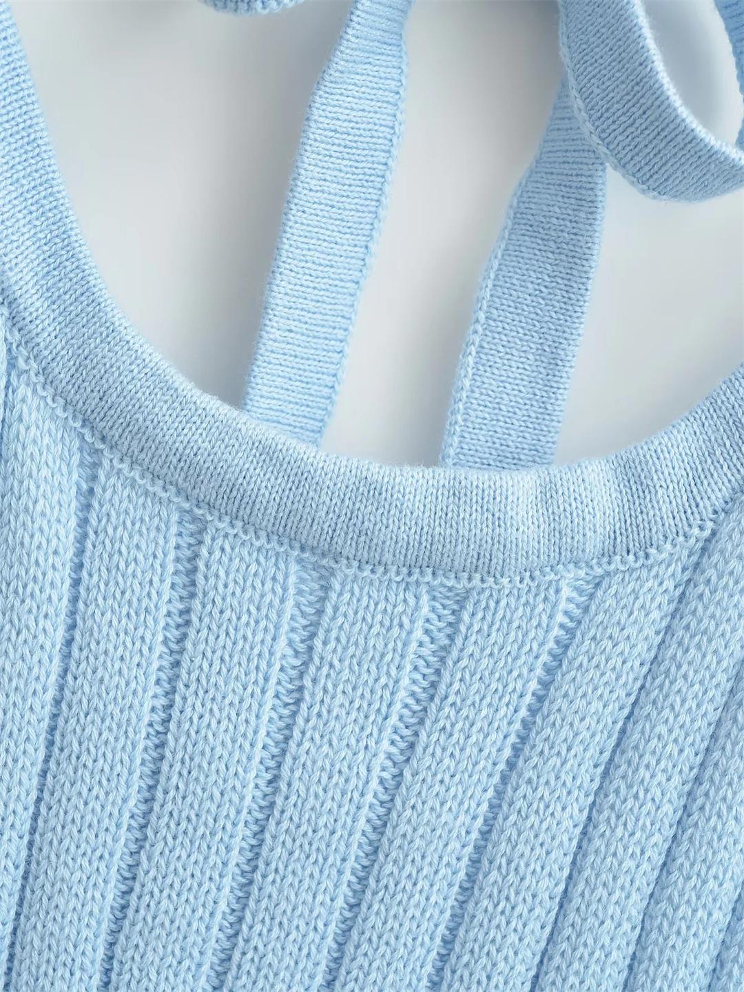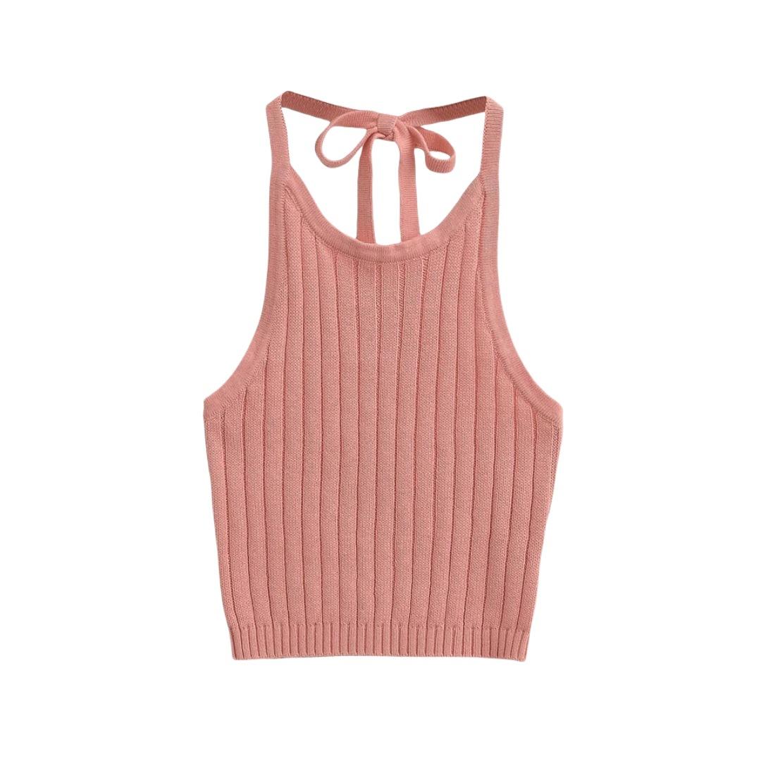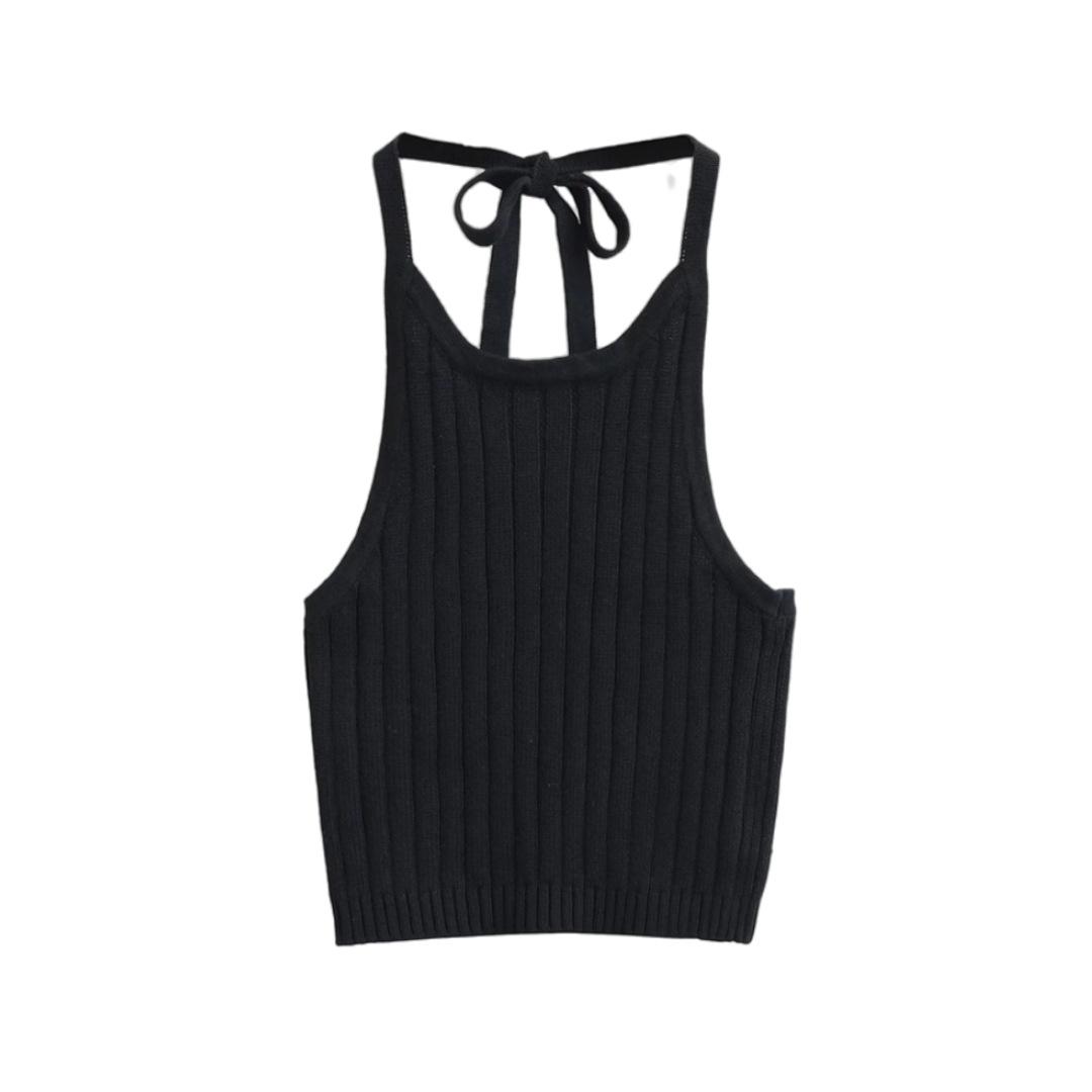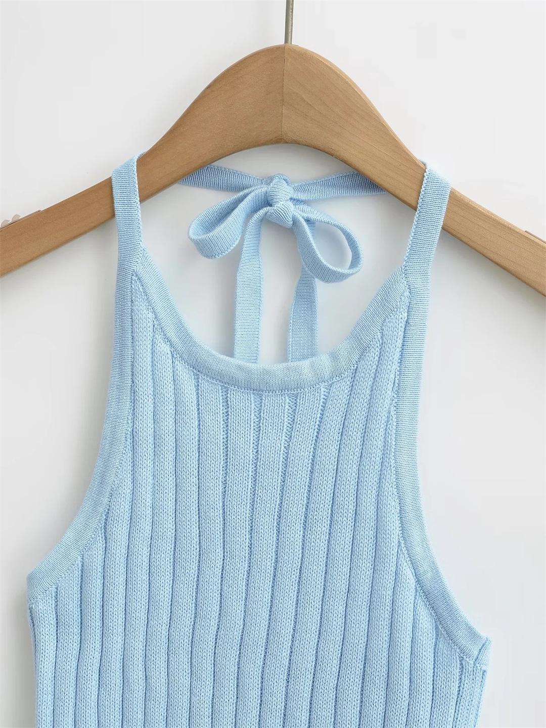 Estilo Europeo y Americano Sexy Camisola de Punto con Cuello Halter Niche Ropa Exterior Sin Espalda Ultra Corta Top sin Mangas de Color Sólido
