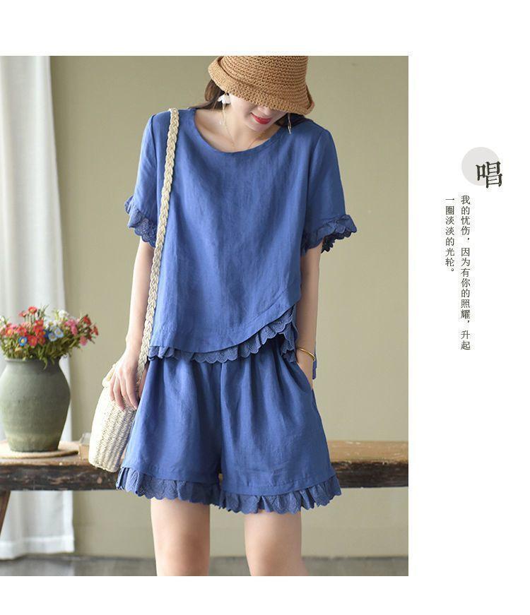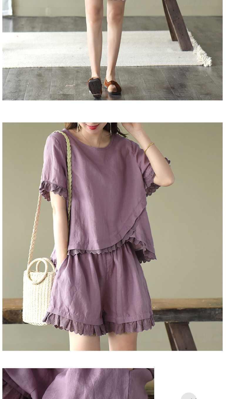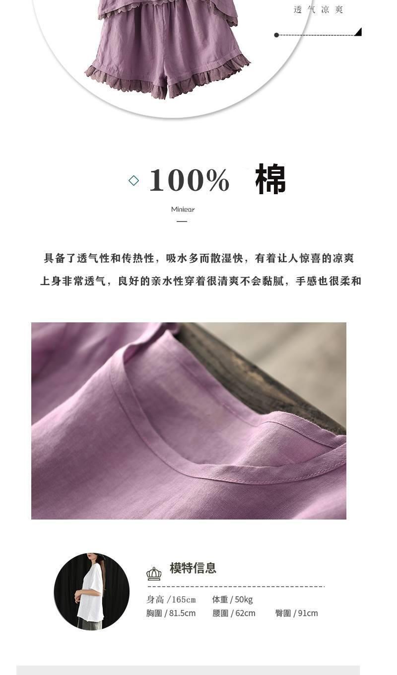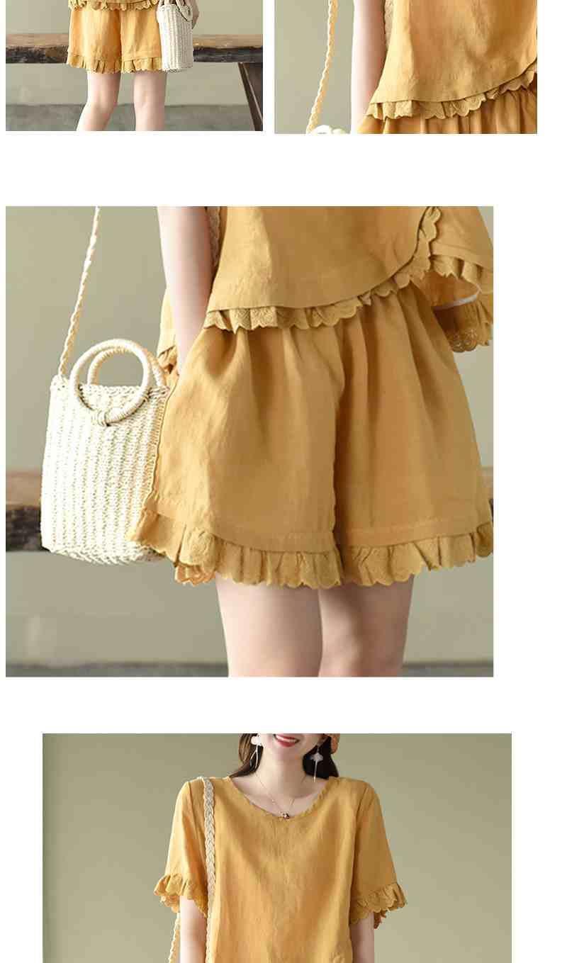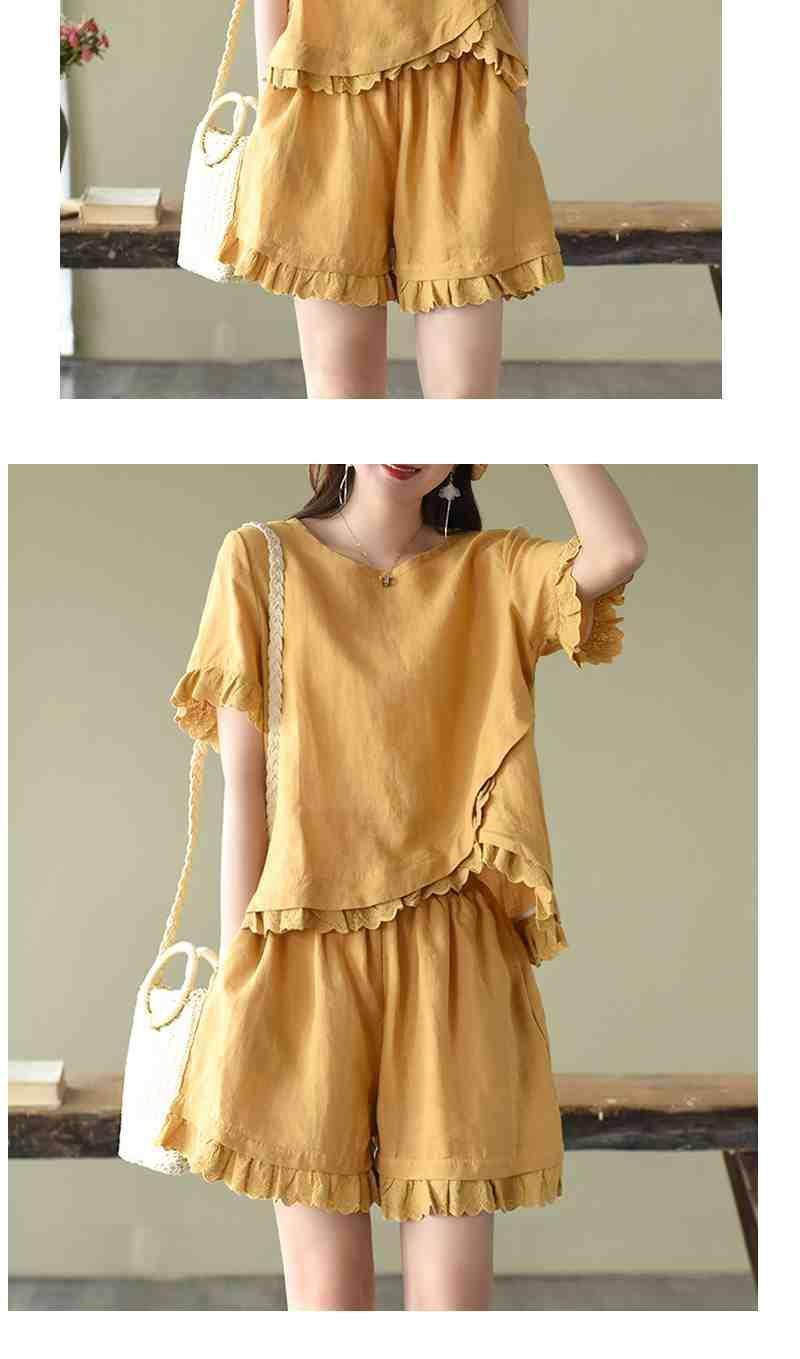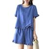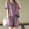 Verano Nuevo Algodón y Lino Traje Casual Moda para Mujer Camiseta Holgada Shorts de Pierna Ancha Color Puro Conjunto de Dos Piezas