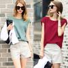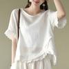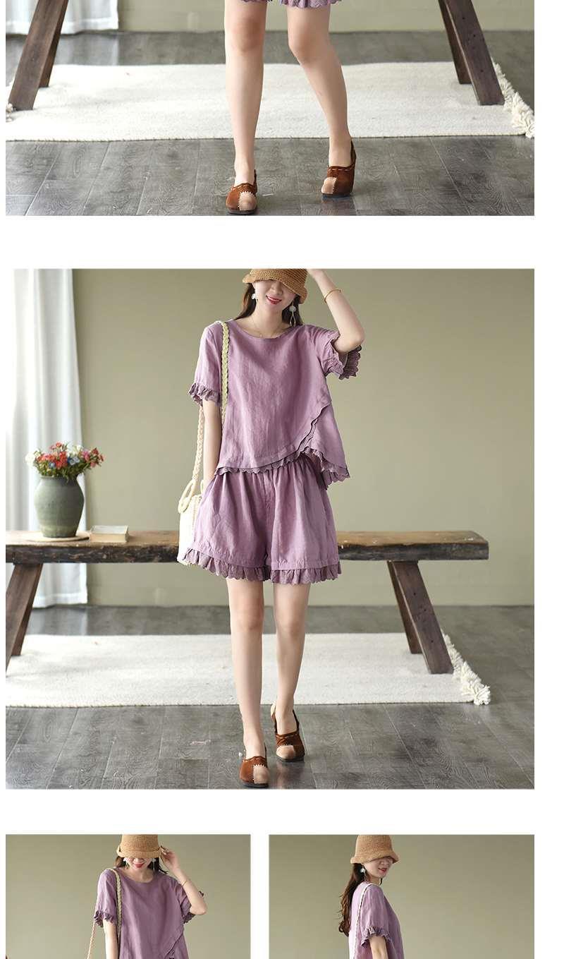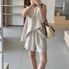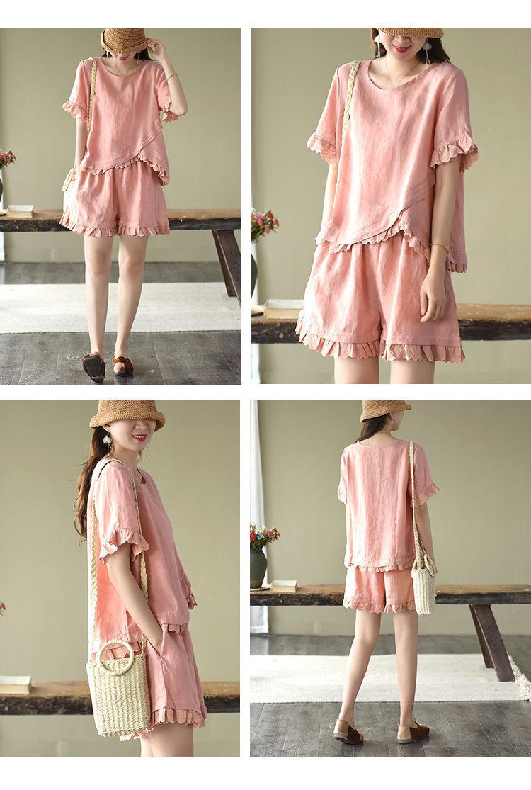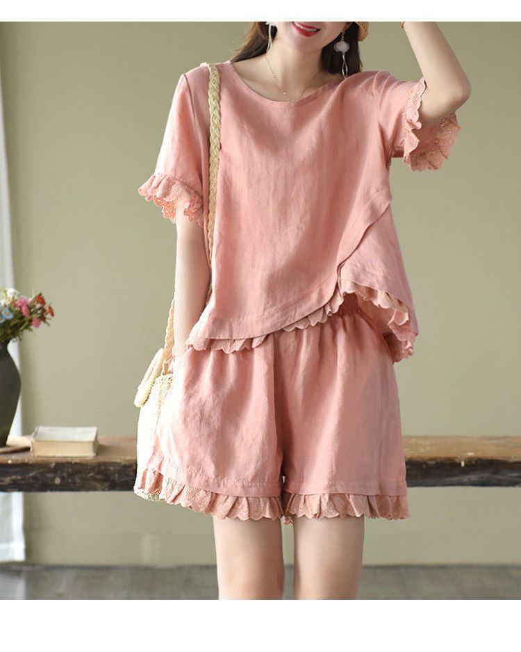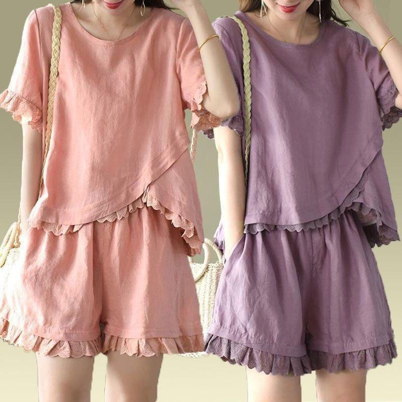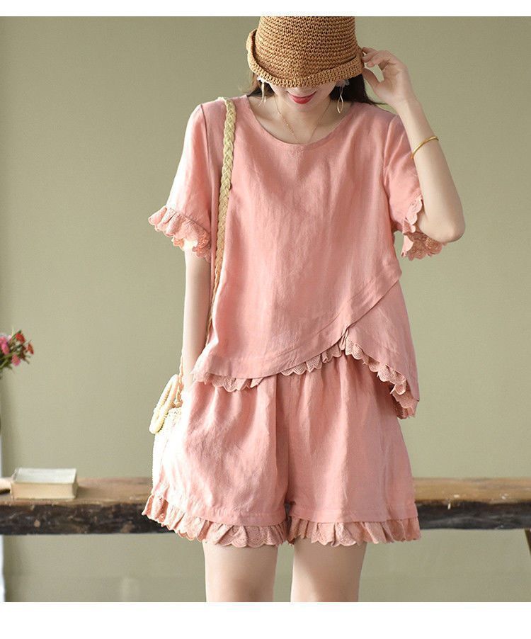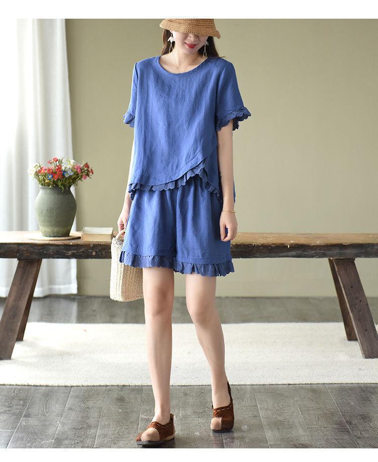 Verano Nuevo Algodón y Lino Traje Casual Moda para Mujer Camiseta Holgada Shorts de Pierna Ancha Color Puro Conjunto de Dos Piezas