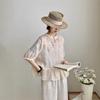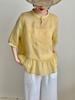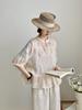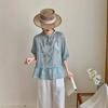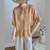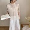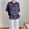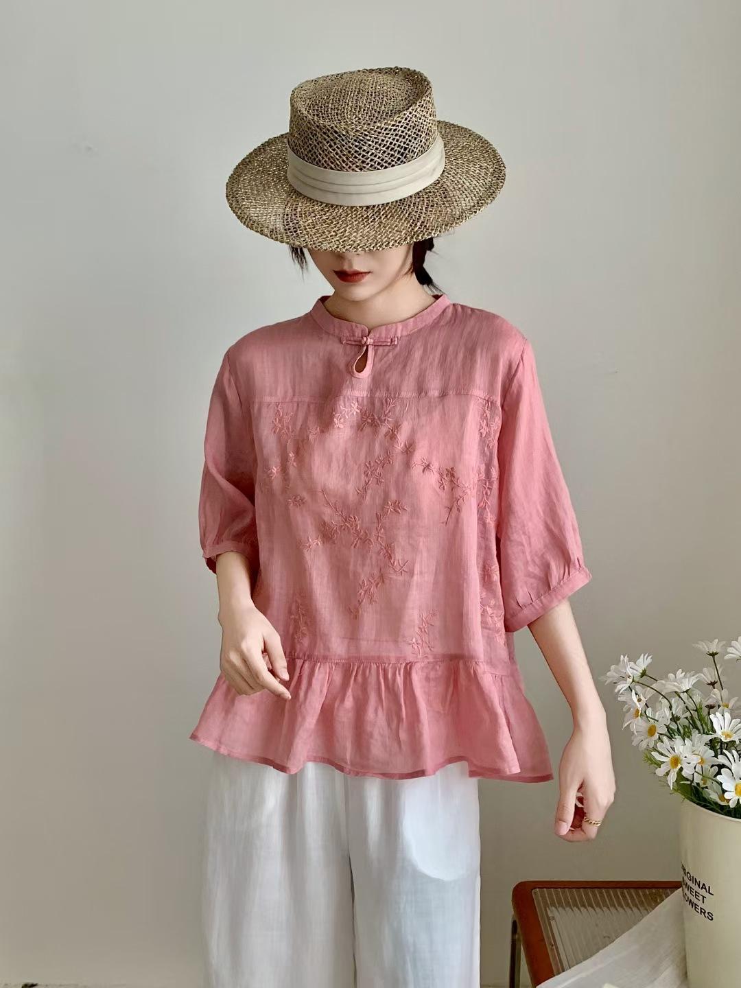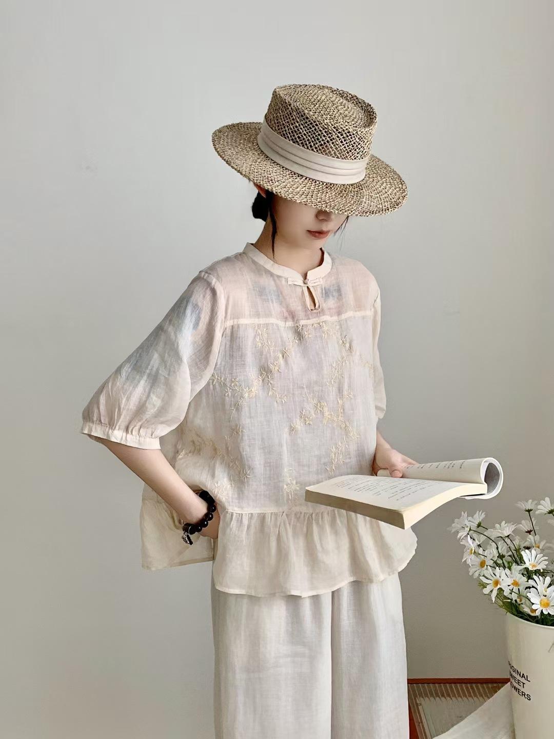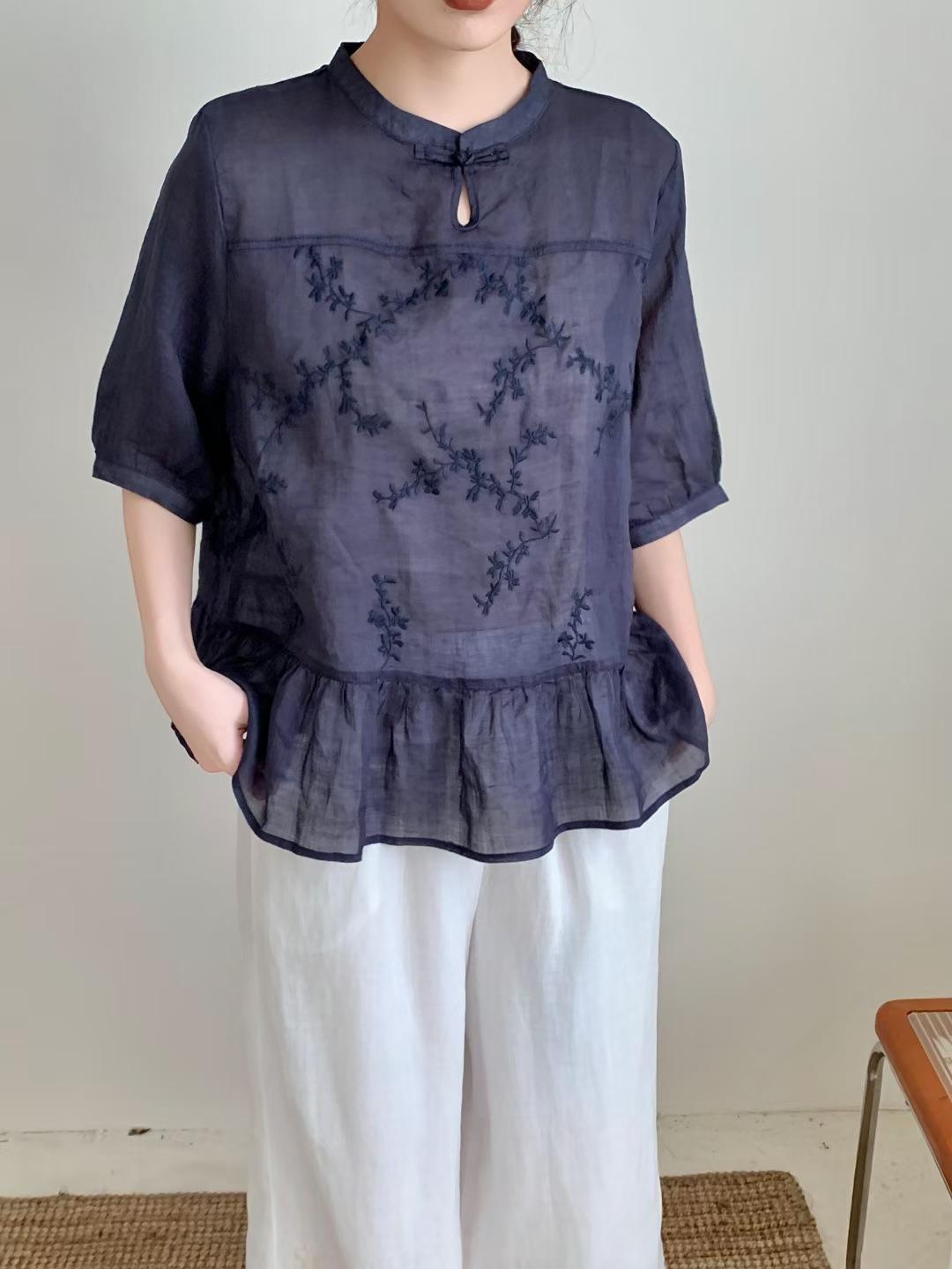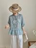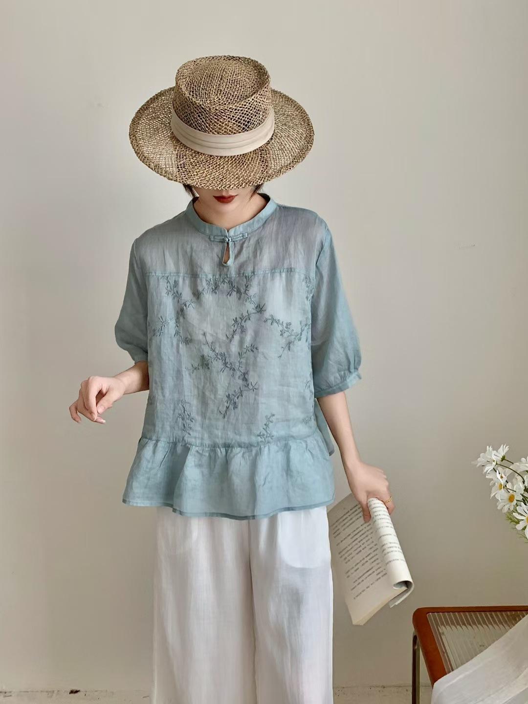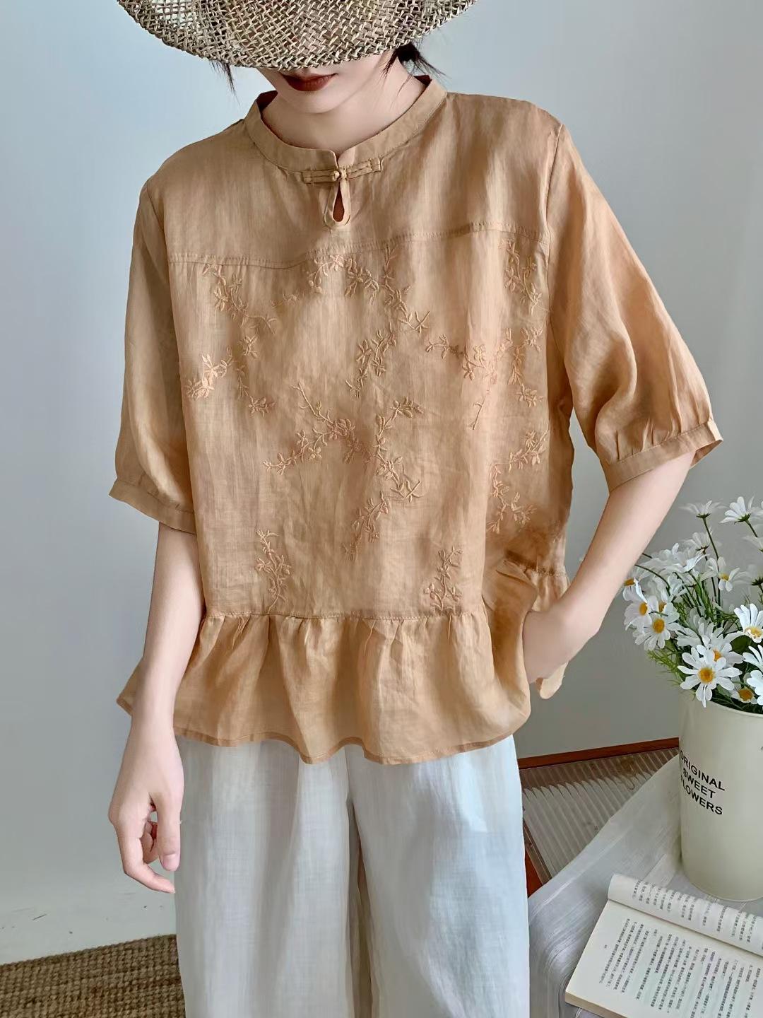 Camisa de Ramio Bordada 2025 Verano Nuevo Estilo Estilo Artístico Color Sólido Cuello Mao Botones Manga Corta