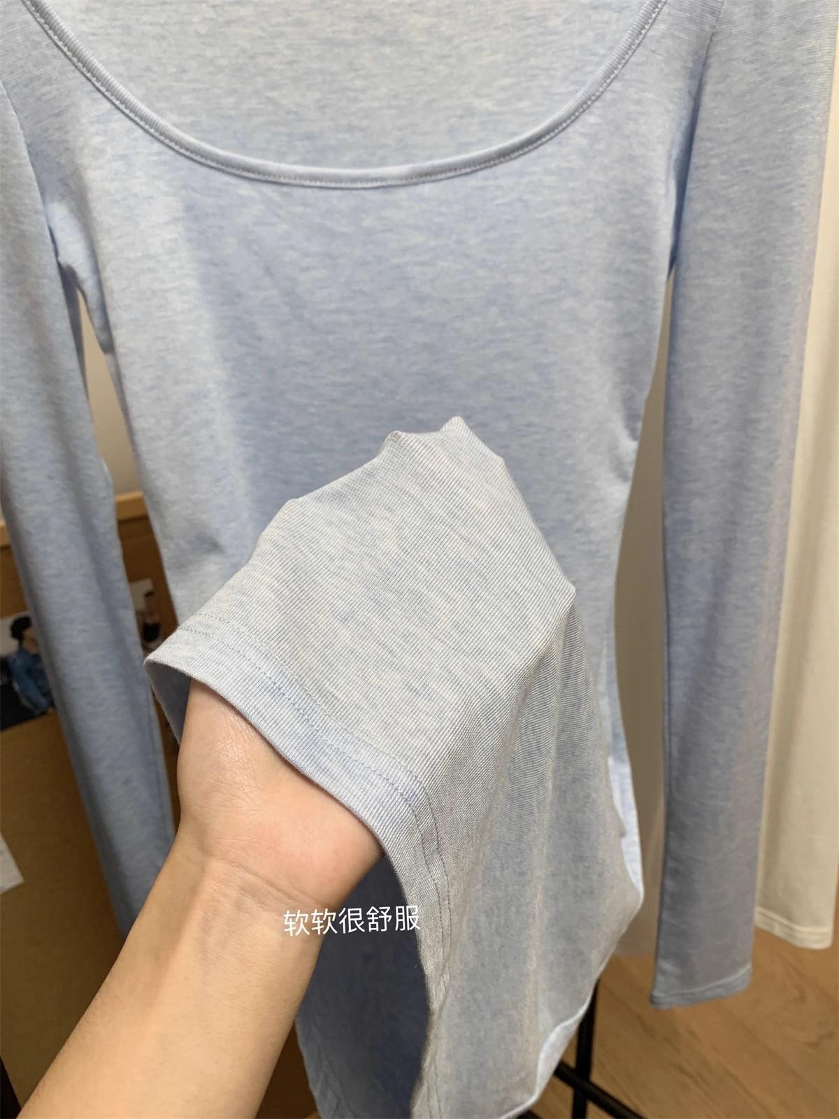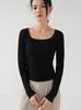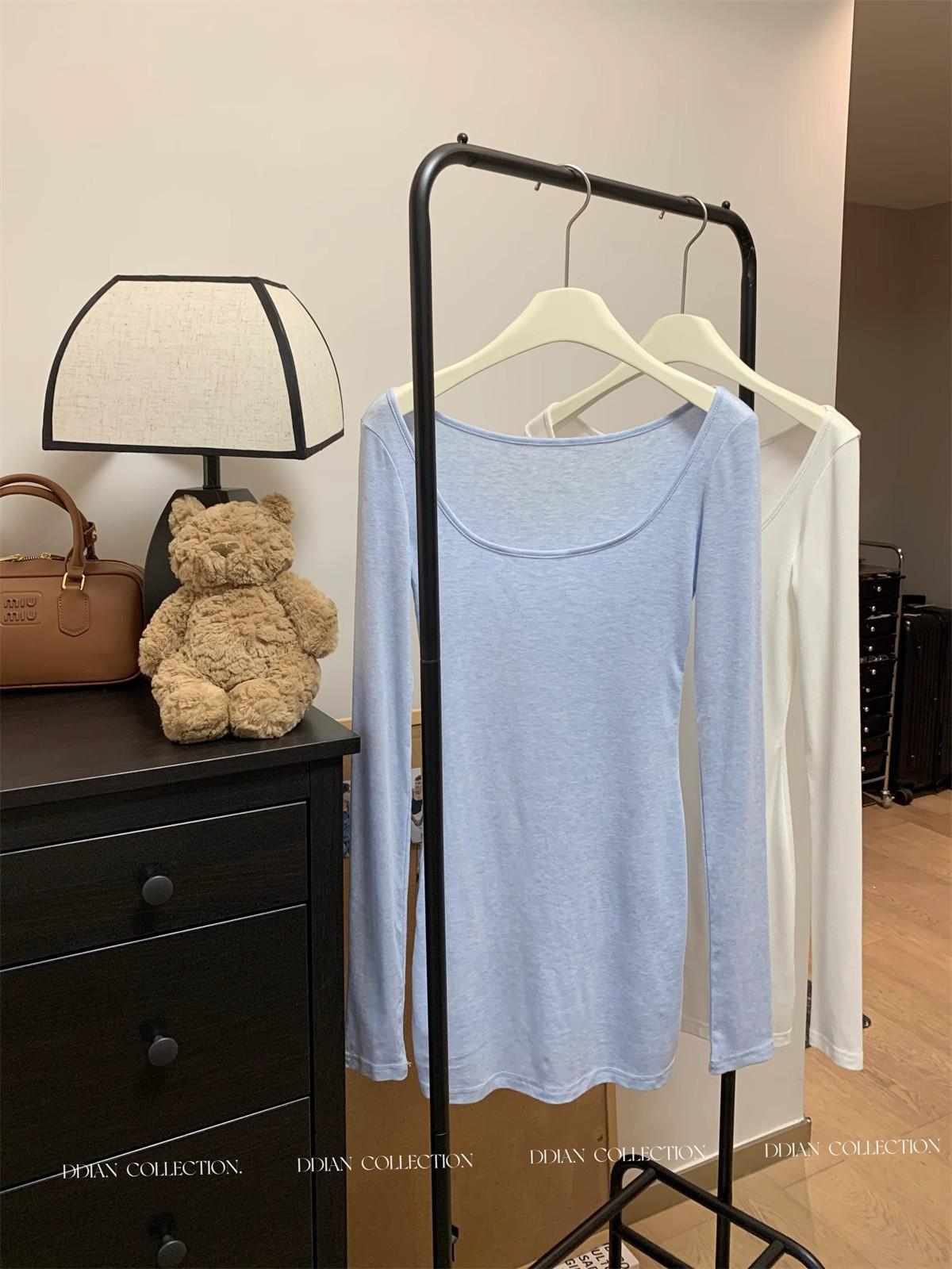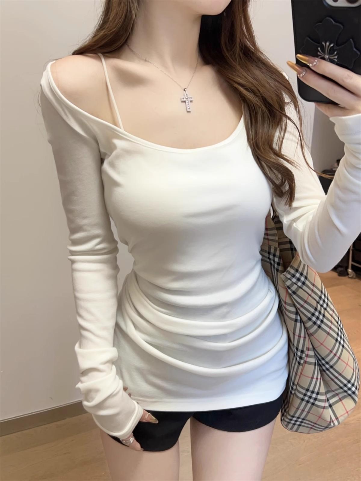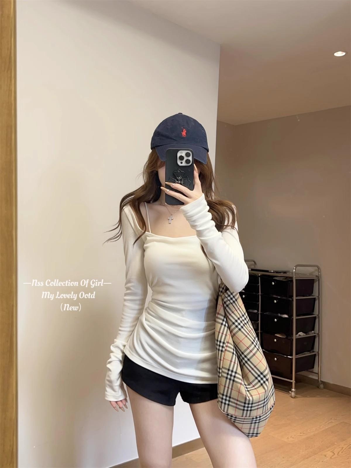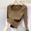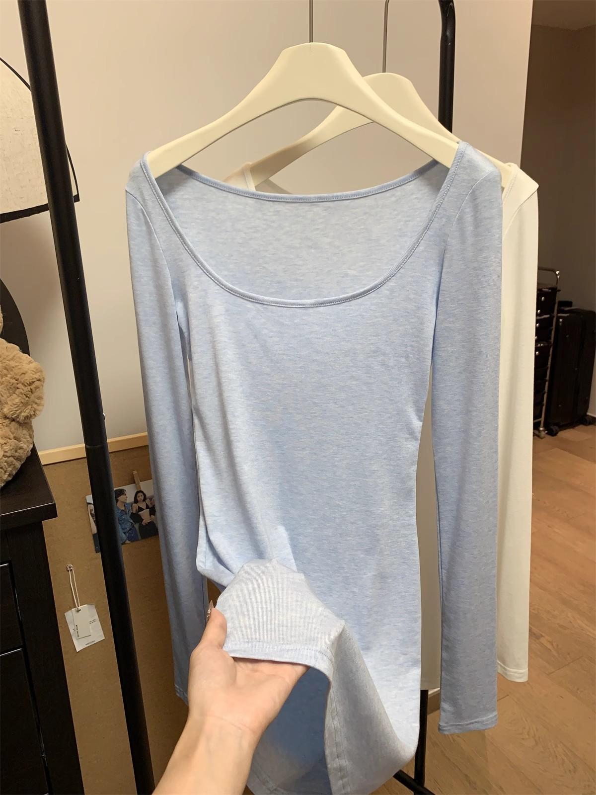 Playera Blanca Pura de Cuello Cuadrado y Manga Larga para Mujer, Primavera, Corte Ajustado, Adelgazante, con Hombros Descubiertos, Camiseta Básica Chic, Dulce, Picante, Top Interior