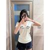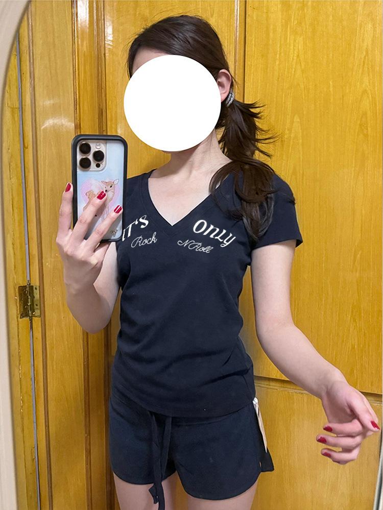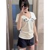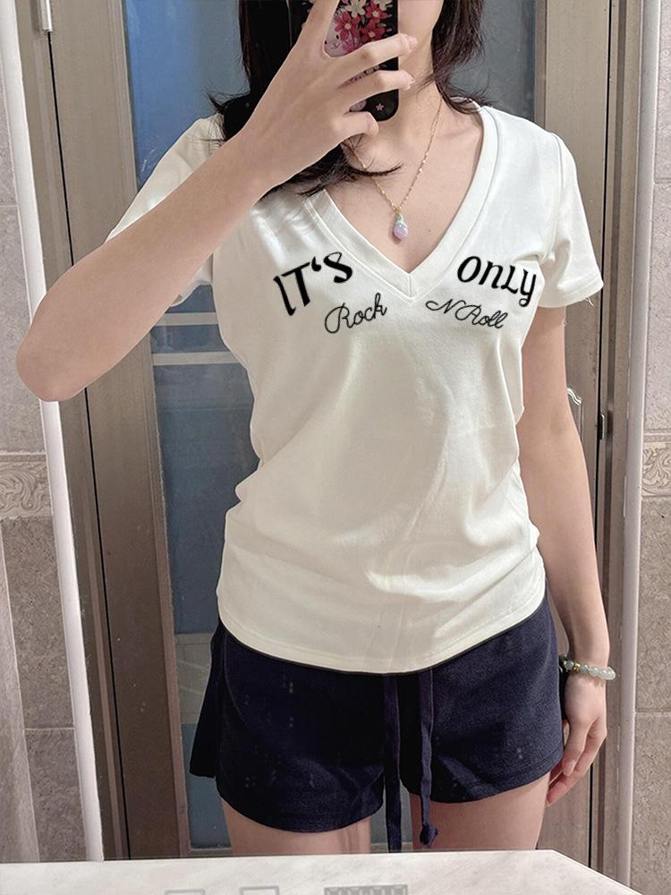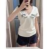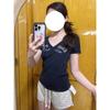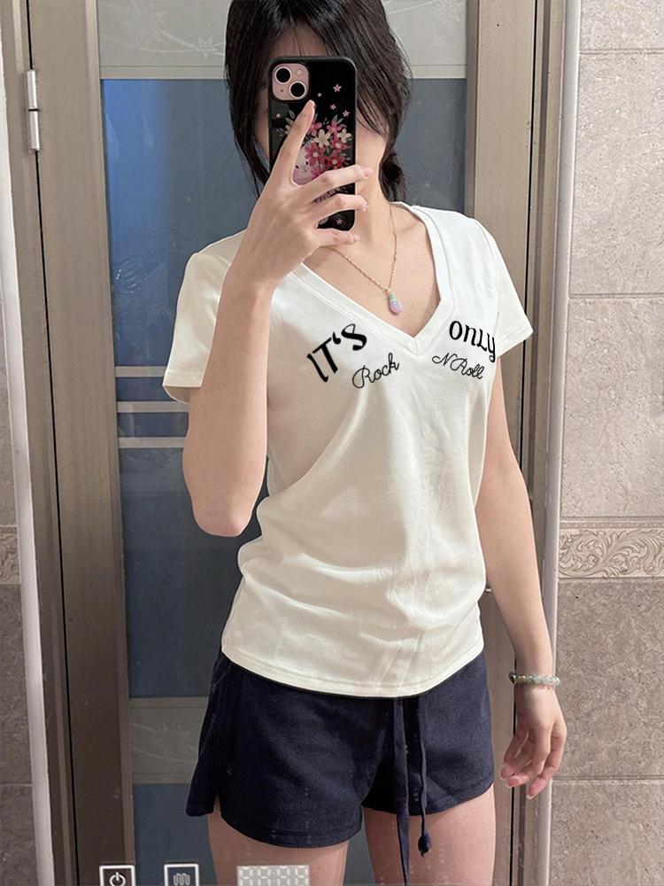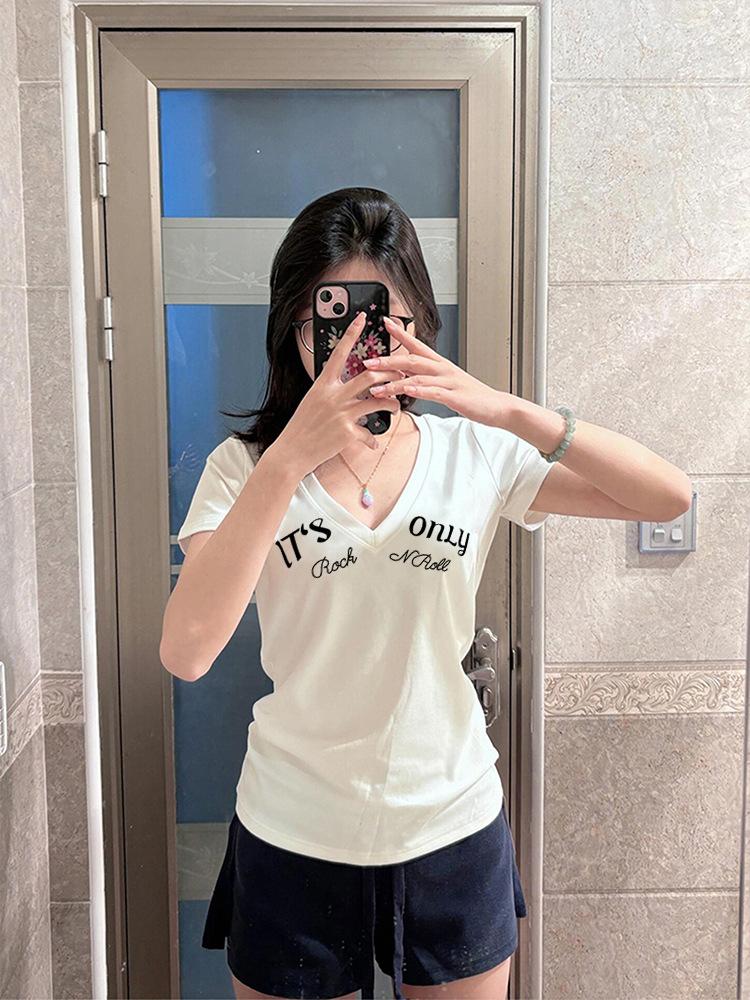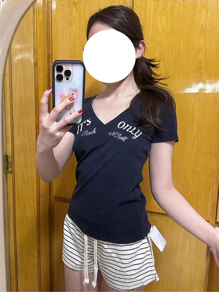 Camiseta de Manga Corta con Cuello en V Estilo Chica Caliente para Mujer Verano 2025 Nueva Deseo Puro Hombro Derecho Look Adelgazante Top Ajustado a la Cintura Trendy