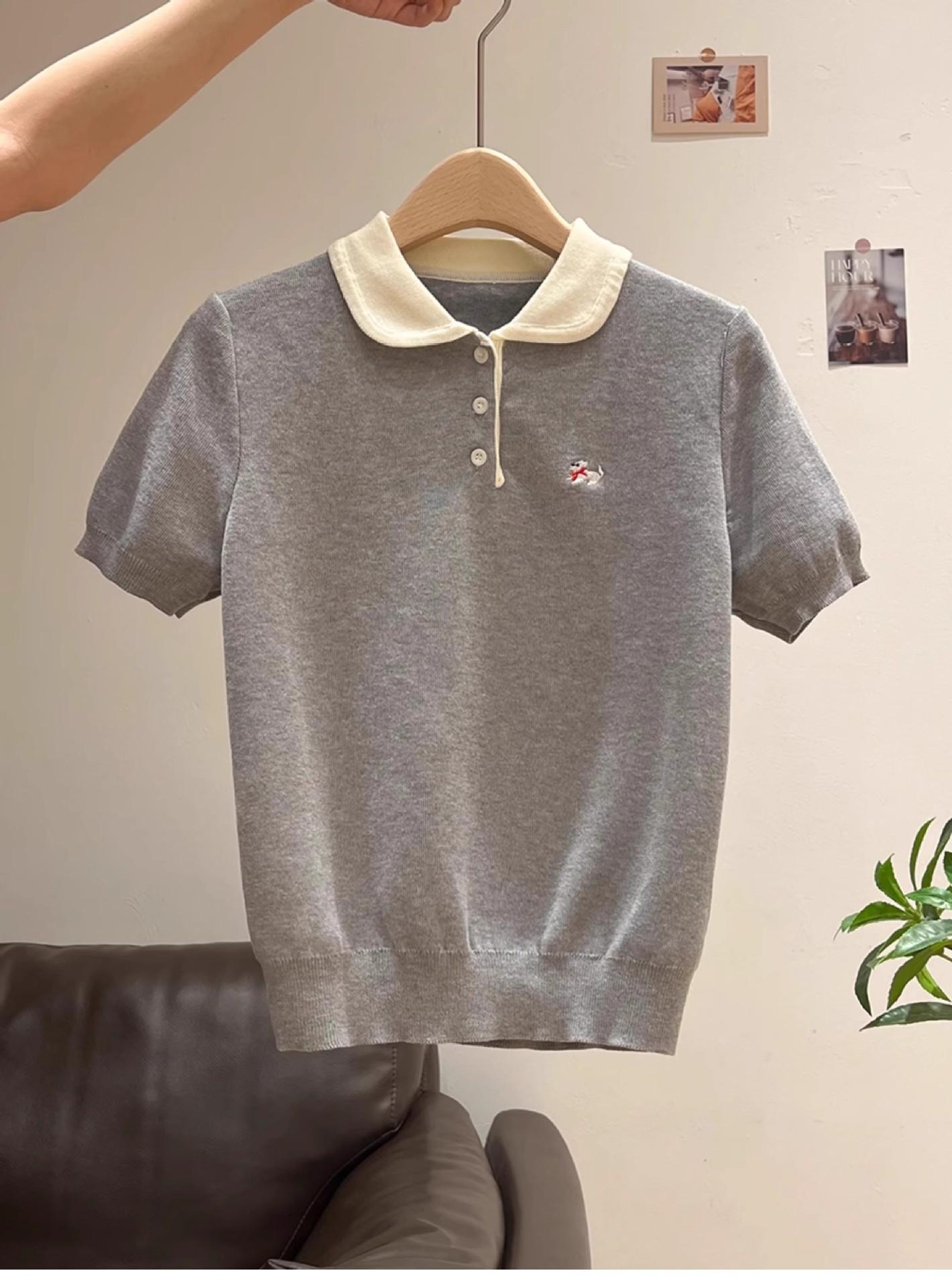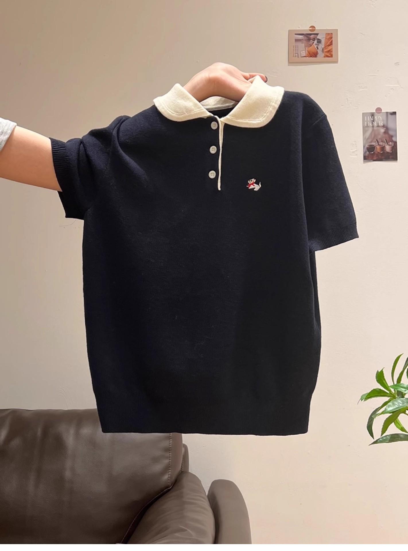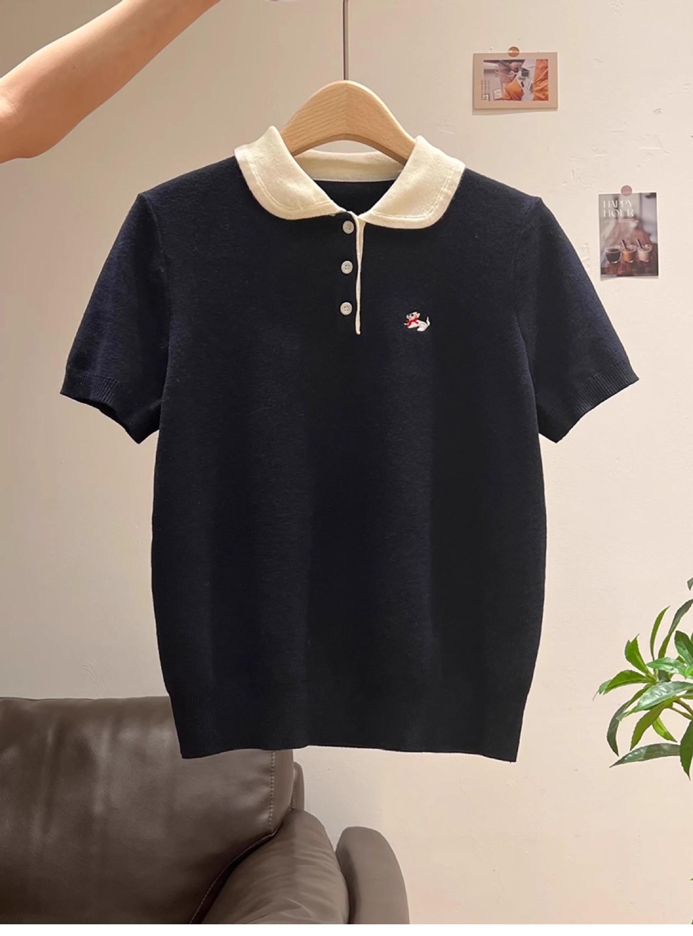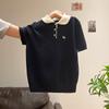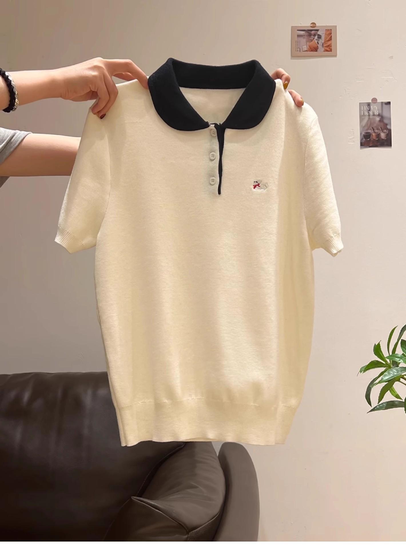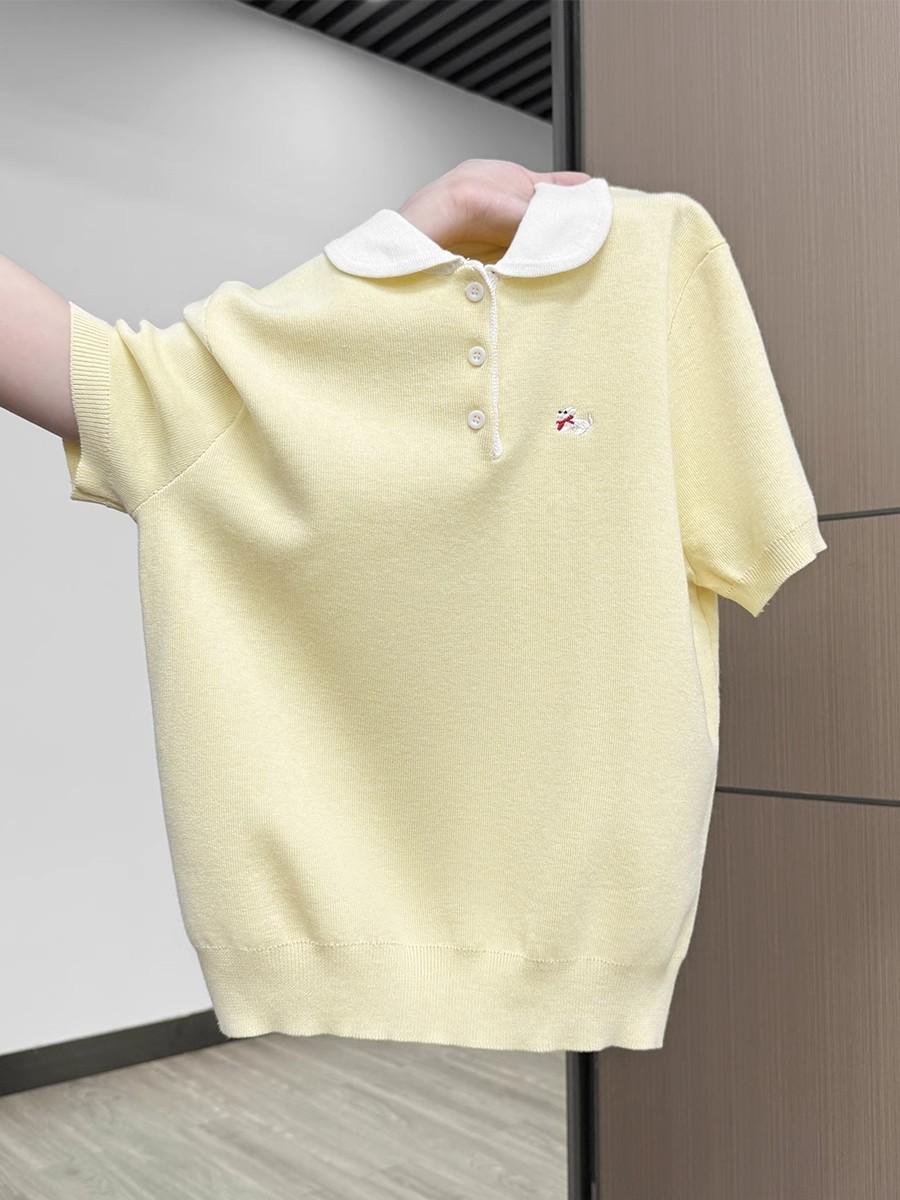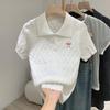 Suéter Polo de Punto Bordado para Mujer Verano Nuevo Jersey de Botones Top de Manga Corta con Hombro Derecho Descubierto
