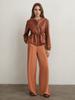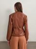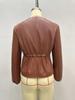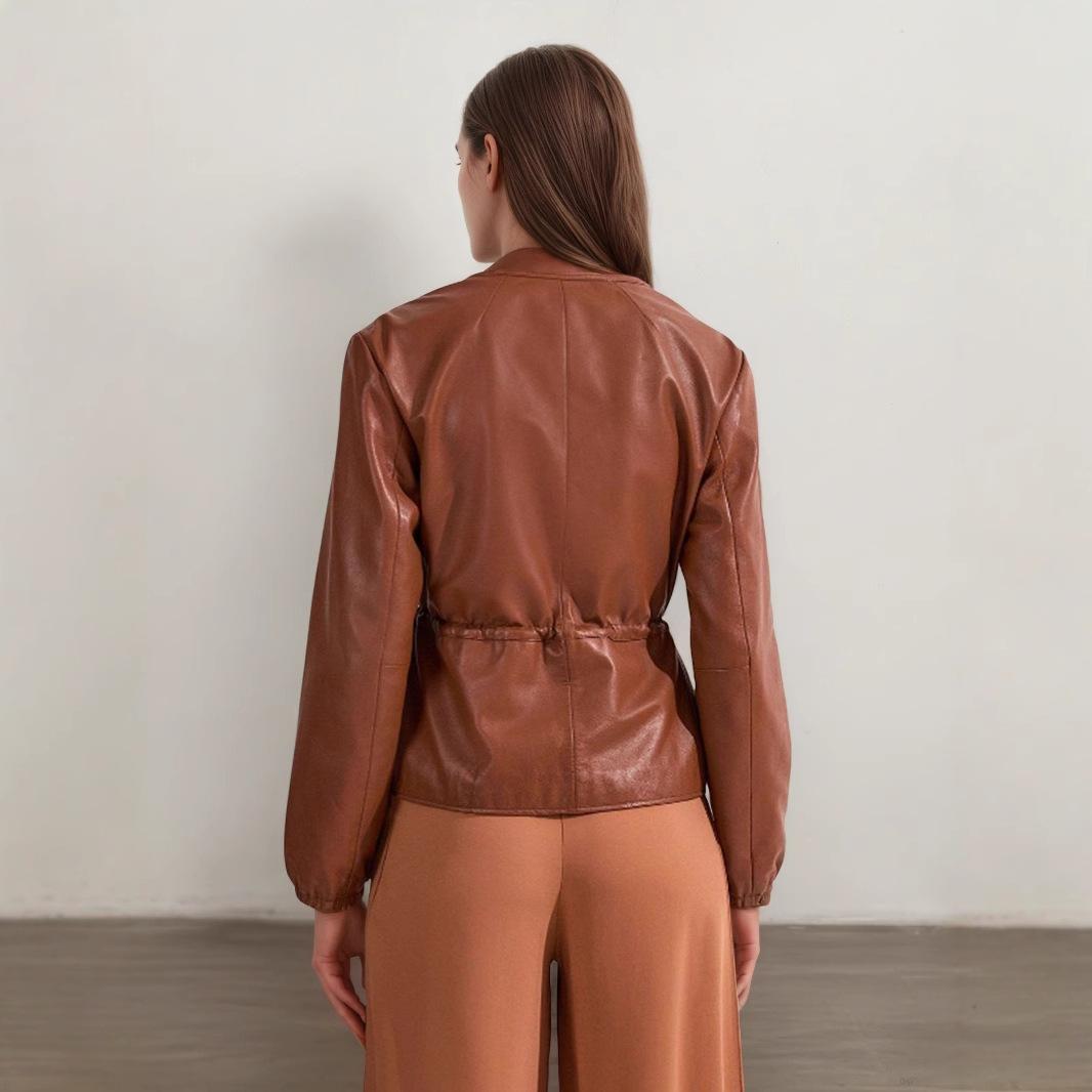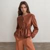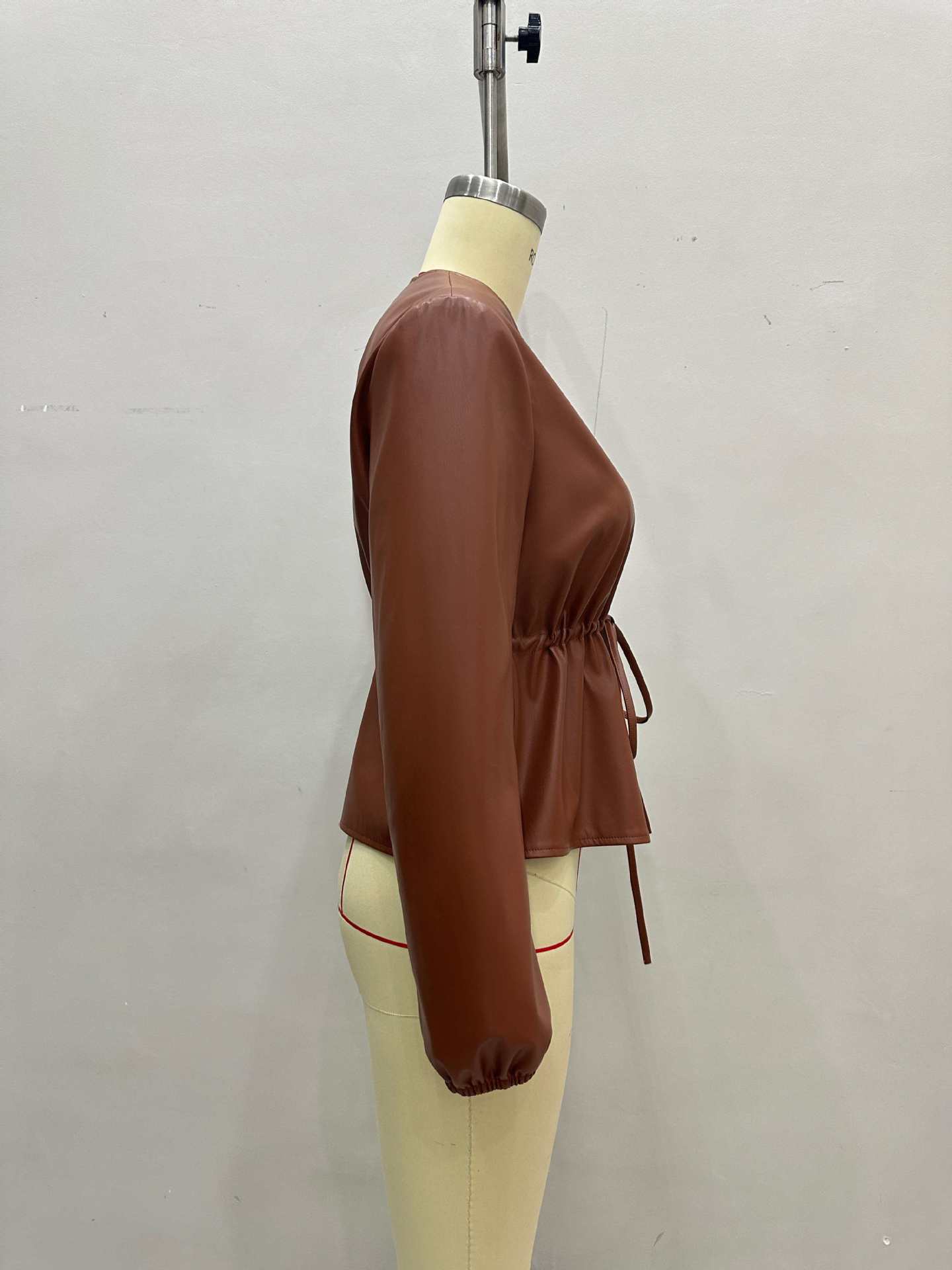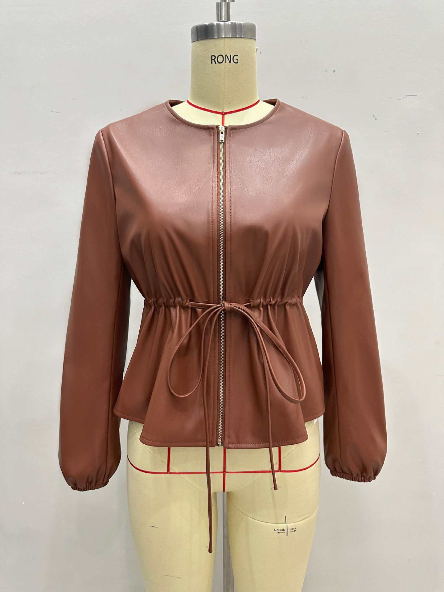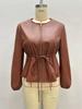 Moda Europea y Americana Cuello Redondo Marrón Cordón Cintura Plisada Adelgazante Diseño Versátil Chaqueta Corta de Cuero de Manga Larga