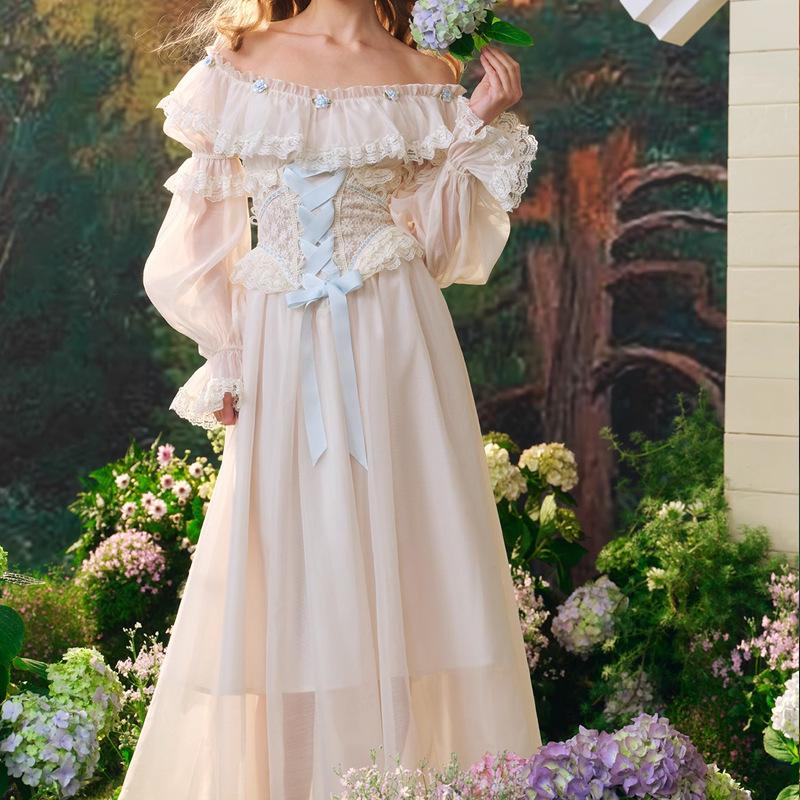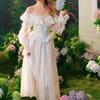 LaceMa Hortensia Azul Falda de Hada Estilo Francés Hombro Descubierto Blanco Vestido Largo Encaje Falda de Espina de Pescado Manga Larga