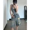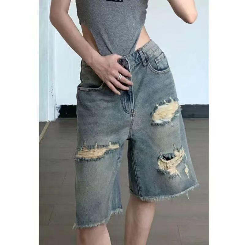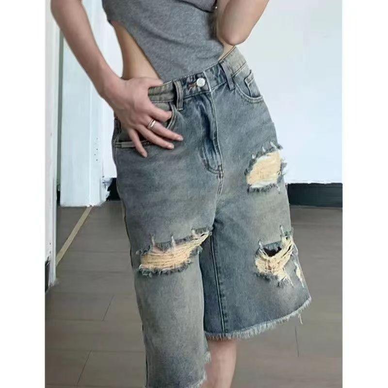 Vintage Versátil Cintura Alta Estilo Vibe Europeo y Americano Americano High Street Rotos Pantalones Cinco Puntos Jeans Rectos para Mujer Ins Trend