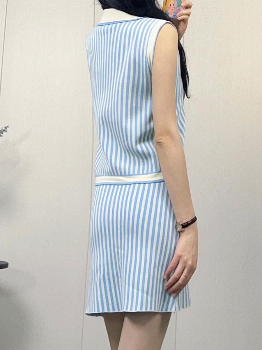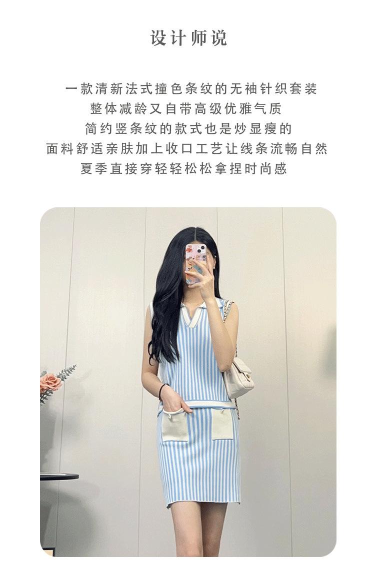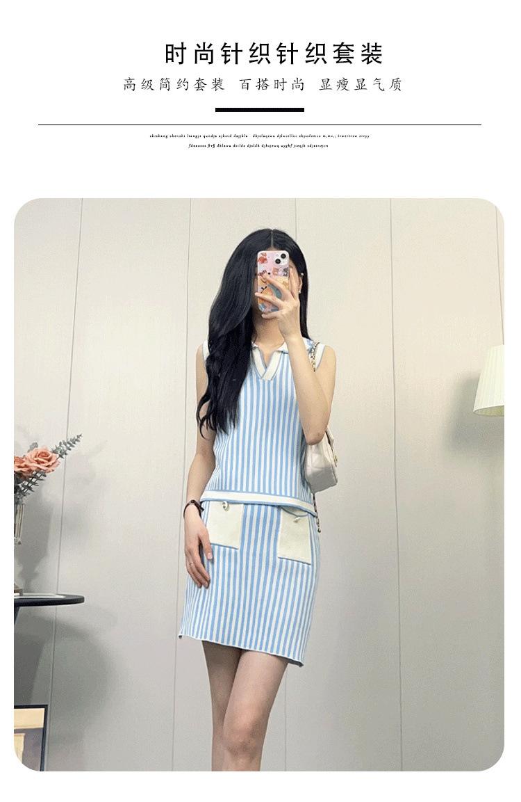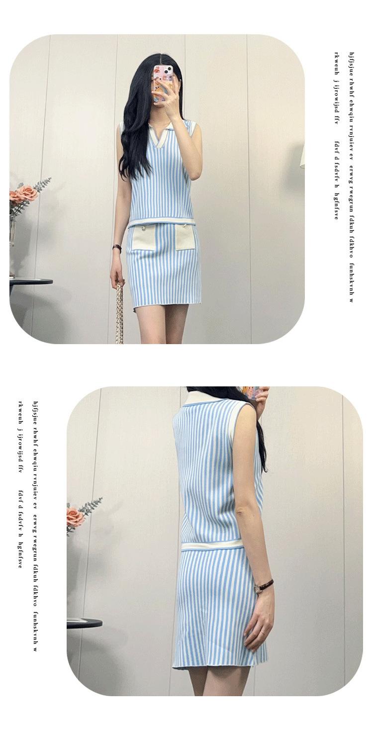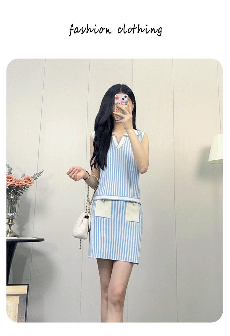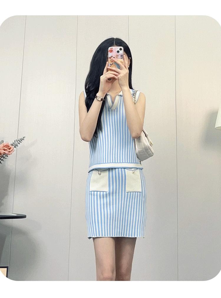 Traje de punto a rayas azules y blancas nuevo 2025 para mujer, fresco y rejuvenecedor, top sin mangas con solapa, falda, conjunto de dos piezas
