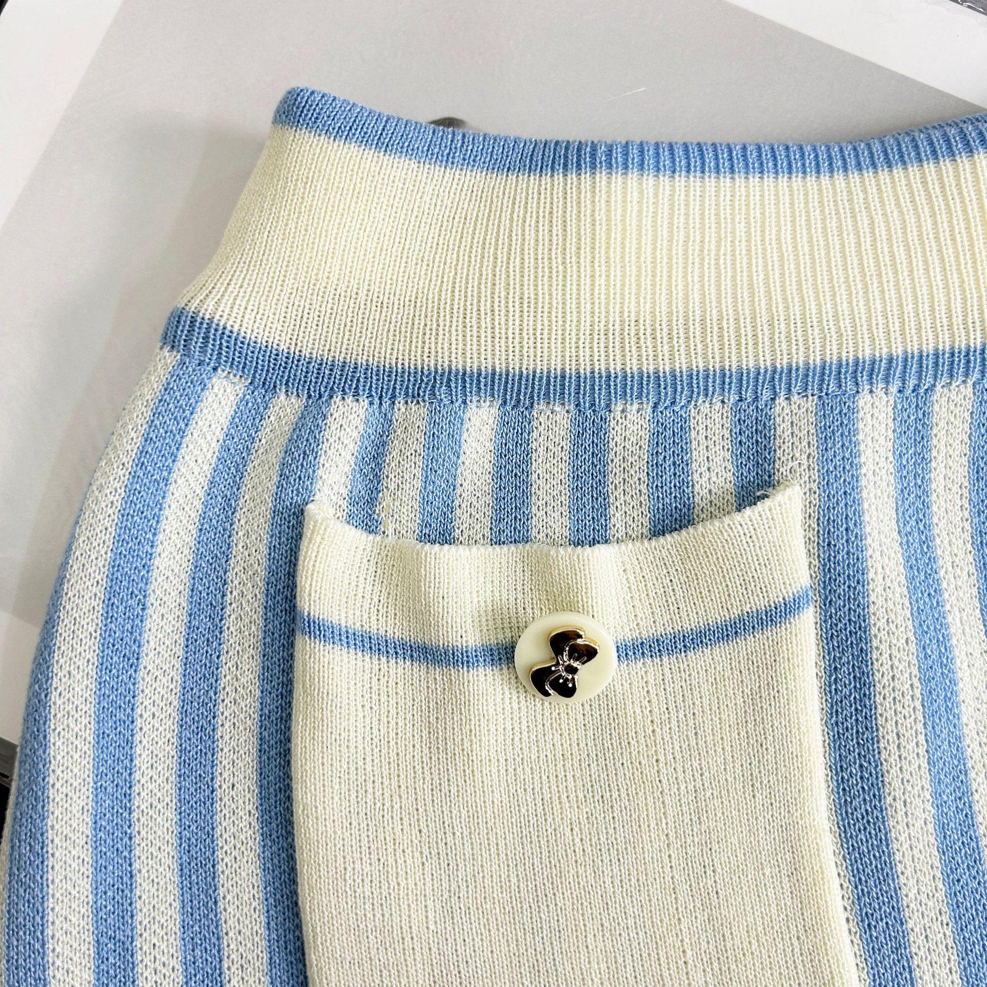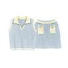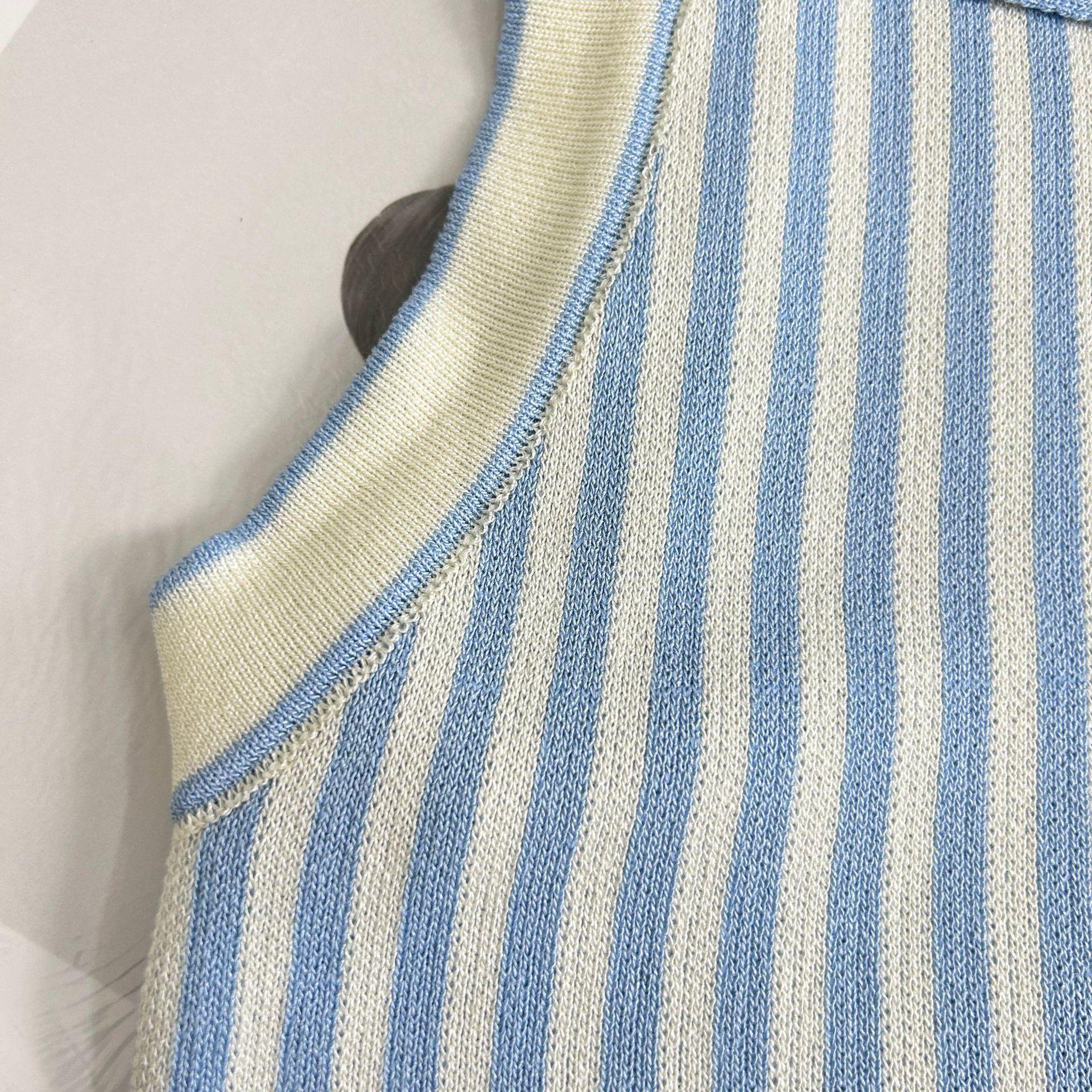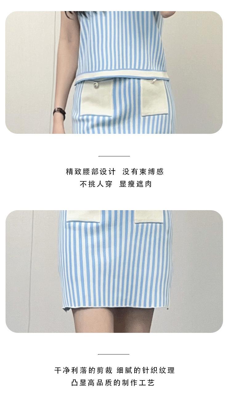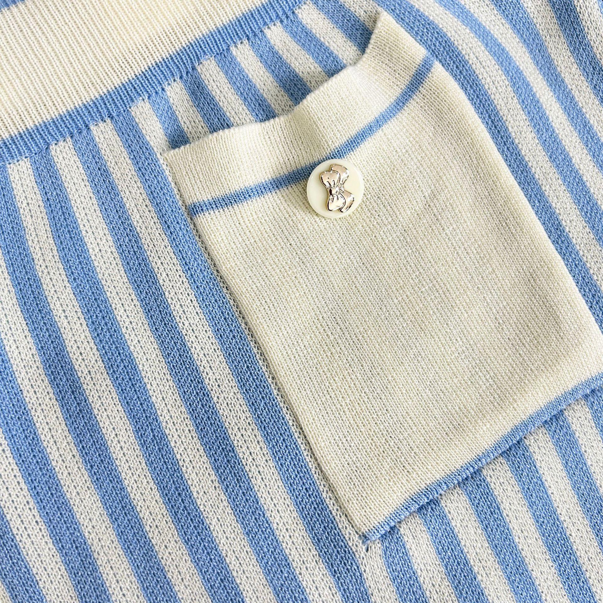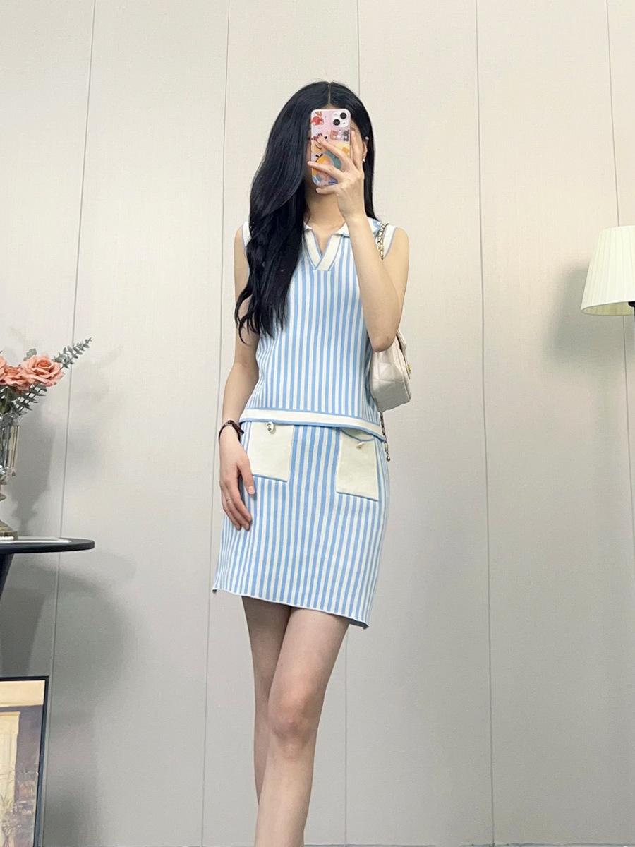 Traje de punto a rayas azules y blancas nuevo 2025 para mujer, fresco y rejuvenecedor, top sin mangas con solapa, falda, conjunto de dos piezas