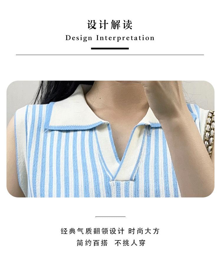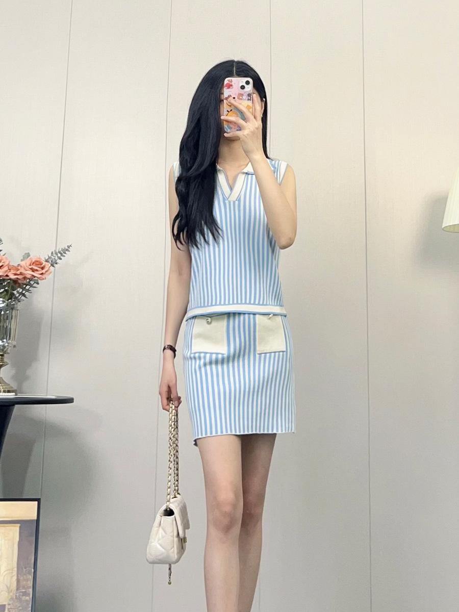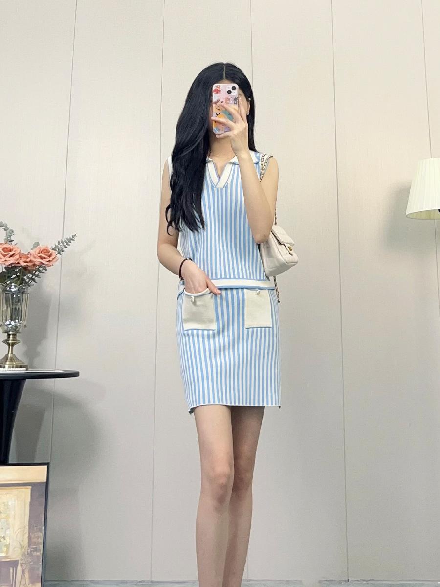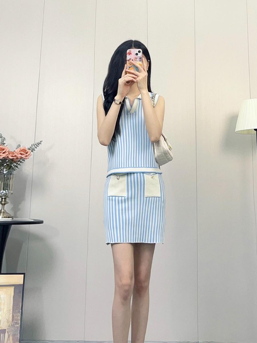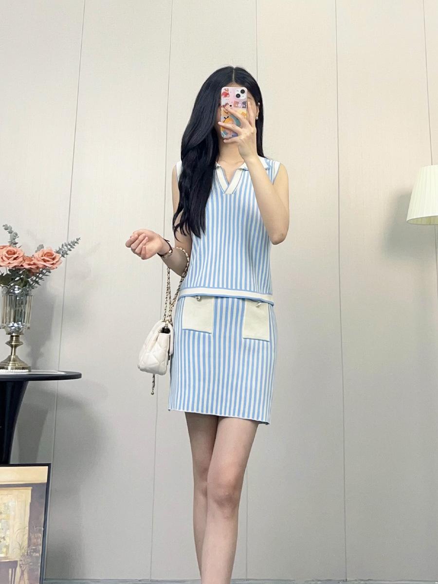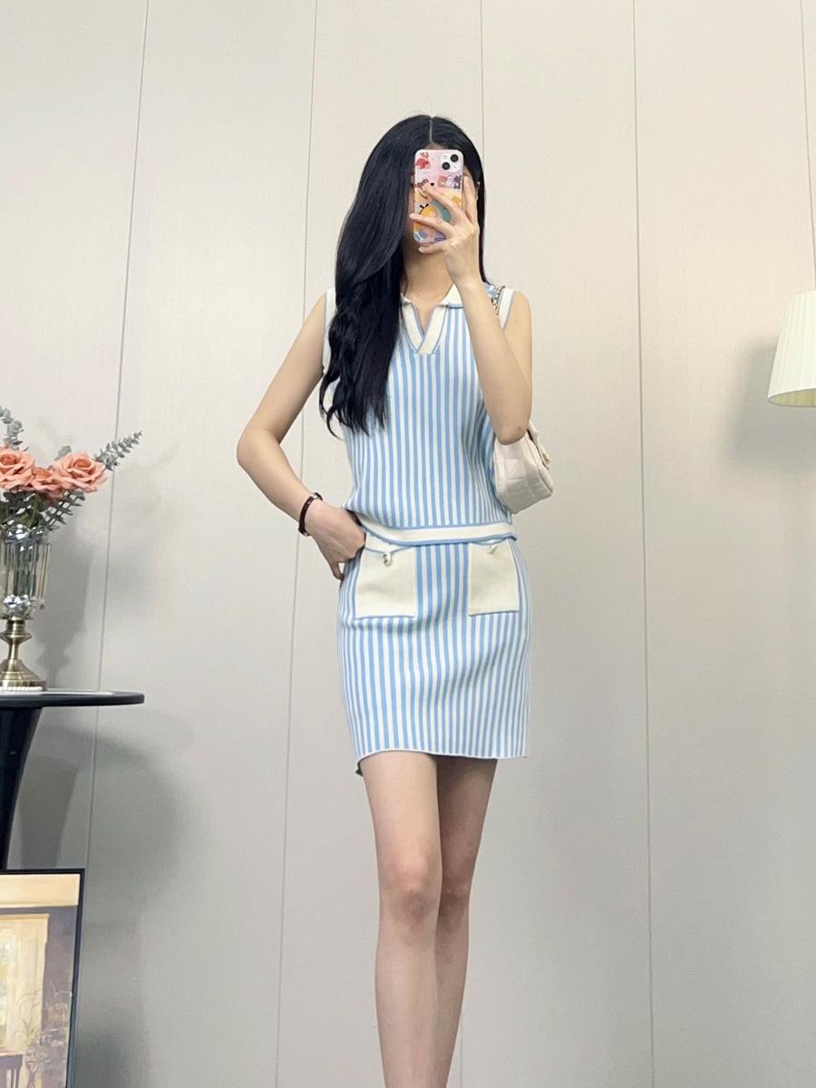 Traje de punto a rayas azules y blancas nuevo 2025 para mujer, fresco y rejuvenecedor, top sin mangas con solapa, falda, conjunto de dos piezas