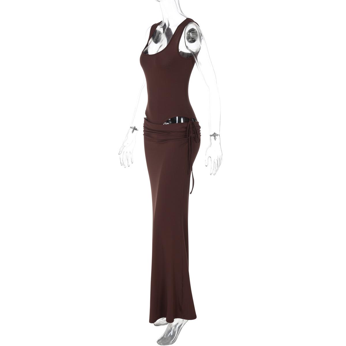 2025 Verano Nuevo Producto Mono Simple Elegante Color Puro Sin Mangas Mono Delgado con Tirantes Plisados Falda Larga Traje Europeo y Americano para Mujer