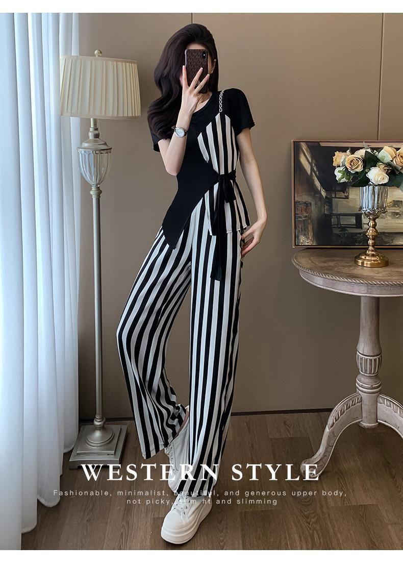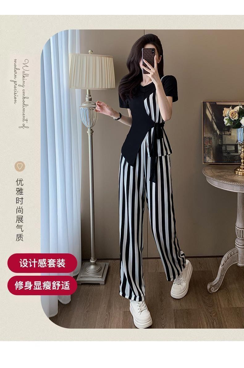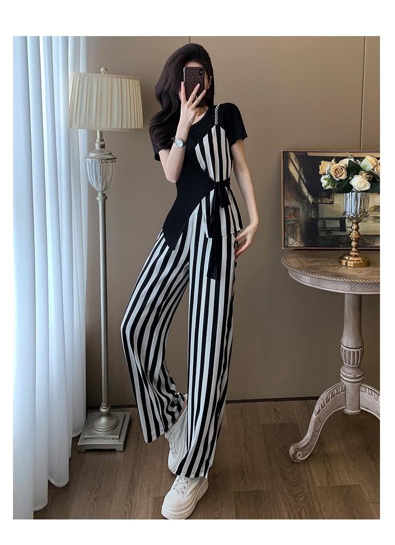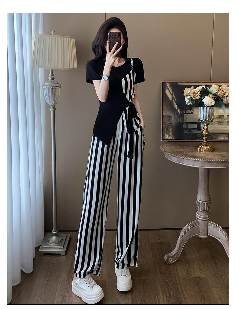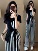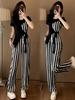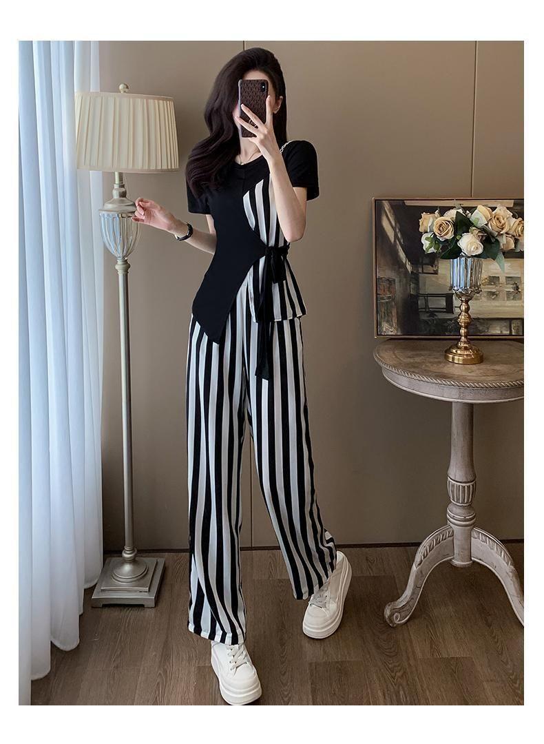 Traje de Moda Reductor de Edad para Mujer 2025 Estilo Verano Cómodo Casual Adelgazante Deportivo a Rayas Pantalón de Pierna Ancha Conjunto de Dos Piezas Moderno