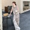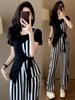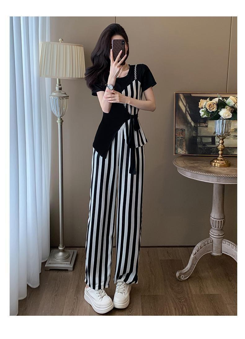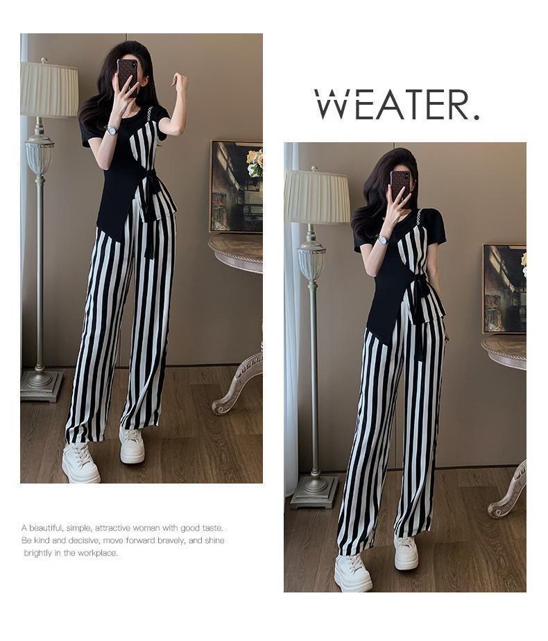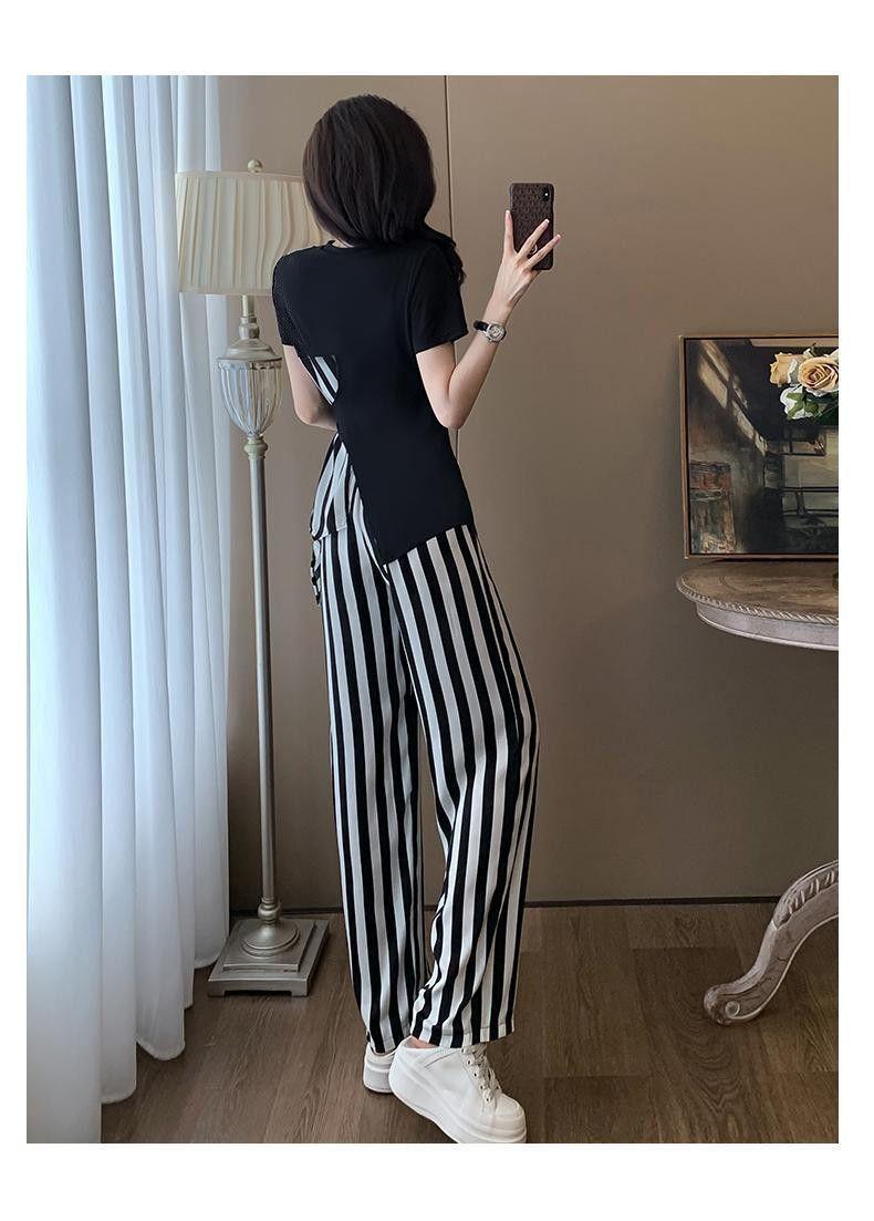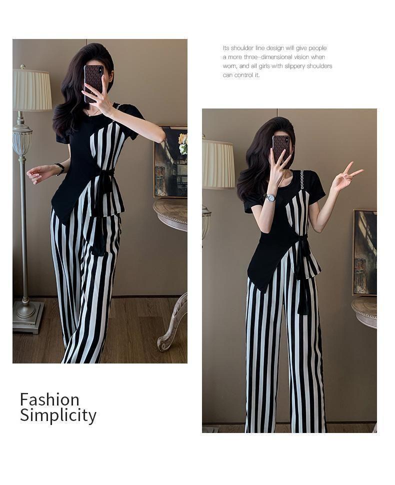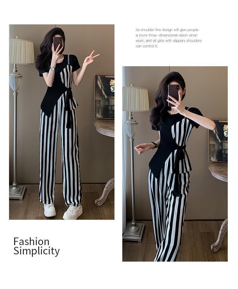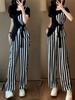 Traje de Moda Reductor de Edad para Mujer 2025 Estilo Verano Cómodo Casual Adelgazante Deportivo a Rayas Pantalón de Pierna Ancha Conjunto de Dos Piezas Moderno