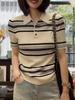 Polo Cuello Verano Nuevo Manga Corta Francés Delgado Seda Helada Rayado Hombro Derecho Manga Corta Camiseta Top