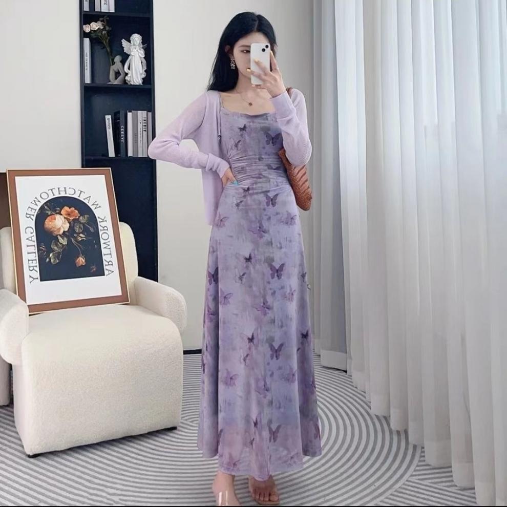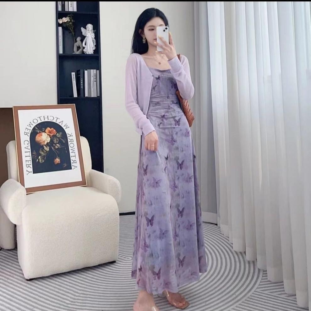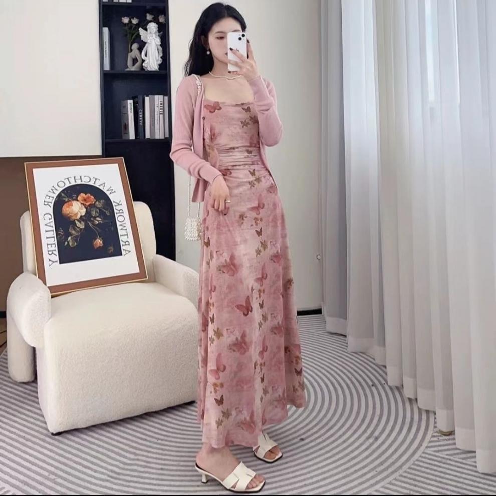 Vestido de Verano Francés Nuevo con Tirantes + Cárdigan Adelgazante Temperamento Conjunto de Dos Piezas Moda Sensación Fresca Traje Adelgazante