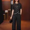 Conjunto Europeo Casual de Pantalones Rectos 2025 Nuevo Cuello Redondo Negro Top Estampado Personalizado de Dos Piezas para Mujer