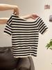 Estilo Coreano 2025 Primavera Nuevo Estilo Combinación de Colores Simple Cuello de Hombro Inclinado Botón Lateral Tejido de Punto de Manga Corta Top de Aspecto Adelgazante para Mujer