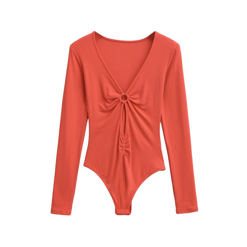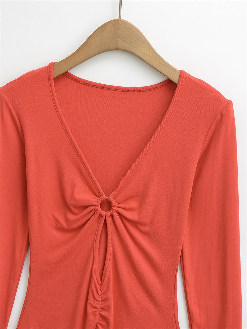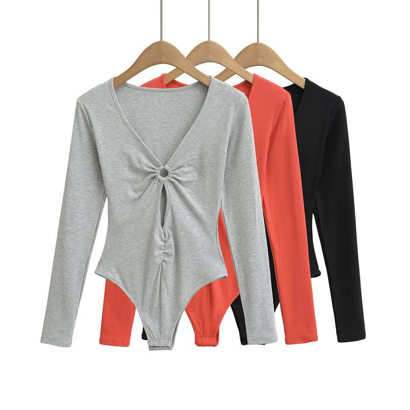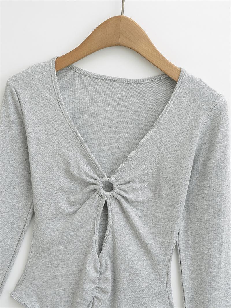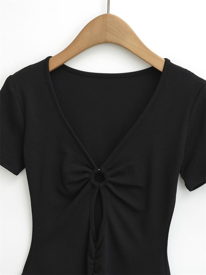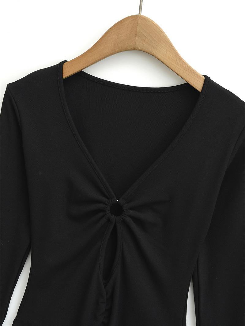 Estilo Europeo y Americano Sexy Escote Profundo en V de Corte Bajo Sentido del Diseño Top Calado Chica Picante Camiseta de Manga Larga Mono Fondo de Manga Corta para Mujer