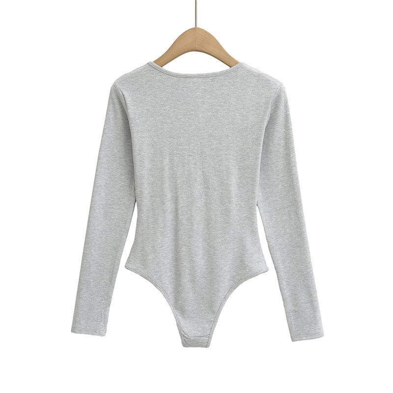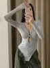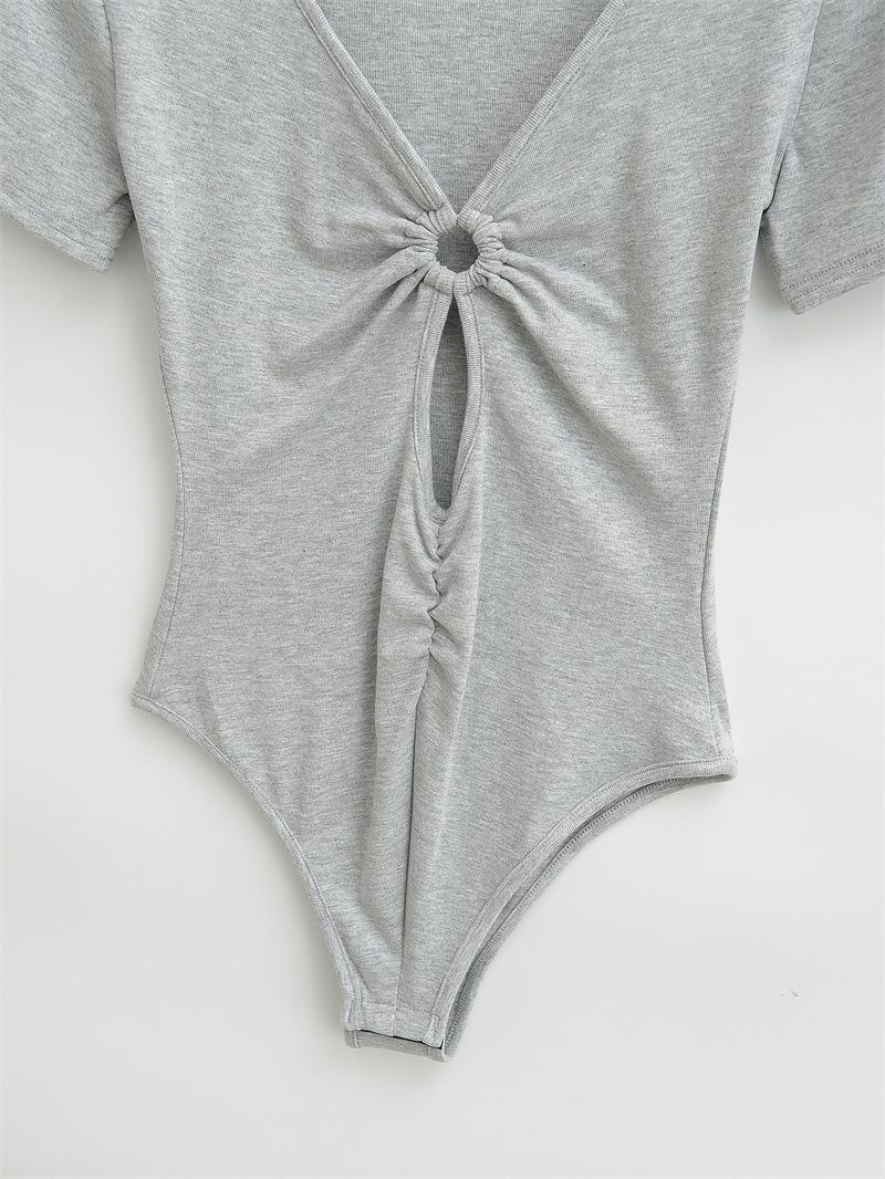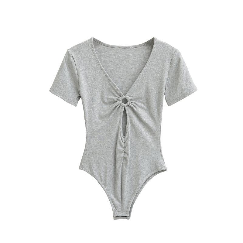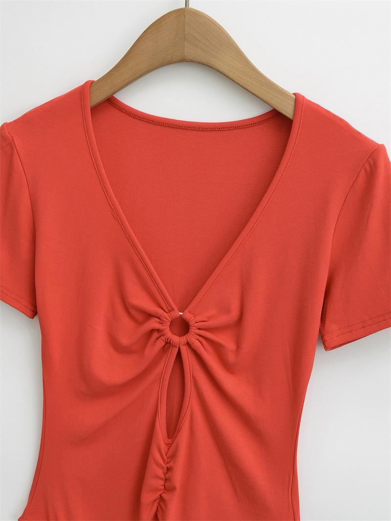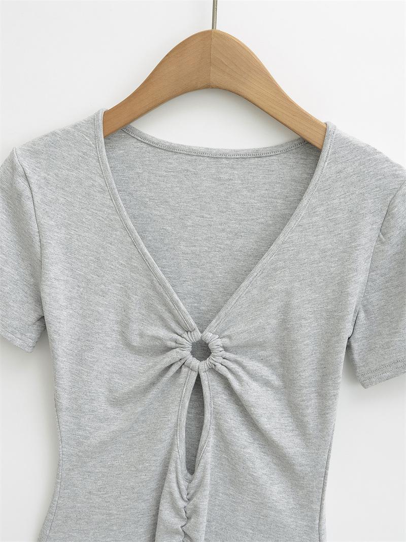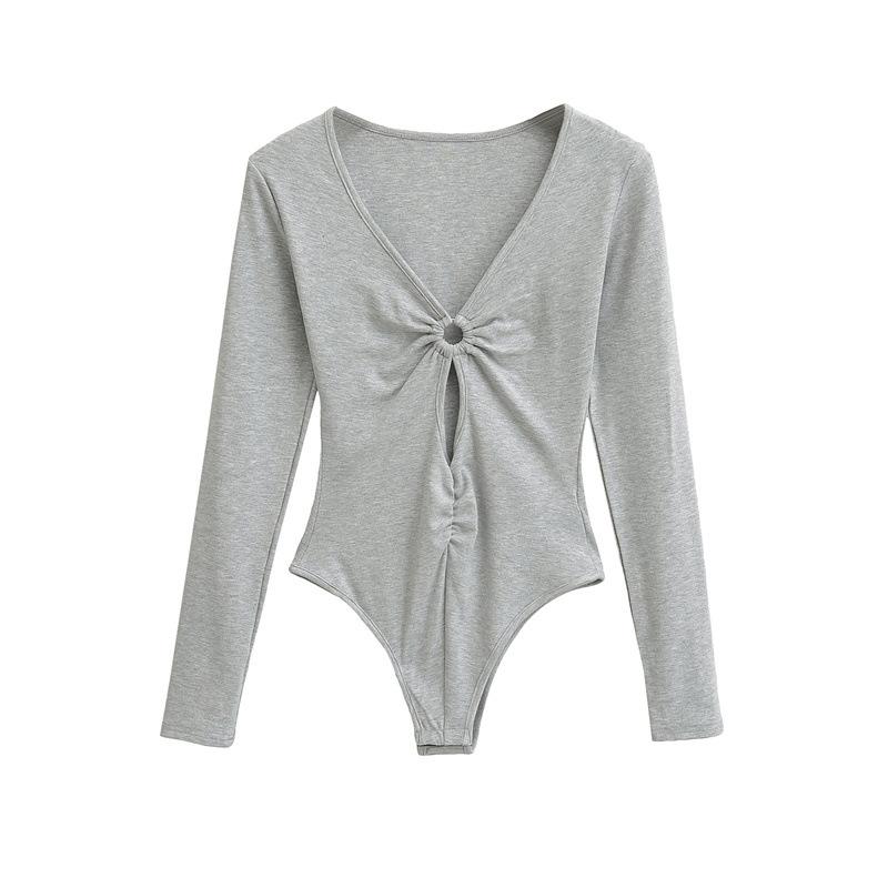 Estilo Europeo y Americano Sexy Escote Profundo en V de Corte Bajo Sentido del Diseño Top Calado Chica Picante Camiseta de Manga Larga Mono Fondo de Manga Corta para Mujer