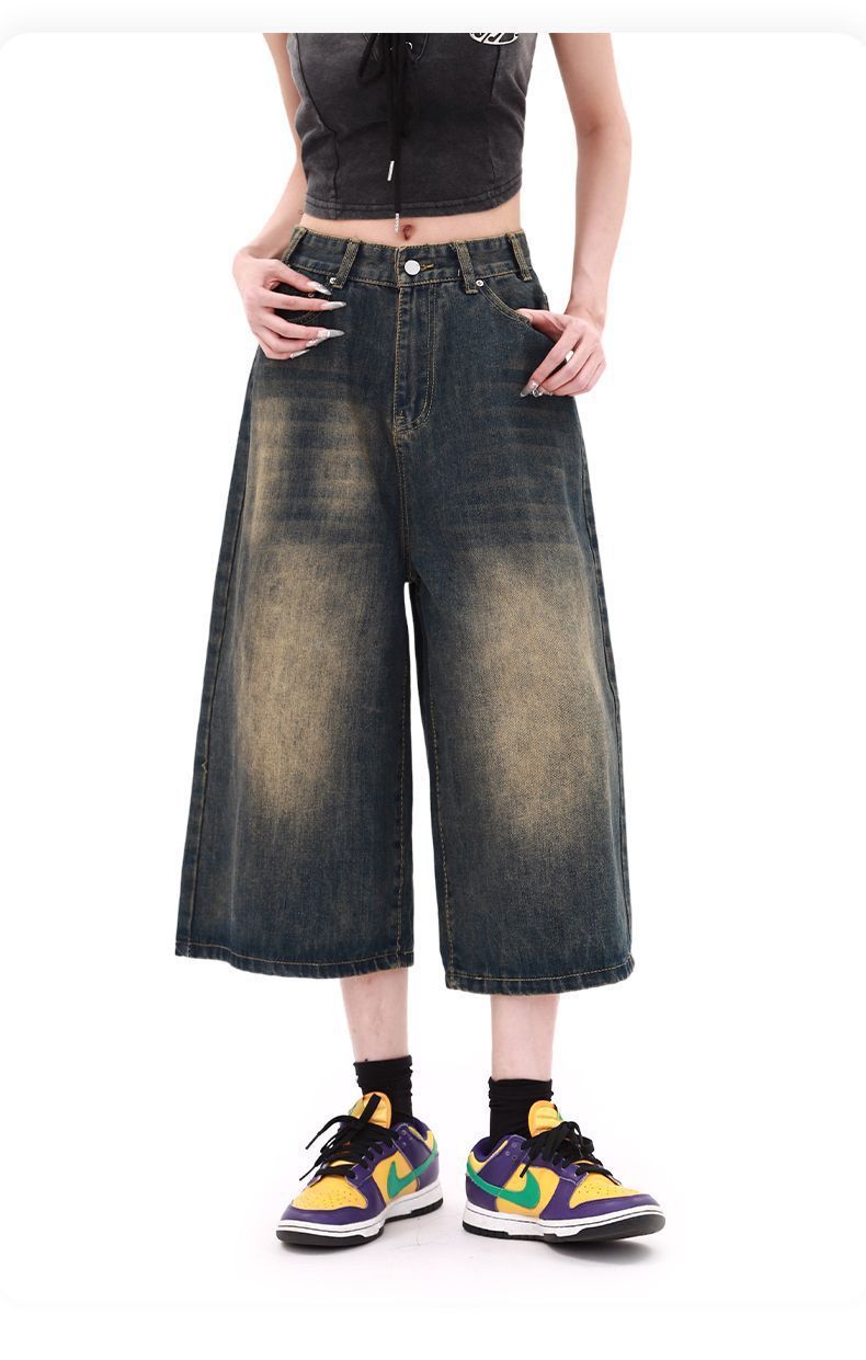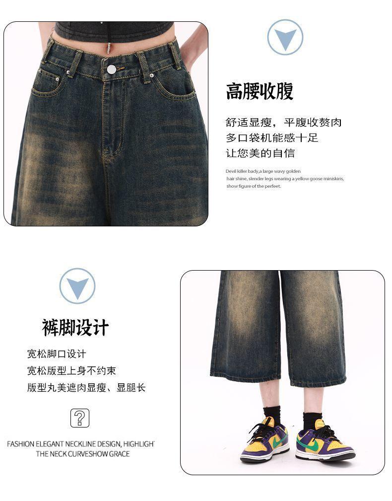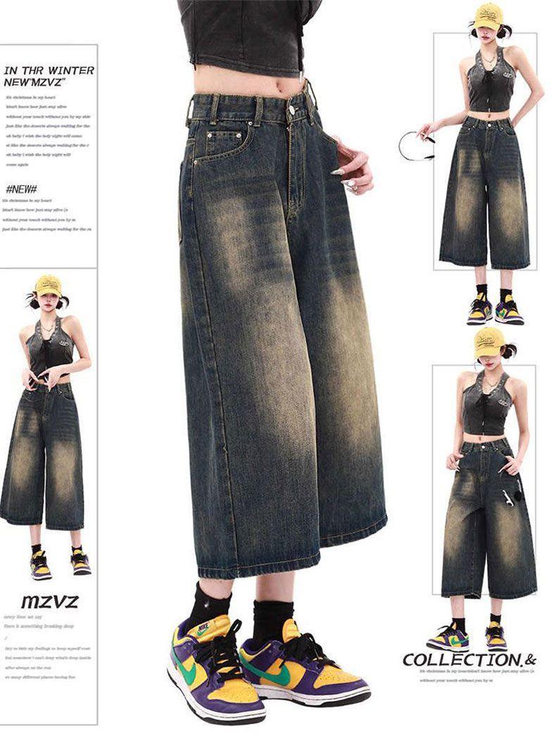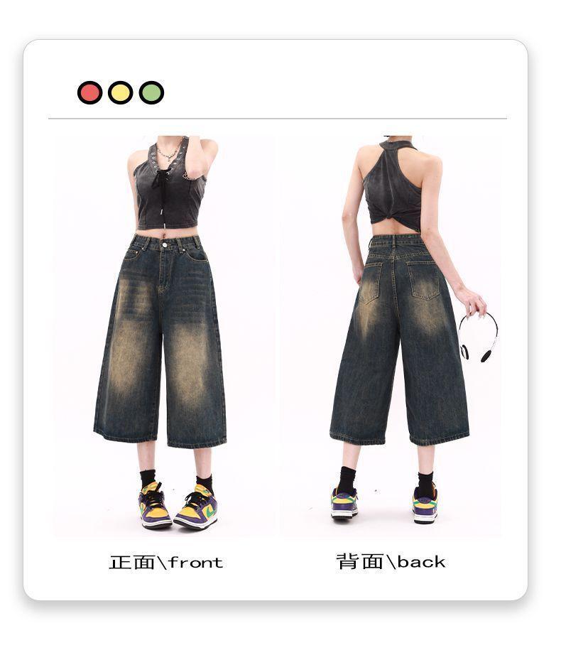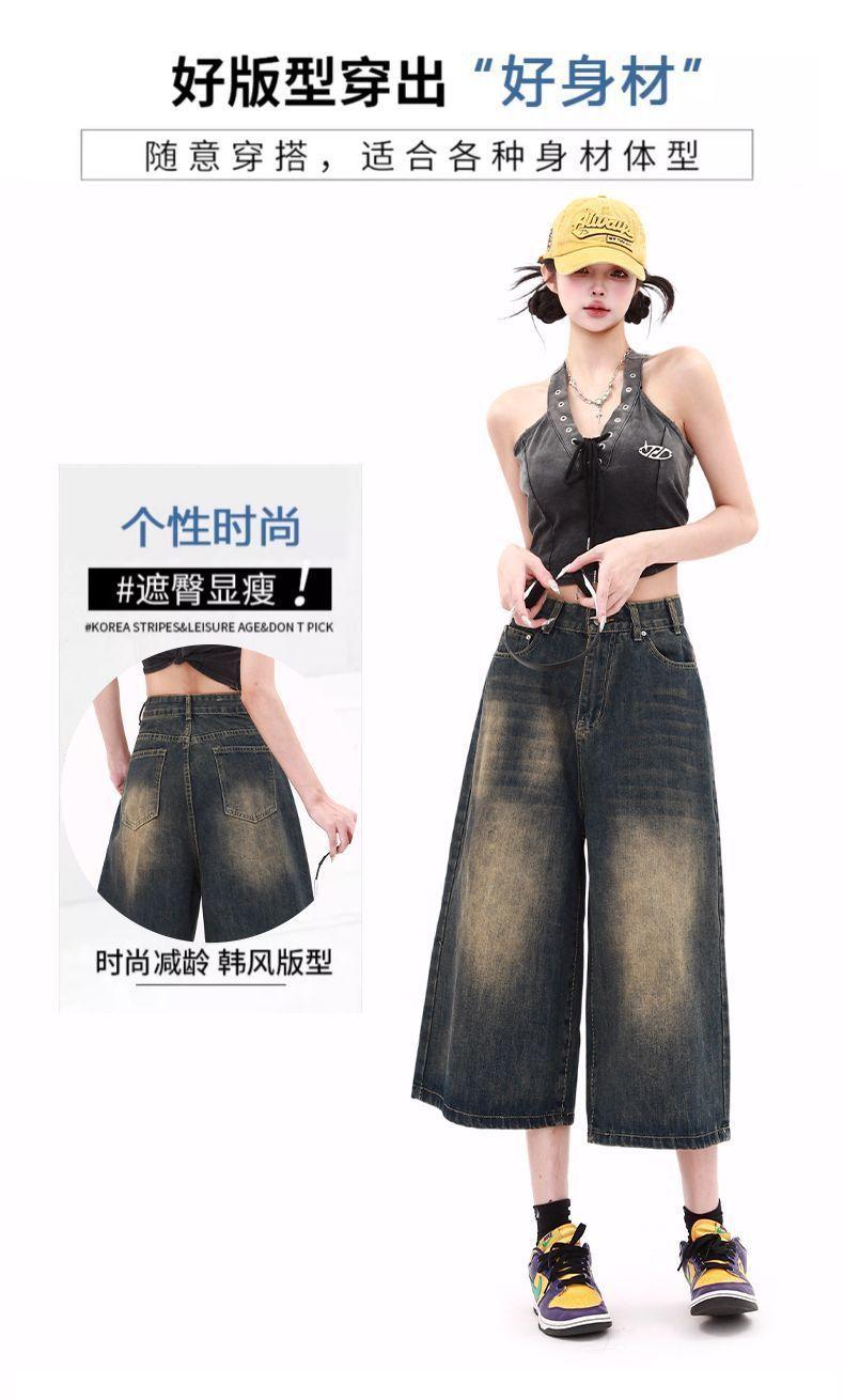 Shorts de mezclilla lavada de talle alto para mujer de talla grande estilo americano, casuales de verano, nuevos, de pierna recta, adelgazantes, de pierna ancha, cropped