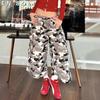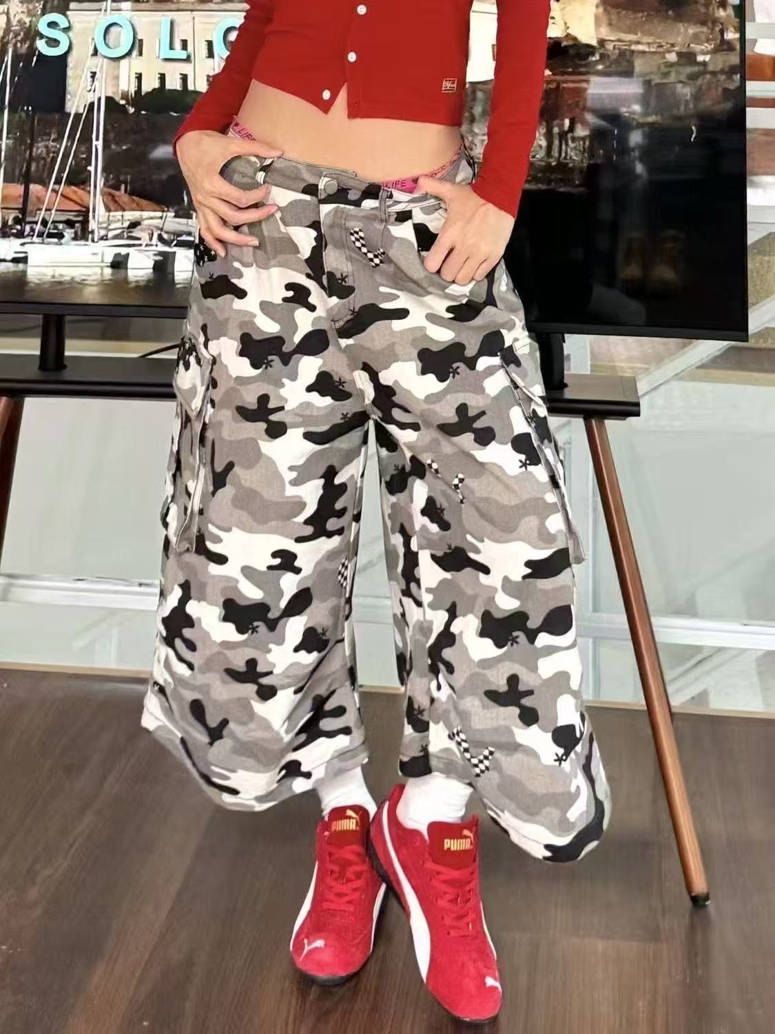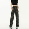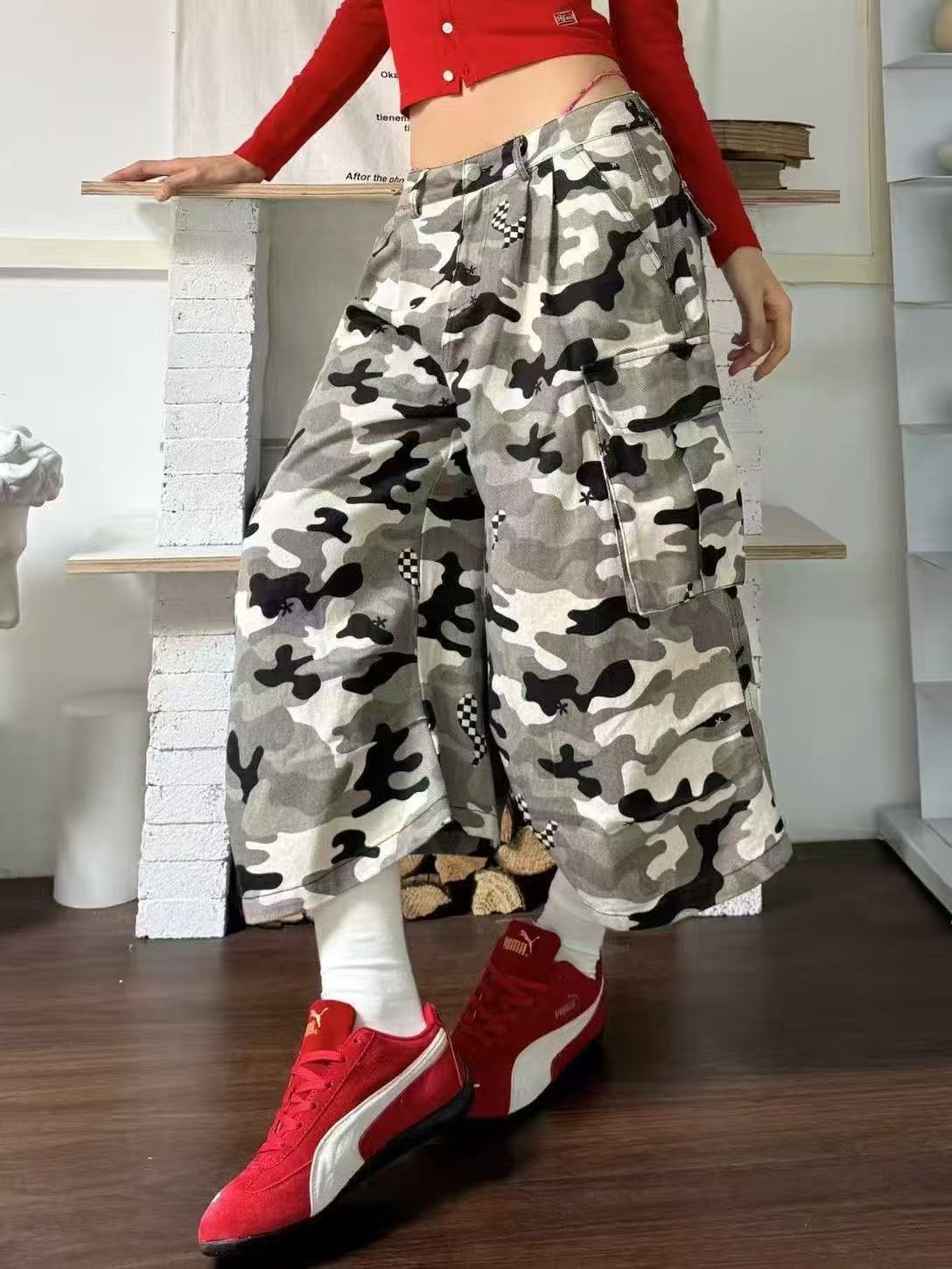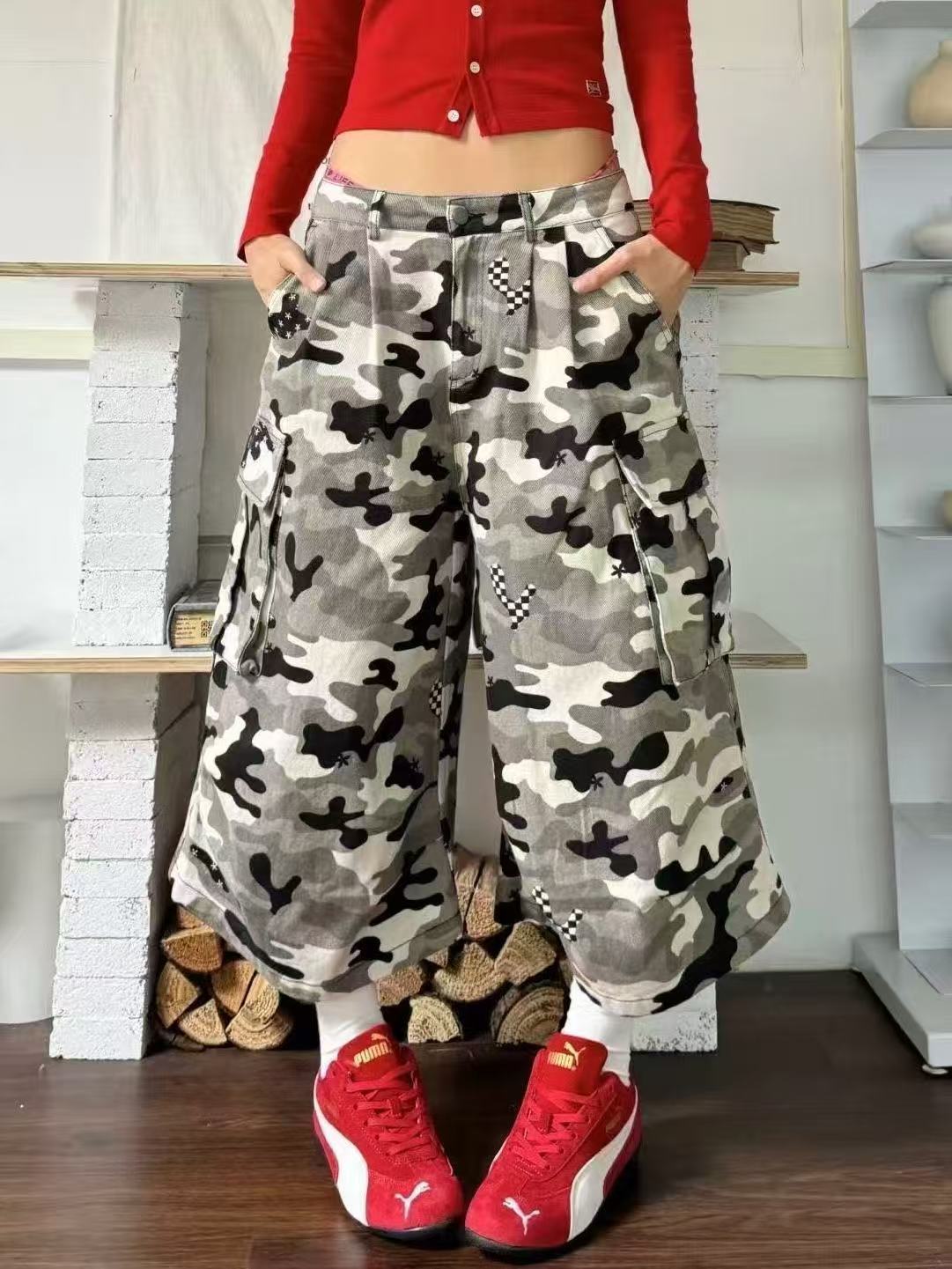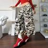 Pantalones Cargo de Mezclilla Cortos Americanos Retro Camuflaje Multibolsillos para Mujer, Verano Diseño Recto Holgado Pierna Ancha Modernos